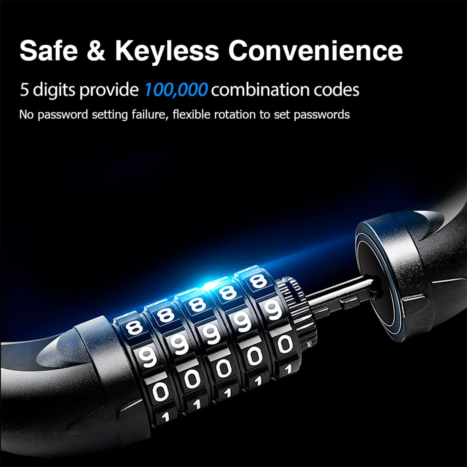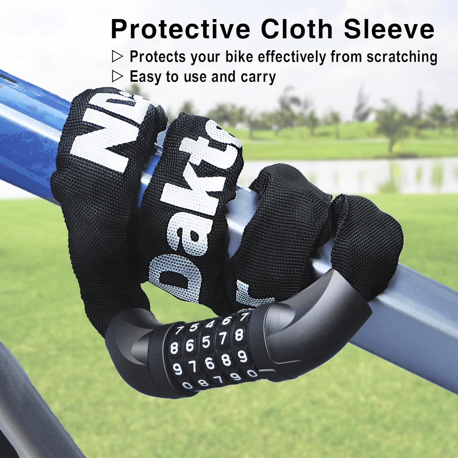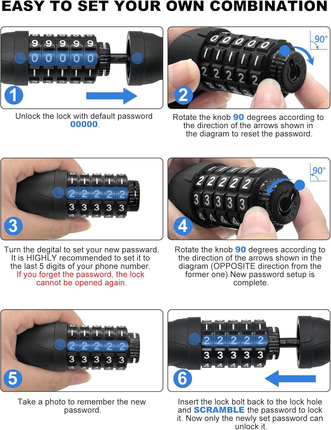 About this itemnSECURE & RESETTABLE: 5-digit resettable combination bike chain lock, much safer than other 4 digit locks. Easy to set your own personalized number combination.nSTURDY & DURABLE: It’s hard to break through as the lock cylinder of the bike lock is made of zinc alloy. The bicycle chain lock is made of 0.16 inch alloy steel which is drill-resistant and anti-tech unlocking..Safety tip: Please do not leave your bike out of your sight for too long, especially in high crime areas, no bike lock is 100% safe.nSCRATCH-PROOF FABRIC PROTECTION: The bicycle chain lock is wrapped by a high quality polypropylene fabric, which is scratch-proof and wear-resistant, anti-hot and anti-icing hands; it protects the chain and prevents it scratching your bicycle frame, long lifespan.nCONVENIENT TO USE: Combination locking mechanism provide keyless convenience and set your own password by easy steps. With keyless convenience lock, you dont worry about lost the key and forget to carry it.Code design saves you from the hassle of carrying keys. The code is resettable – there are 10,000 combinations you can set, which makes the chances to crack the code only 1/10,0000. The default code is 00000.nMULTI-PURPOSE: The chain lock is 3.2 feet, long enough to lock 1-3 bikes together, or lock your bike to a tree, gate, fence, railing, thick pole and others. The lock can also be used for motorcycles, scooters, skateboards, grills, ladders, doors, lawnmowers and many others. Safety tip: Please do not leave your bike out of your sight for too long, especially in high crime areas, no bike lock is 100% safe.nKINDLY REMINDER:The lock head’s diameter is around 1.25