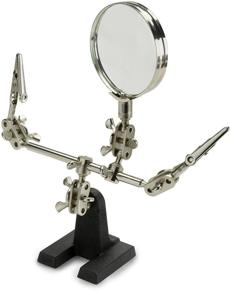 About this itemnHELPING HAND SOLDERING STATION: This helpful tool frees your hands for safe soldering, gluing, positioning, fastening, and assembly of objects small to large in size for tasks requiring a high level of precision, such as avionics.nMAGNIFYING GLASS WITH STAND: This soldering helping hand is equipped with a 2x magnifying glass on an adjustable arm to perform precision work on even the smallest of objects or workpieces. With this tool, you can achieve near-perfect results.nDUAL-CLIP STAND: Dual alligator spring clamps are attached to wire holders on adjustable arms that securely hold components, work pieces, small electronics, and appliances steady for soldering tasks that require accuracy and efficiency.nADJUSTABLE HELPING HAND: The mirror and clamps are mounted on adjustable ball joints to position and view work at any angle and to serve as extra hands to view objects at the most difficult angles with ease.nSOLDER STATION WITH HEAVY-DUTY BASE: The heavy-duty cast-iron base keeps the unit upright and stable and provides a secure hold that keeps objects steady while working on or soldering components. Perform even the finest work with this helpful tool.n See more product details