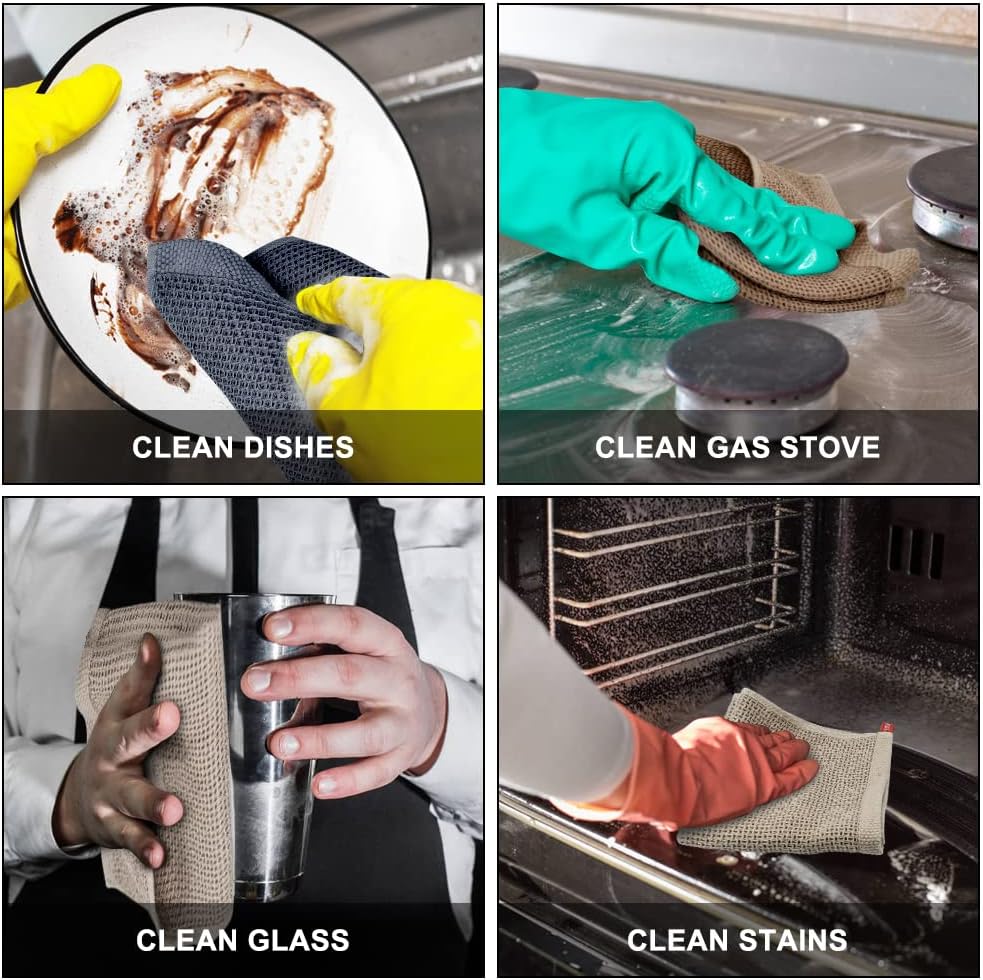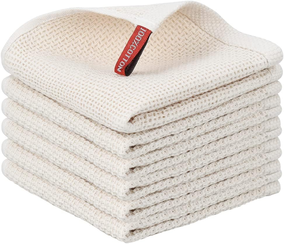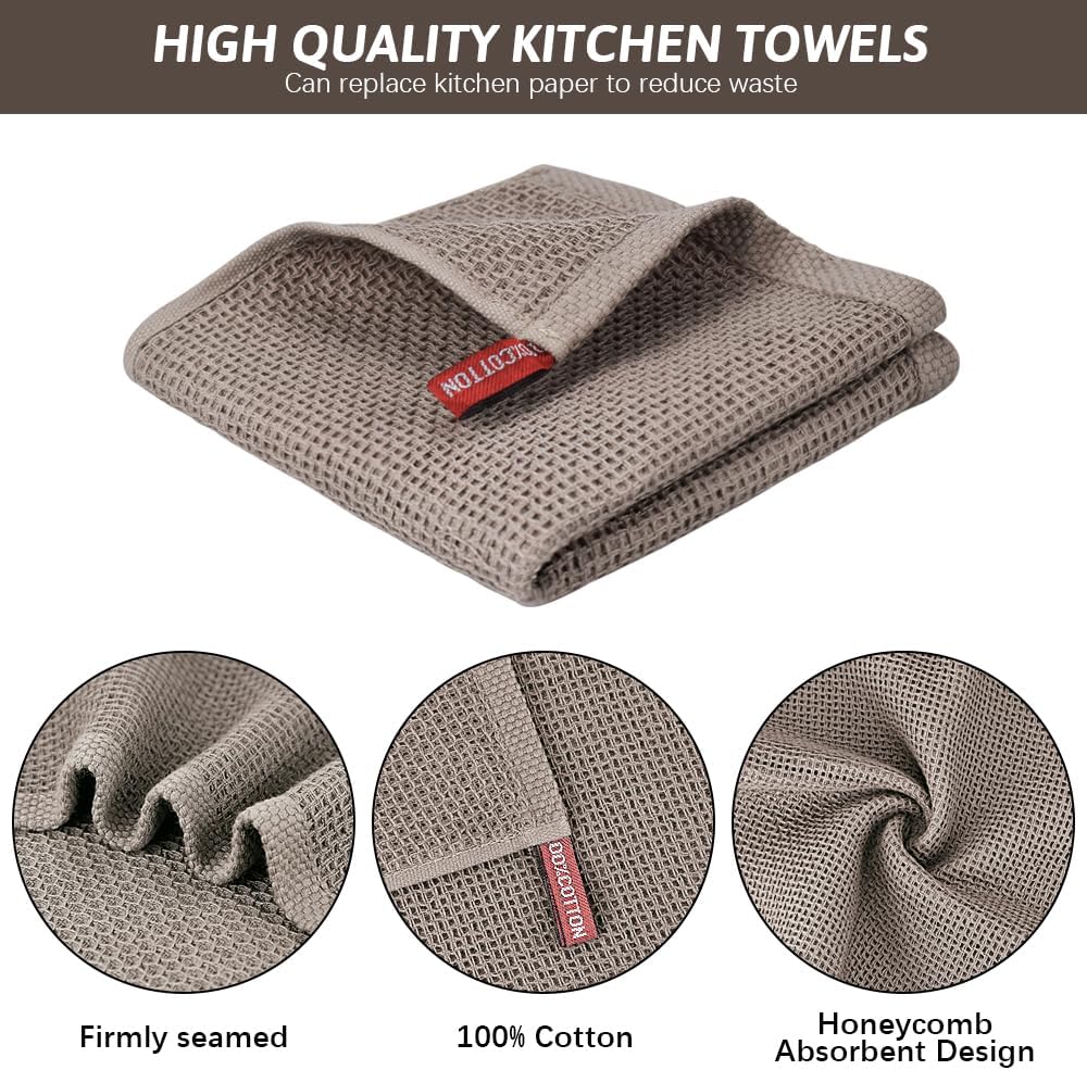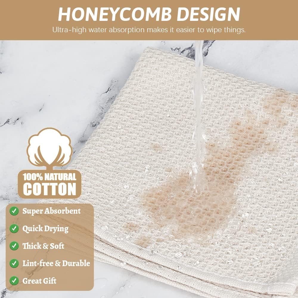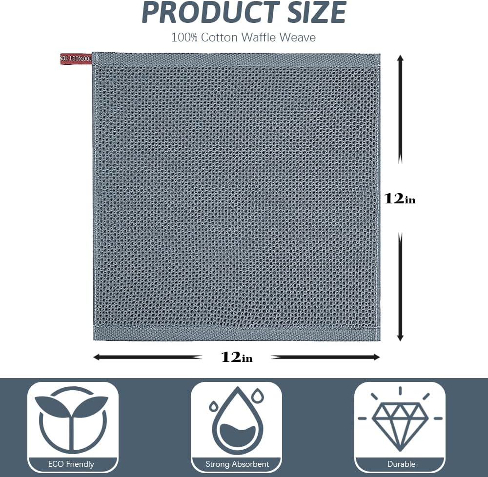 About this itemnKITCHEN DISH TOWEL: 100% cotton waffle weave dishcloths, absorbent quick dry and durable. The soft, skin-friendly material allows you to protect your hands while cleaning. This kitchen dish towels can replace kitchen paper to reduce waste.nUNIQUE DESIGN: The classic honeycomb fabric makes this set of dish cloth have better cleaning ability and water absorption. Kitchen towels shrink to unique honeycombsafter washing, exposing more surface area allows air to flow through the fabric so that it dries quickly and No bad smell. The hook design makes it easy to store and hang.nEASY CARE: Kitchen towels have better hemming technology makes it more durable, No tears or holes from the edges. In order to minimize shrinkage, please machine wash with cold water. Do not use bleach or fabric softeners as this will affect the longevity and absorbency of the towels.nMULTIFUNCTIONAL: Our Kitchen towels perfect thickness for drying dishes and cleaning kitchen jobs, Its so easy to remove dust, dirt, stain, grease. They are helping you handle housework quickly and efficiently.nBEST GIFT CHOICE: The dishcloths sets are great housewarming gifts for new home, Christmas, Thanksgiving day, family gatherings, mother’s day. Great idea for someone love cooking, Dish Towels for Drying Dishes make the kitchen bright and clean.It won’t leave any lint behind.