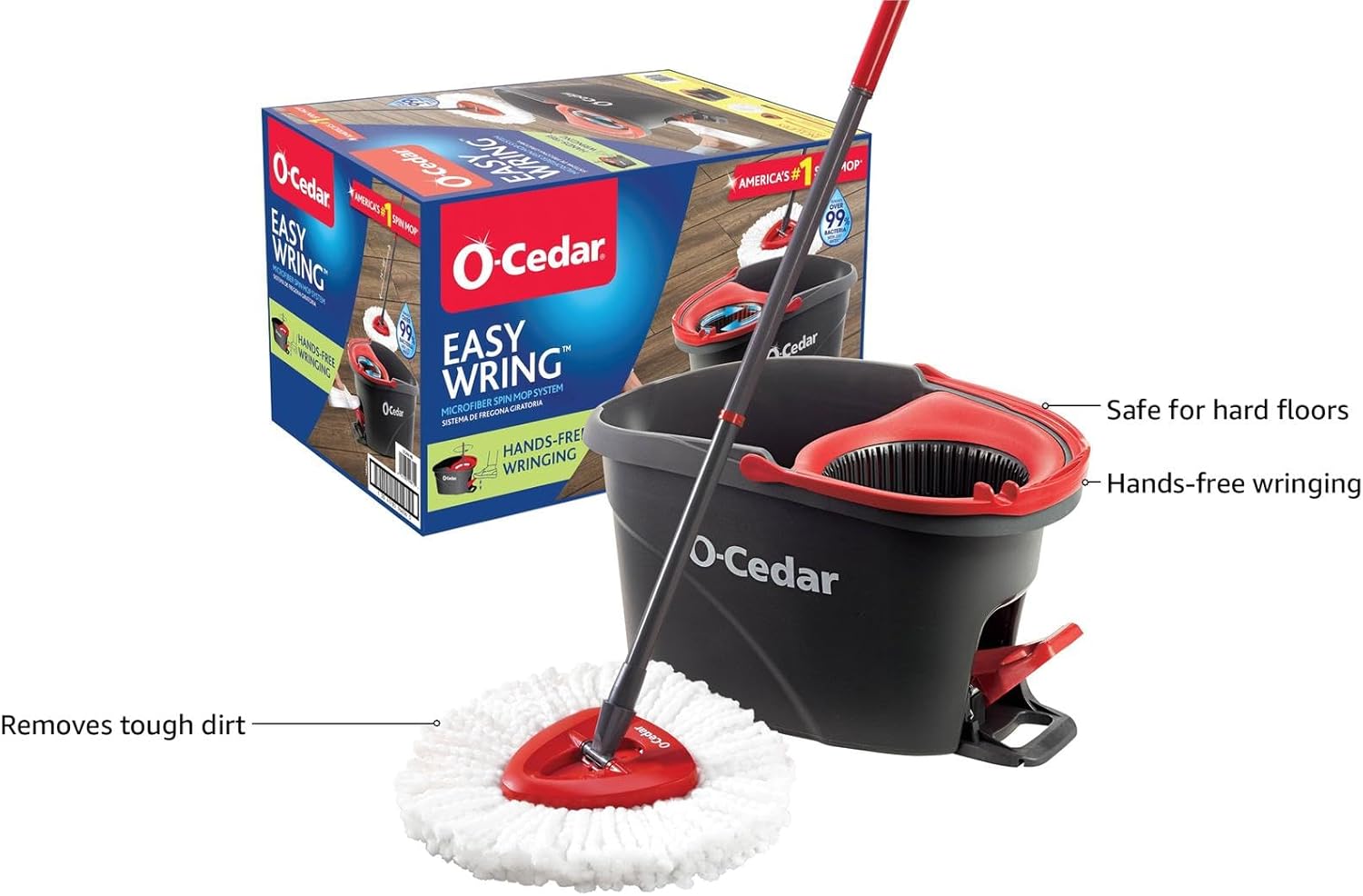 About this itemnHANDS-FREE WRINGING: Our exclusive mop bucket design features a built-in wringer that allows for hands-free wringing while Splash Guard keeps water splash and spray inside the bucket when wringing or when transporting the bucket from room to roomnMACHINE WASHABLE: The EasyWring Microfiber Mop Head is machine-washable and reusable! We recommend replacing the mop head refill every 3 months for optimal floor cleaning resultsnDEEP CLEANING MICROFIBER: O-Cedar’s EasyWring Microfiber Spin Mop & Bucket Floor Cleaning System uses millions of strands of advanced microfiber to effectively capture dirt and grime with just plain water, eliminating the need for harsh chemicals. Safe for all hard flooring, including finished hardwood, wood, laminate, tile, vinyl and more.nREACHES IN CORNERS: Due to the patented triangle mop-head and ability to rotate 360 degrees, the EasyWring Mop can reach and clean deep into corners, under furniture, alongside baseboards, and between tile.n1 REFILL = 3 MONTHS OF CLEANING: This offer includes 1 EasyWring Refill, and each EasyWring Microfiber Refill lasts up to 3 months! Save time and money with longer-lasting mop head replacementsnHANDLE EXTENDS FULLY TO 48 INCHES: With a telescopic handle that extends up to 48 inches, anyone can mop comfortably without bending overnCLEAN BETTER WITH A MICROFIBER MOP: Our streak-free microfiber mops easily attracts and locks in dirt, dust, pet hair, grime, dried-on or sticky messes better than a traditional cotton wet mop. It can be used wet or dry for mopping or dusting. Do not wash with fabric softeners or bleach. Multi-purpose microfiber mop removes over 99% of bacteria with water.nSystem includes EasyWring bucket, telescopic handle that adjusts to 4.25 ft (51 inches) and microfiber mop head