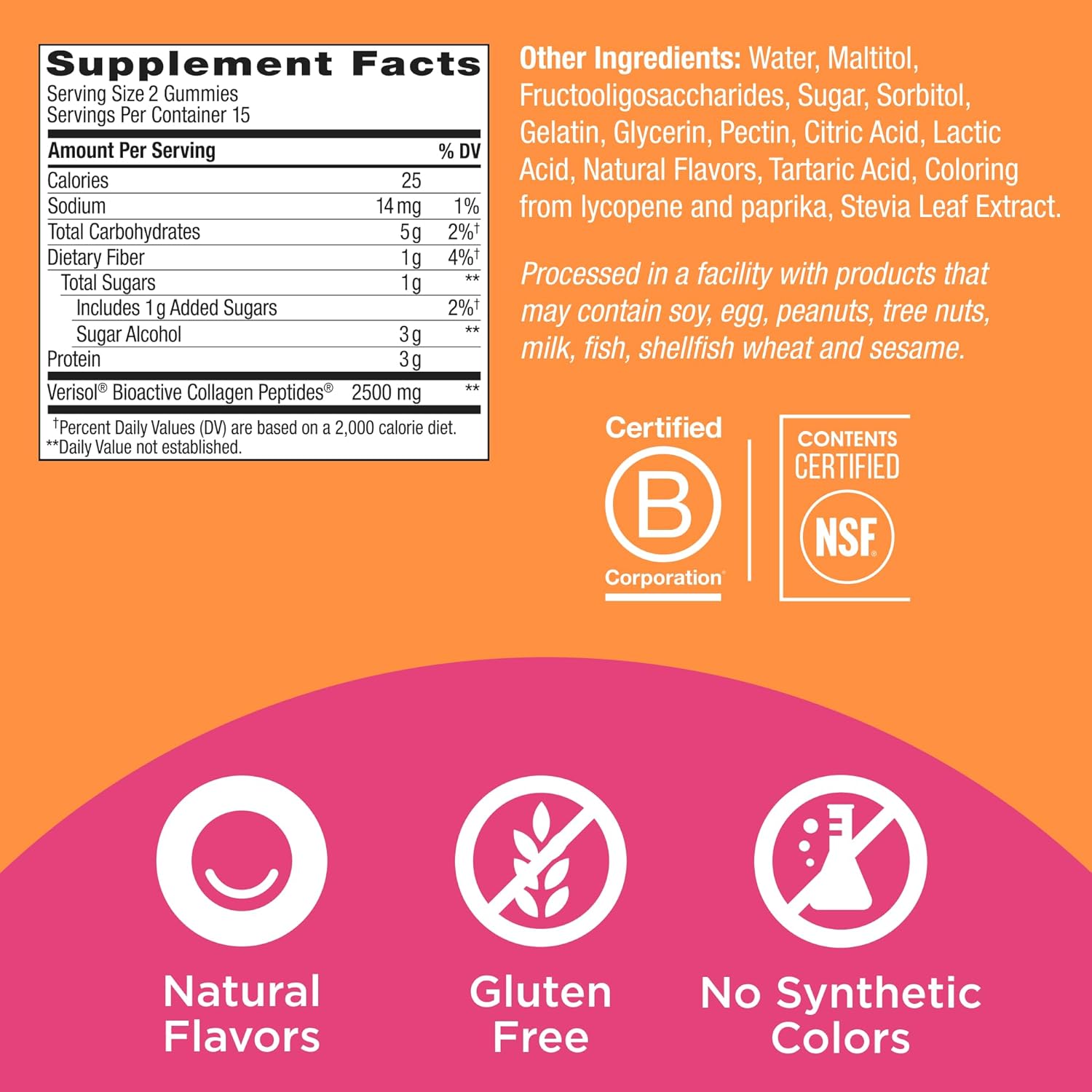 About this itemnOLLY COLLAGEN GUMMY RINGS: Cue the compliments ; These delicious gummy rings are packed with collagen—a beauty superstar that’s essential for that youthful glow ; It nourishes your skin on a deep level to improve firmness and resiliencynProduct Note: Exposure to heat or sunlight may lead to melting/damage of the product ; Hence customers are expected to be available during the product deliverynTHE GOODS INSIDE: Collagen Gummy Rings deliver a clinically-tested dose (2.5 grams) of Bioactive Collagen Peptides ; They’ve been shown to support collagen production, boost skin elasticity and reduce the appearance of worrisome wrinkles in as little as 4 weeksnHOW TO TAKE: Chew two gummies, no food or water needednNATURALLY DELICIOUS: Naturally flavored Peach Bellini with no artificial colors or flavors and are gluten free. 30 gummies per bottle (15 day supply)nMIX AND MATCH: Delightful and delicious OLLY products can be taken together—mix and match as you please