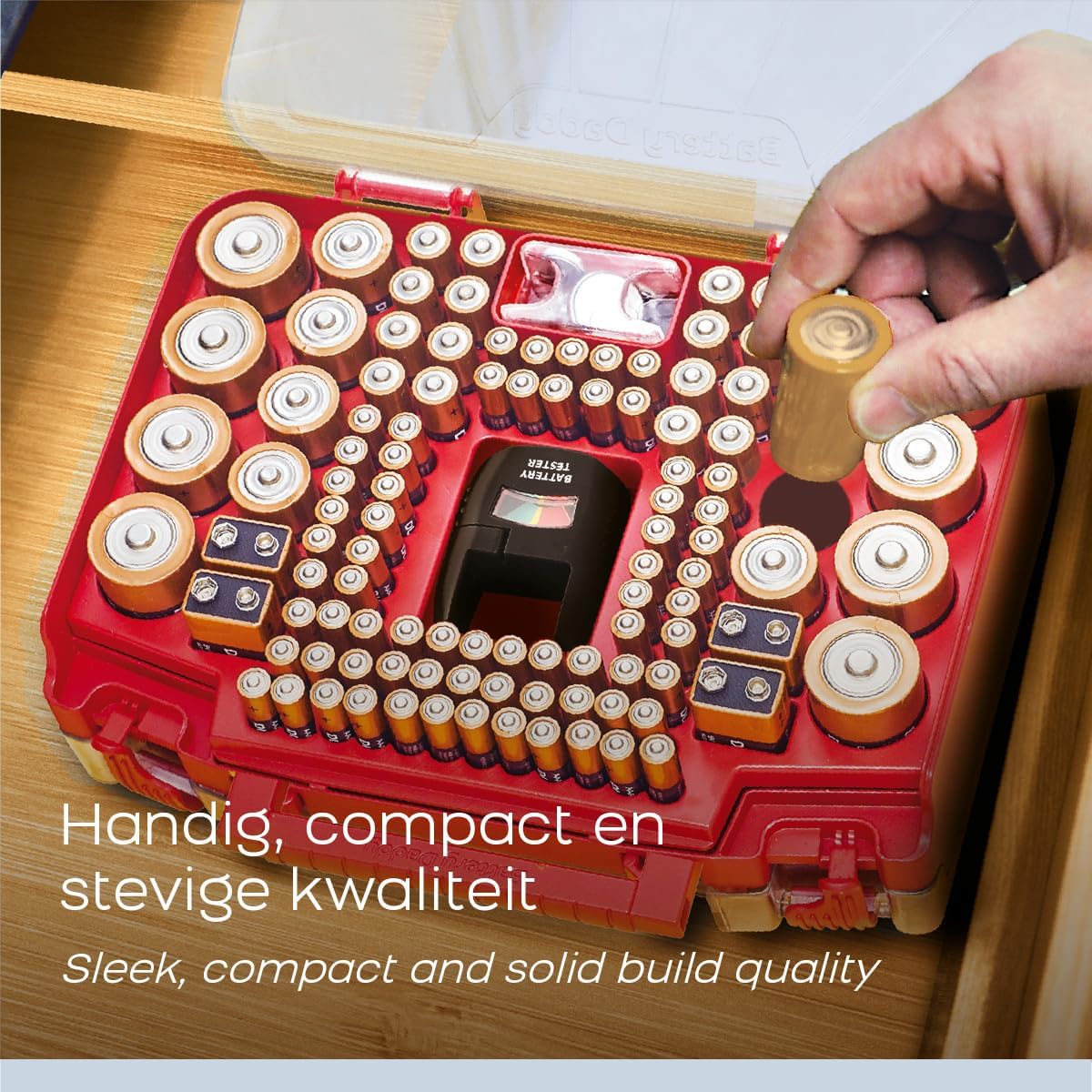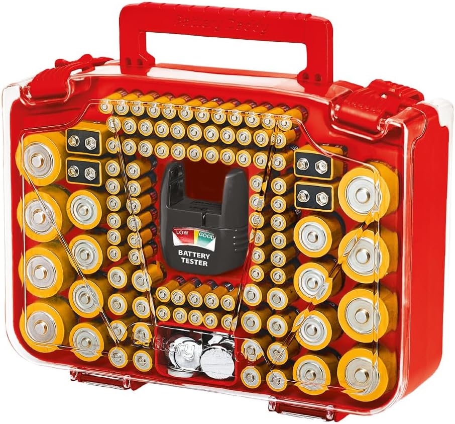 About this itemnDouble-Sided Battery Organizer: The Ontel Battery Daddy is a compact & portable way to organize, store and protect a boatload of batteries! Clear ‘Easy View’ cover lets you see everything at a glance and prevent any unwanted contact.nSleek and Compact Design: Battery Daddy uses both sides to store up to 150 batteries of all types. Holds 58 AAs, 68 AAAs, (4) 9 Volt, 8 Cs, 8 Ds, & 8 Button Cells. Easily stores away in any drawer. Includes Battery TesternFind the Right Battery: Incorrect storage drains batteries. Stay organized and be prepared for power outages, new gifts, or any time you need to replace a dead battery. Built-in carrying handle lets you take it anywherenBattery Tester Included: Battery Daddy comes with a tester that can check whether your single-use or rechargable batteries are still good. Just align the negatives and positives of the batteries on the tester and you can see the result on the indicatornEasy Storage: The compact size allows for storage in drawers and shelves along with your other supplies and household items. The portable design has a sturdy carrying handle and secure heavy-duty latches so you can easily transport