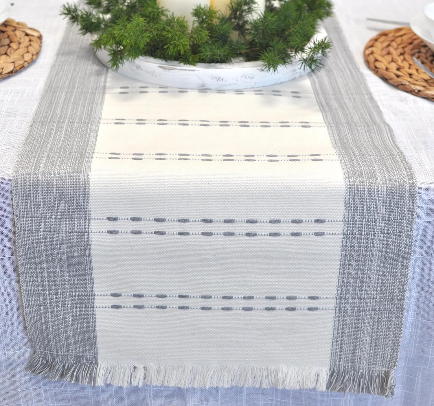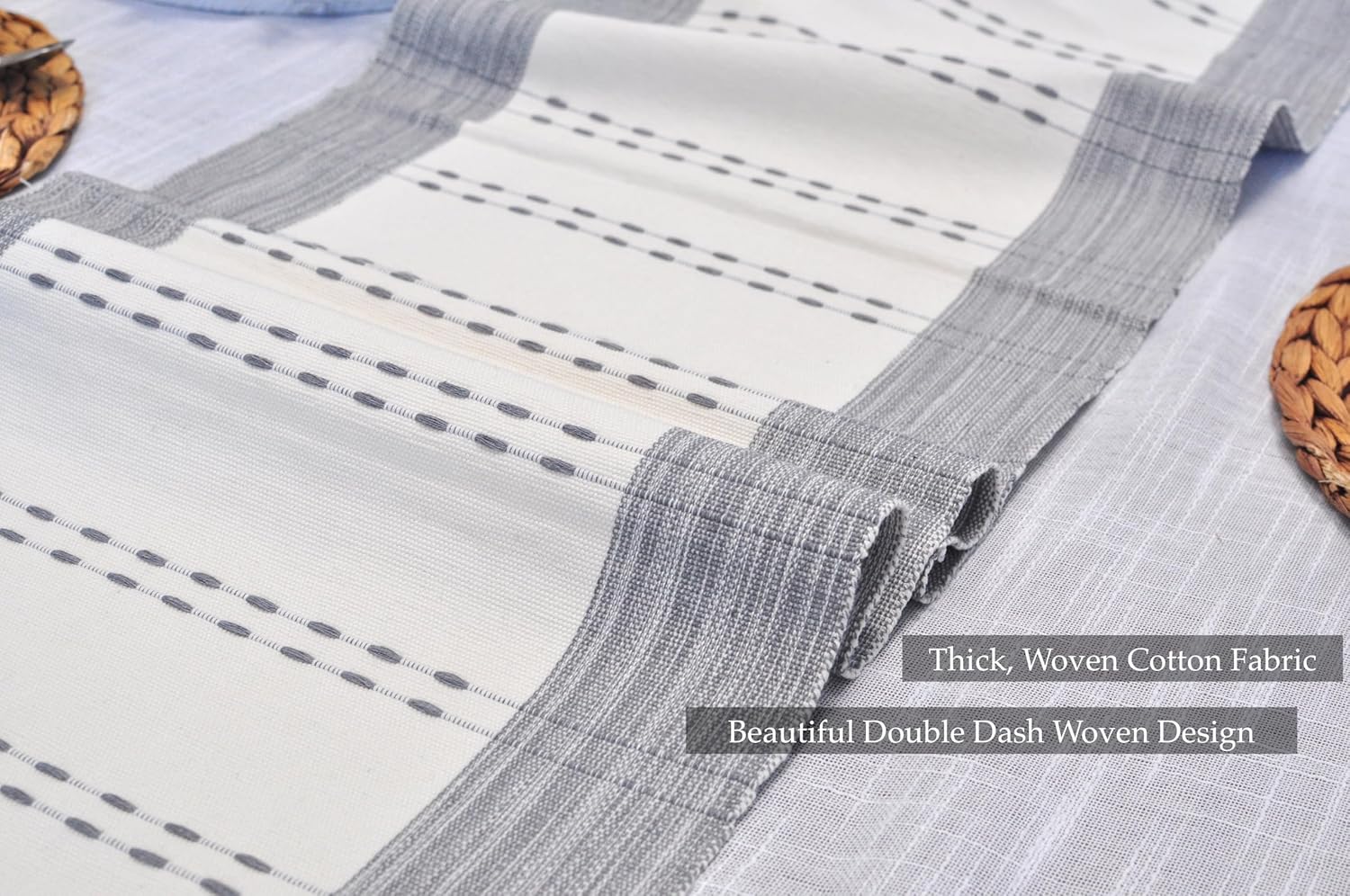 About this itemnPremium Organic Cotton Fabric: Made from 100% organic cotton (GOTS Certified) , our all natural table runner offers natural feel, ensuring high durability and sustainability, healthier option for your familynWoven Textured Fabric : The elegant Ombre texture cotton slub fabric combined with elegant decorative intricate woven dash lines & chambray pattern adds a moden touch of sophistication and elegance to your home decor.nPerfect for Various Settings: Suitable for dining tables, console tables, buffet tables, sideboards, kitchen islands, entry table, chest dressers, nightstands, and even as a small bedside tablecloth or bureau scarf set.nThis luxurious table runner is perfect for a variety of uses, including as a table overlay, table scarf, table strip, table sash, and center table cloth.nMachine Washable: Easy to clean and maintain, this table runner is machine washable in cold water only and air dry , making it convenient for daily use as well as special occasions like holidays, parties, and weddings. Wash in cold water only, no tumble or heat dry. Choose air dry option only (Avoid using hot water & Heat drying ti prevent shrinkage of fabric)
