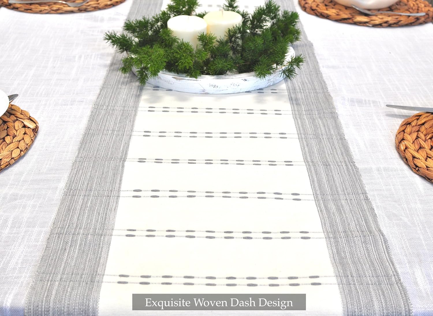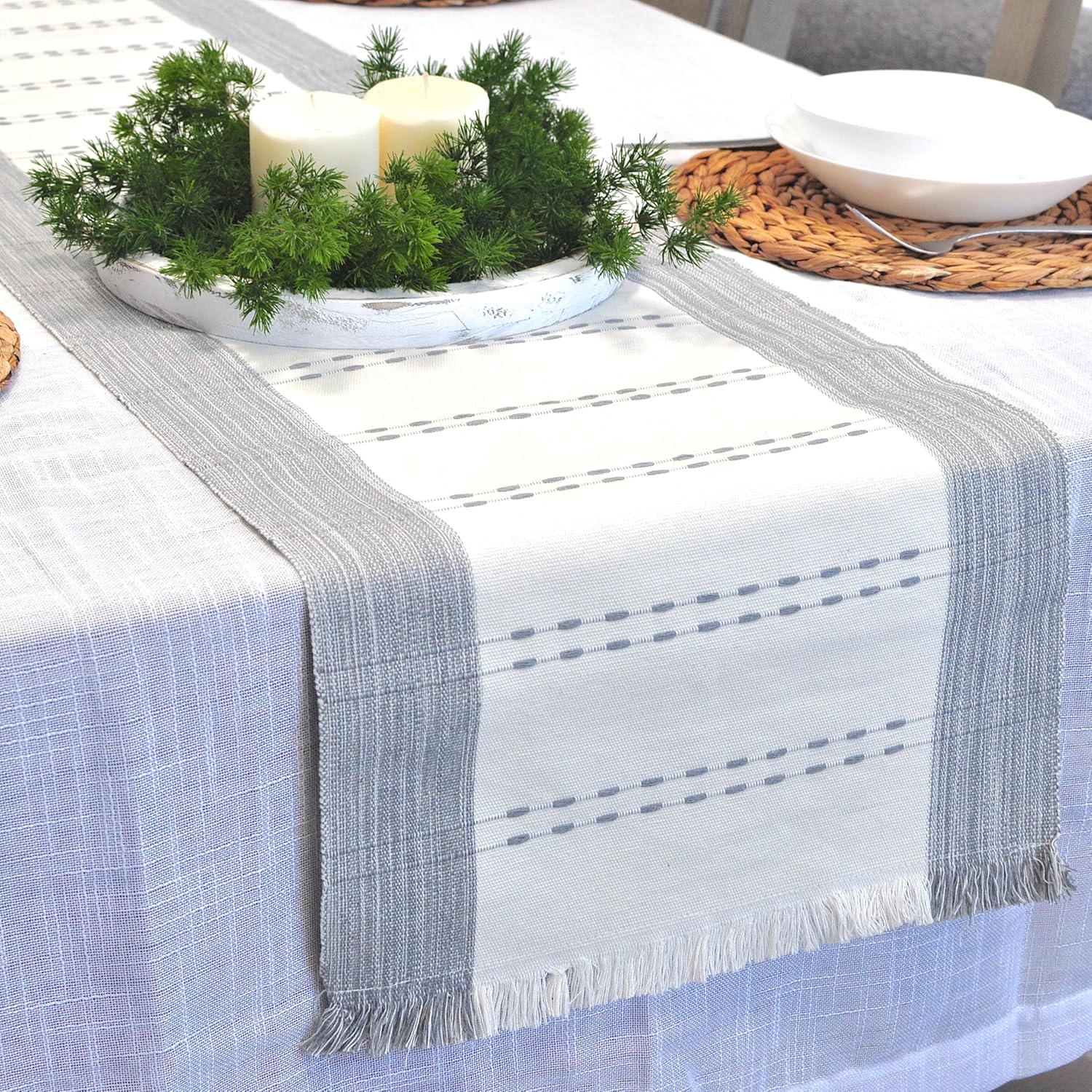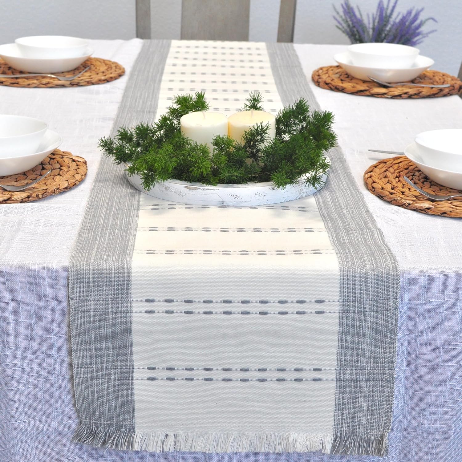 Organic Cotton Woven Stripe Table Runner with Fringe Rustic Farmhouse Cloth Dining Table Runner for Kitchen Buffet Table Boho Dresser Scarf Non Slip Washable Ombre Texture Grey / Off White 14