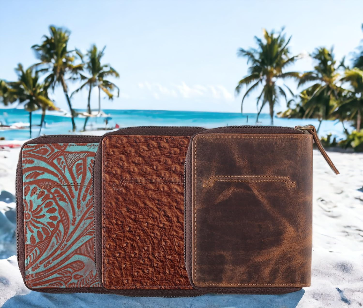 Passport Wallet – Travel Document Holder w/RFID Blocking Full Grain Leather Bifold compact zip around Wallet with Credit Card Slots for Women and Men,Turquoise floral,500-50