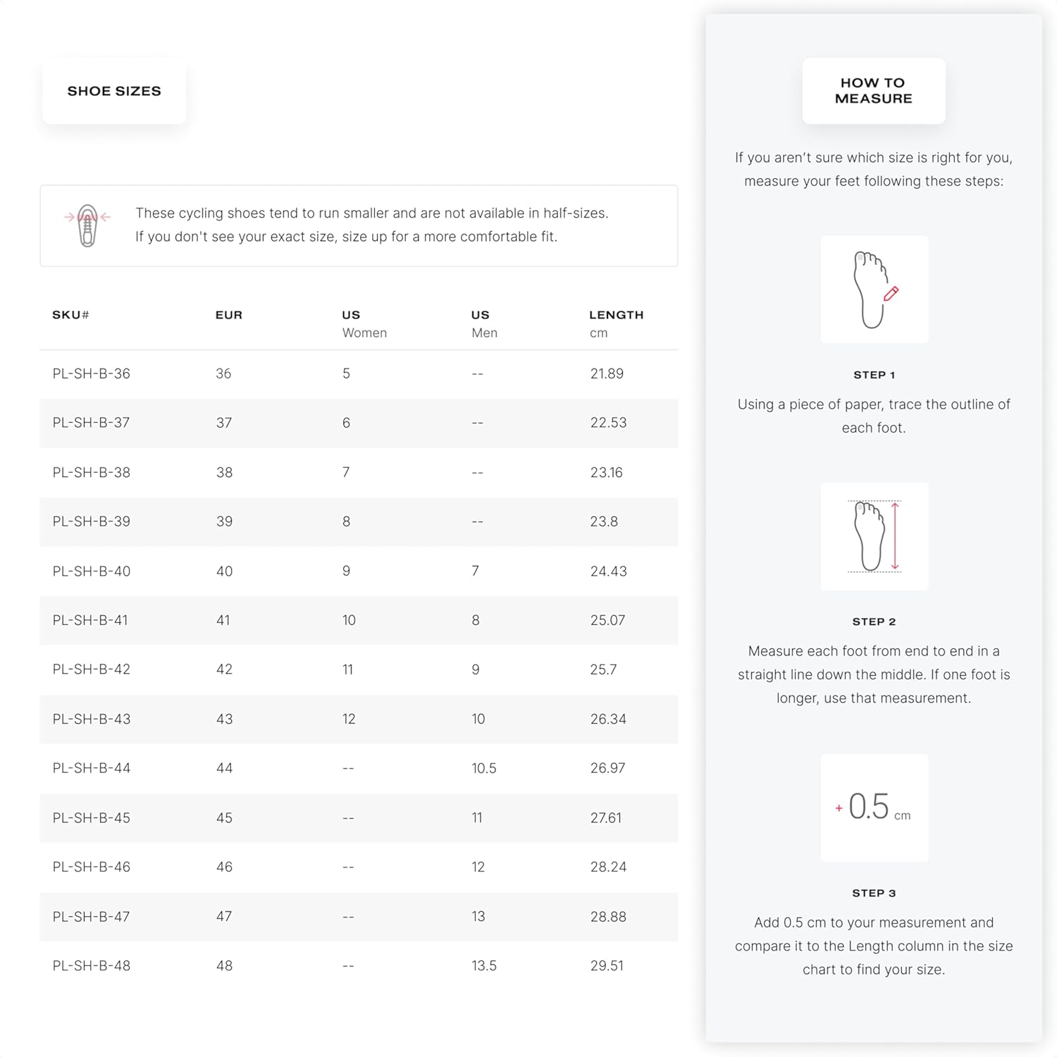DESIGNED FOR PELOTON BIKE and BIKE+ Peloton shoes were designed so that you can get the ideal Peloton workout experience. They include delta-compatible bike cleats that allow you to quickly clip in and out of your Peloton Bike or Bike+. Assembly required, tools for cleat installation included.nBREATHABLE and LIGHTWEIGHT Made with breathable, woven, and jacquard meshthese Peloton accessories are constructed with perfectly placed vents for all-over airflow.nMATERIALS These Peloton shoes include: jacquard mesh to provide a sock-like fit, a glass-filled nylon outsole to offer comfort and optimal power transfer, breathable waffle-mesh interior, and a soft toe and heel pad.nEASY TO PUT ON AND TAKE OFF These Peloton shoes have simple, hook and loop straps and an inlet on the back that allows a finger or two when putting on the shoemaking it easier than ever to strap in.nCOMPATIBILITY Peloton shoes were designed to work best with Peloton Bike and Bike+ so that you can get the ideal Peloton workout experience. But they will work with other bikes that require delta-compatible cleats to clip in.nFIT Peloton shoes run true to the size of your everyday shoe. Narrow to normal fit. If you fall between sizes or have a wider foot, we recommend sizing up. Typically, cycling shoes should fit similarly to running sneakersspace for your toes to wiggle and complete arch support.