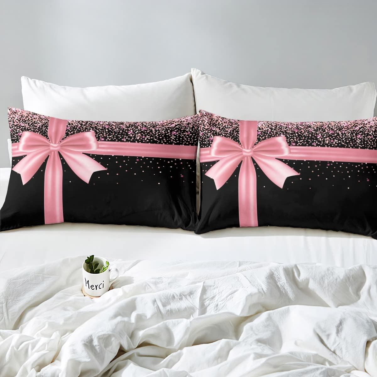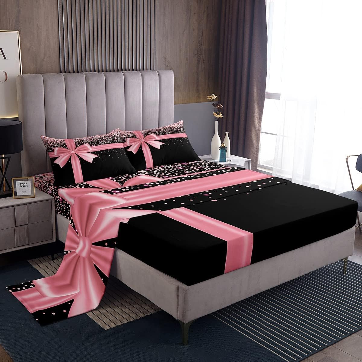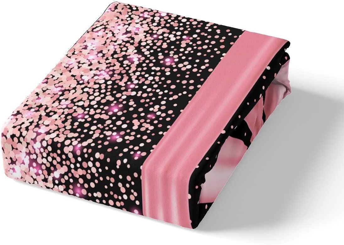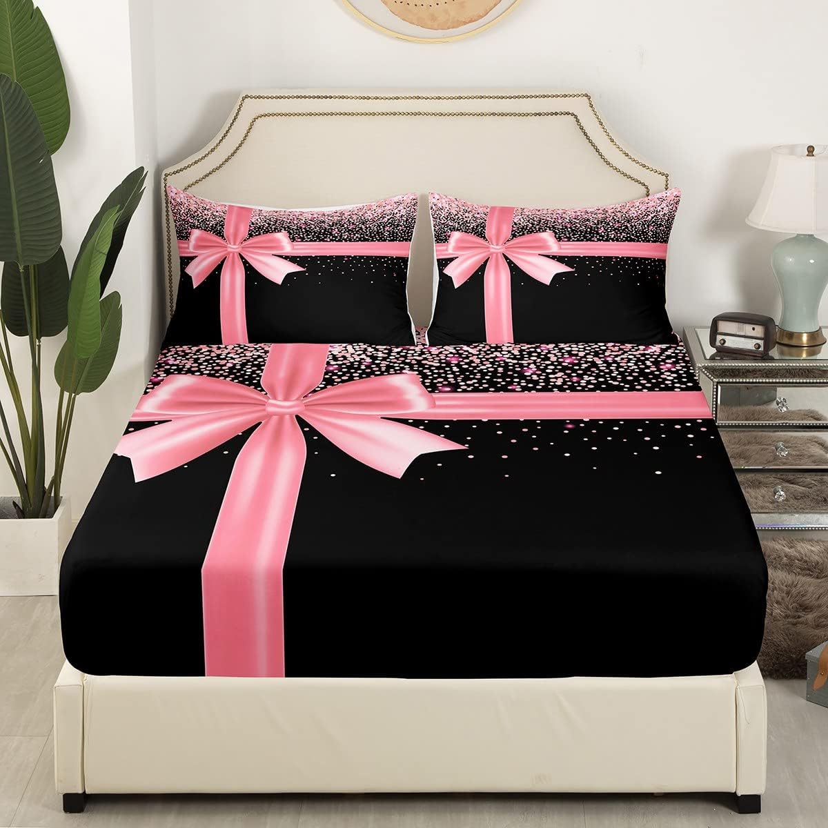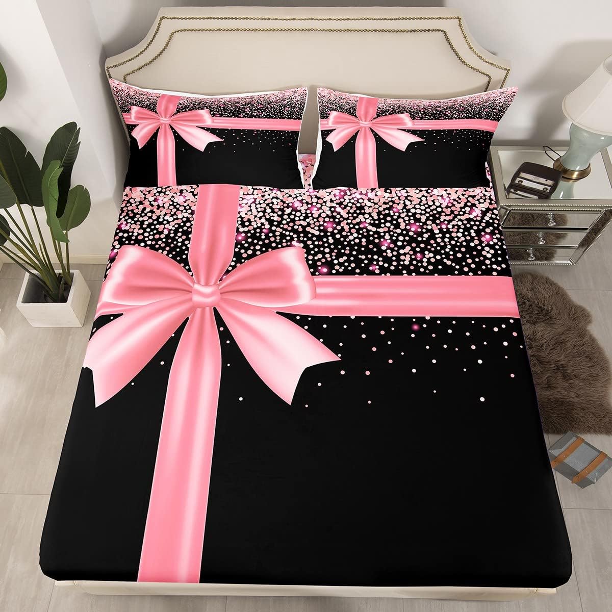 Pink Bowknot Bed Sheet Queen Set Pink Glitter Diamond Sheets Sets Adults Bedroom Decor Bling Party Microfiber Bedding Set with Flat,Fitted Sheet,2 Pillow Cases