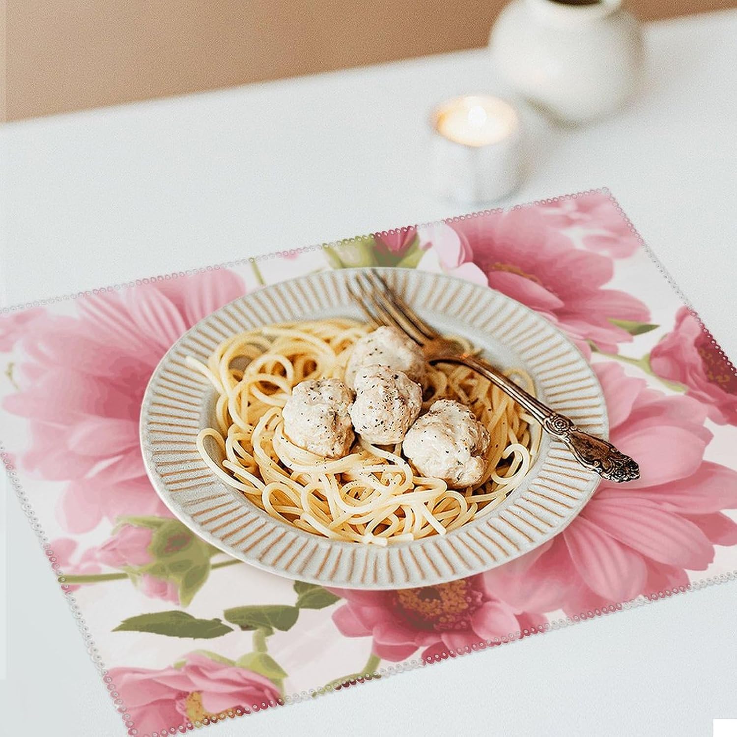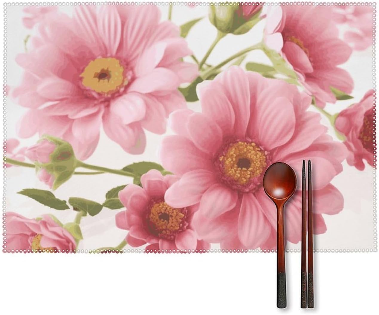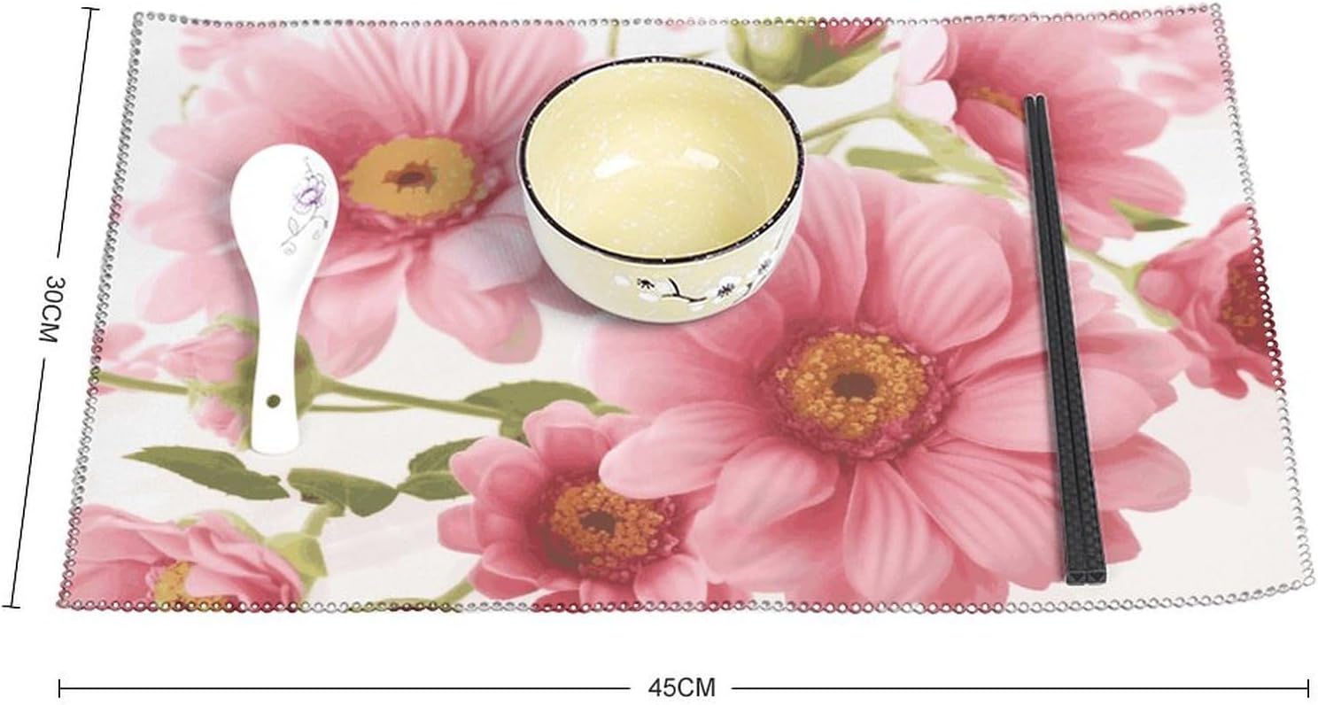 About this itemnHigh-quality placemats: These Pink Flowers table mats are made of canvas. In order to experience and guarantee the quality of the placemats, our products are strictly selected and inspected. High-quality materials and fine workmanship make them durable and can protect your dining table from scratches or stains.nLarge placemat: This Pink Flowers placemat measures 17.7 inches x 11.8 inches, large enough to accommodate any plate. Its stylish pattern and simple design are suitable for a variety of indoor and outdoor scenes, and can be used in restaurants, offices, parties, tea tables and other scenes.nBright table decoration: Our Pink Flowers personalized placemat adds atmosphere to your dining table. It is perfect for daily use at home, holidays, receptions, parties, etc., and will definitely impress your guests.nFashion coffee mat: The edging and reinforced edges of this Pink Flowers tablemat can help prevent the placemat from wearing out. The vibrant pattern adds to the charm of the placemat and brings a fresh breeze into your restaurant, suitable for indoor and outdoor use.nEffective heat insulation: This Pink Flowers tabletop protector can effectively insulate against temperatures up to 189 degrees fahrenheit, the placemat is scratch and stain resistant, making it an ideal covering for protecting tabletops from hot dishes and liquid splashes.