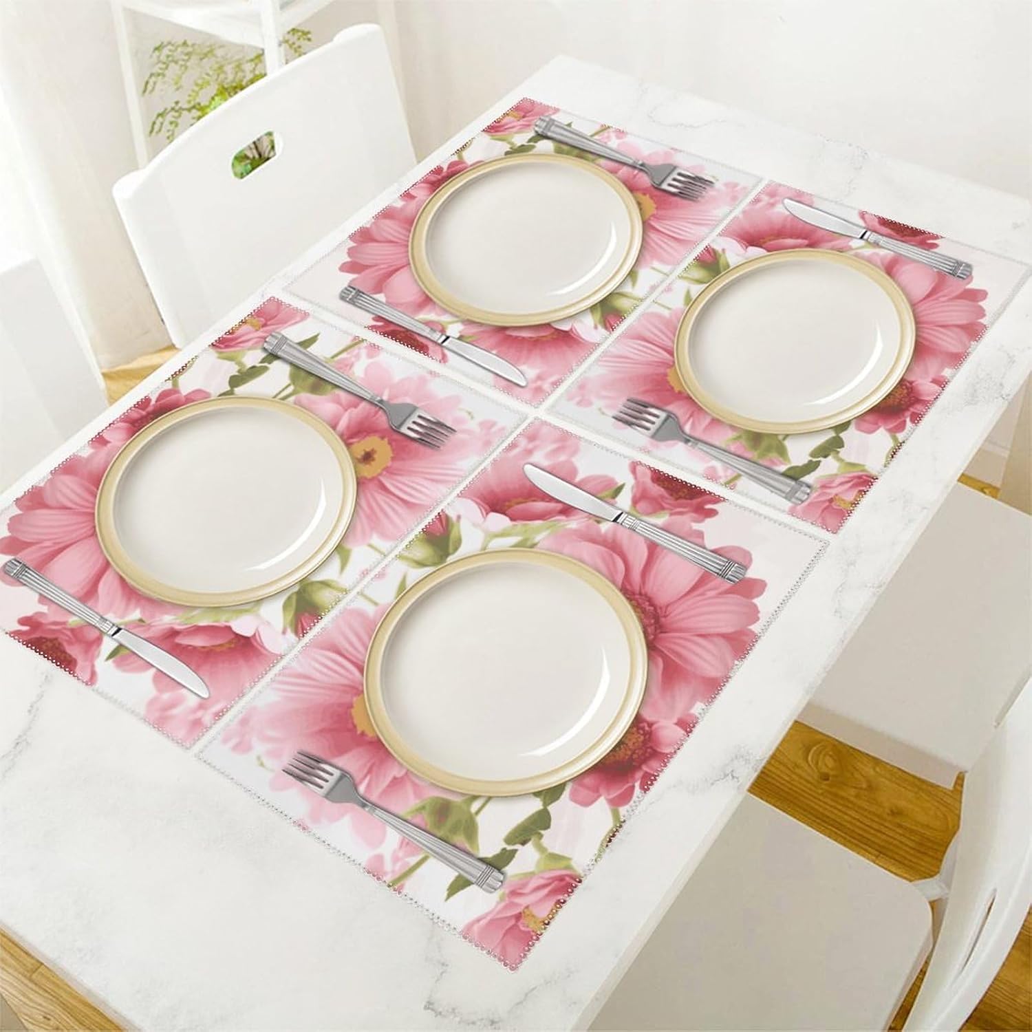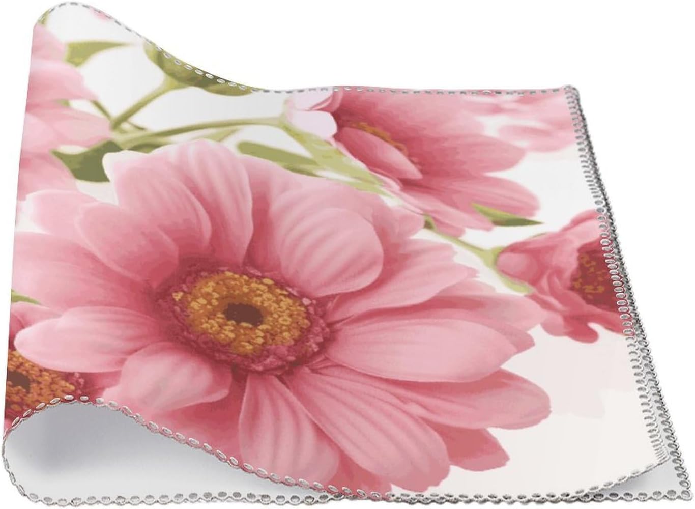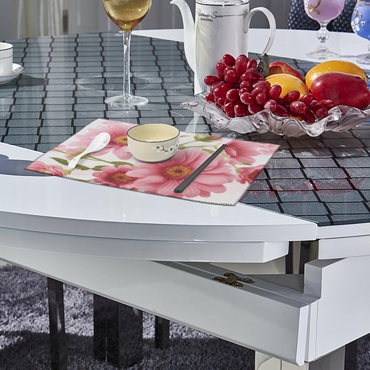About this itemnHigh-quality placemats: These Pink Flowers table mats are made of canvas. In order to experience and guarantee the quality of the placemats, our products are strictly selected and inspected. High-quality materials and fine workmanship make them durable and can protect your dining table from scratches or stains.nLarge placemat: This Pink Flowers placemat measures 17.7 inches x 11.8 inches, large enough to accommodate any plate. Its stylish pattern and simple design are suitable for a variety of indoor and outdoor scenes, and can be used in restaurants, offices, parties, tea tables and other scenes.nBright table decoration: Our Pink Flowers personalized placemat adds atmosphere to your dining table. It is perfect for daily use at home, holidays, receptions, parties, etc., and will definitely impress your guests.nFashion coffee mat: The edging and reinforced edges of this Pink Flowers tablemat can help prevent the placemat from wearing out. The vibrant pattern adds to the charm of the placemat and brings a fresh breeze into your restaurant, suitable for indoor and outdoor use.nEffective heat insulation: This Pink Flowers tabletop protector can effectively insulate against temperatures up to 189 degrees fahrenheit, the placemat is scratch and stain resistant, making it an ideal covering for protecting tabletops from hot dishes and liquid splashes.