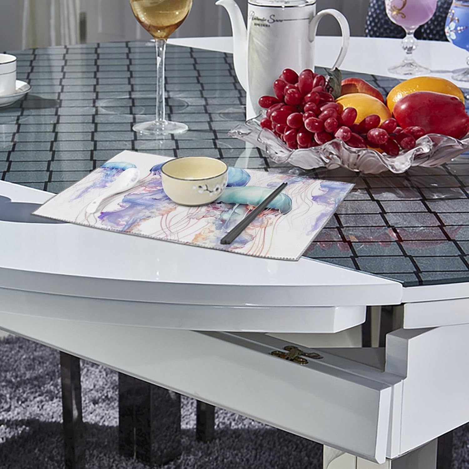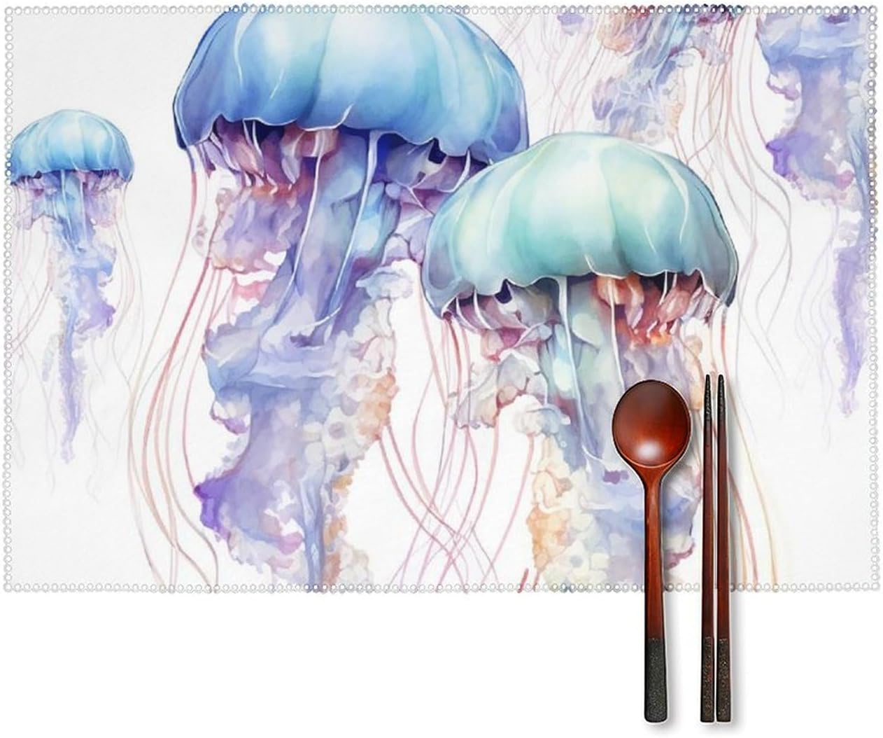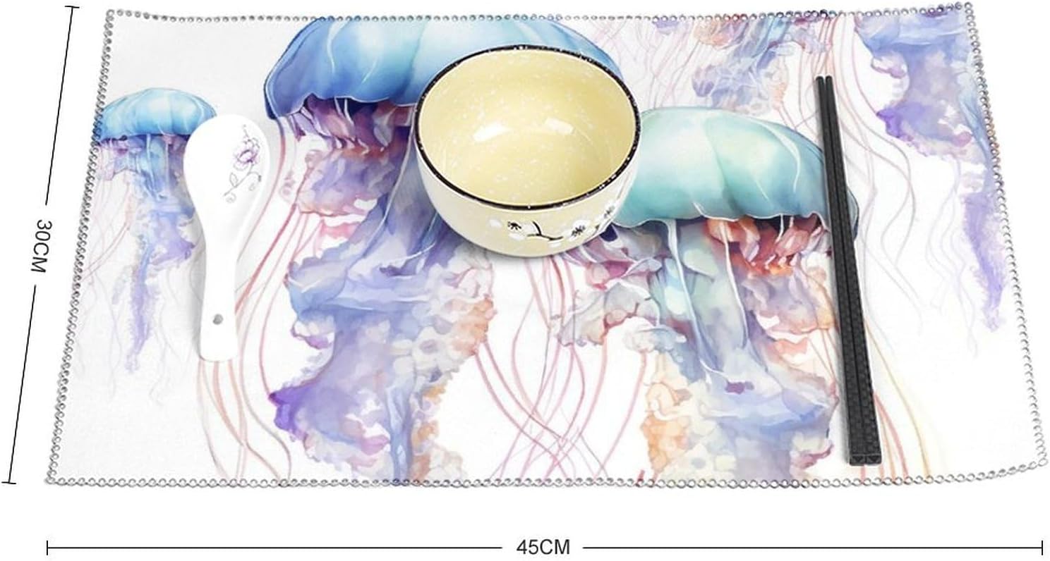 About this itemnCanvas Place Mats:Watercolor 3D Jellyfish Table mats made of hard paper canvas, the placemats are safe and reusable, and placemats set of 6 will protect and decorate your table at the same time.Size : 17.7 x 11.8 inches (45 x 30 cm).nEasy to Care For: The Watercolor 3D Jellyfish tray mat is easy to clean and wipe clean. Wash hands with warm soapy water or dry them directly; Do not use a washing machine to clean or use steel balls or difficult to clean items. Match various tables, suitable for both indoor and outdoor use.nMultifunctional: Watercolor 3D Jellyfish Insulated place mats can be used as great accessories to match your different decorative purposes, such as table mats, pot holders, coasters, laptop mats, etc. The neutral design is suitable for any occasion and helps create a warm and inviting atmosphere.nEternal Design: Watercolor 3D Jellyfish Place mats can easily blend into any restaurant decor. Decorate your dining table. Whether you have a wooden, glass, white, wooden farmhouse, or brown dining table, dining table mat can provide you with a comfortable dining experience.nGreat Gift: Watercolor 3D Jellyfish Kitchen place mat is perfect as a housewarming, wedding or birthday gift. Table mats set of 6 can also be used as a coffee table decoration for garden parties. Place Mats add a fresh and bright feel in spring and summer while adding warmth in fall and winter.