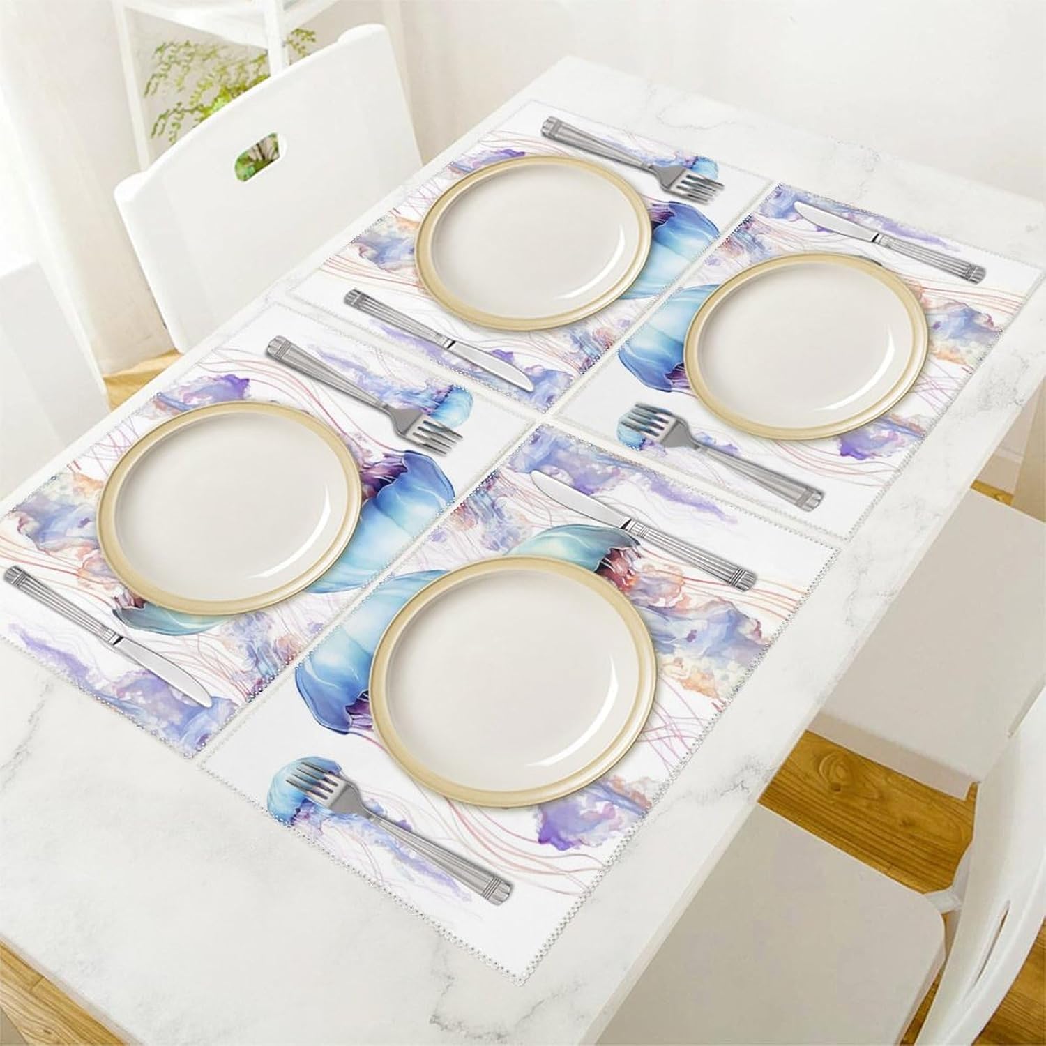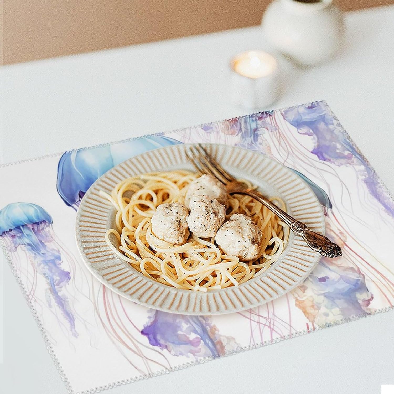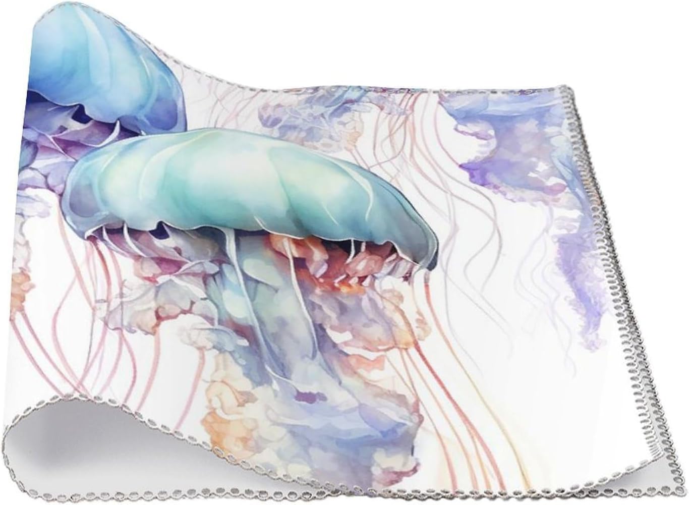 About this itemnCanvas Place Mats:Watercolor 3D Jellyfish Table mats made of hard paper canvas, the placemats are safe and reusable, and placemats set of 6 will protect and decorate your table at the same time.Size : 17.7 x 11.8 inches (45 x 30 cm).nEasy to Care For: The Watercolor 3D Jellyfish tray mat is easy to clean and wipe clean. Wash hands with warm soapy water or dry them directly; Do not use a washing machine to clean or use steel balls or difficult to clean items. Match various tables, suitable for both indoor and outdoor use.nMultifunctional: Watercolor 3D Jellyfish Insulated place mats can be used as great accessories to match your different decorative purposes, such as table mats, pot holders, coasters, laptop mats, etc. The neutral design is suitable for any occasion and helps create a warm and inviting atmosphere.nEternal Design: Watercolor 3D Jellyfish Place mats can easily blend into any restaurant decor. Decorate your dining table. Whether you have a wooden, glass, white, wooden farmhouse, or brown dining table, dining table mat can provide you with a comfortable dining experience.nGreat Gift: Watercolor 3D Jellyfish Kitchen place mat is perfect as a housewarming, wedding or birthday gift. Table mats set of 6 can also be used as a coffee table decoration for garden parties. Place Mats add a fresh and bright feel in spring and summer while adding warmth in fall and winter.