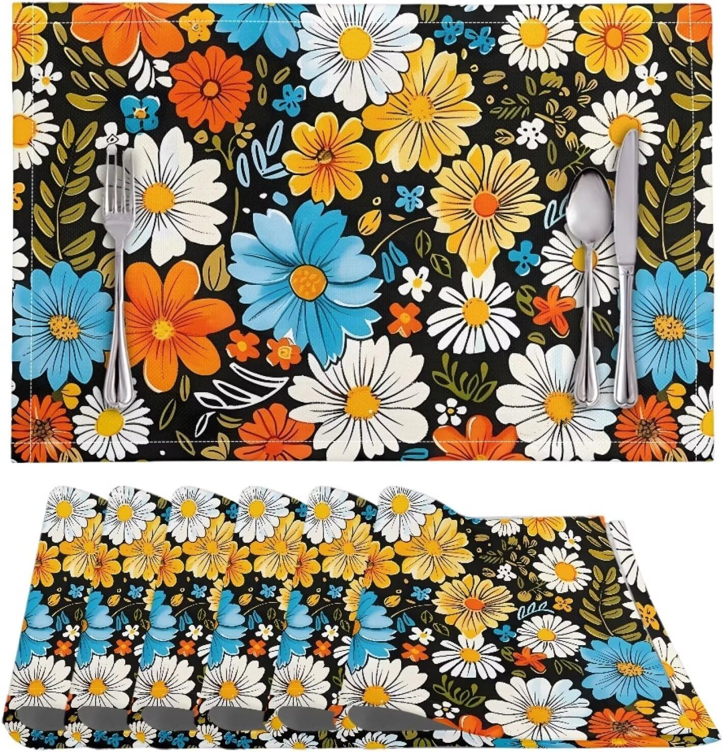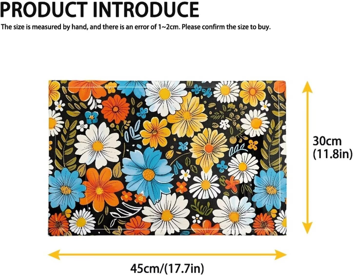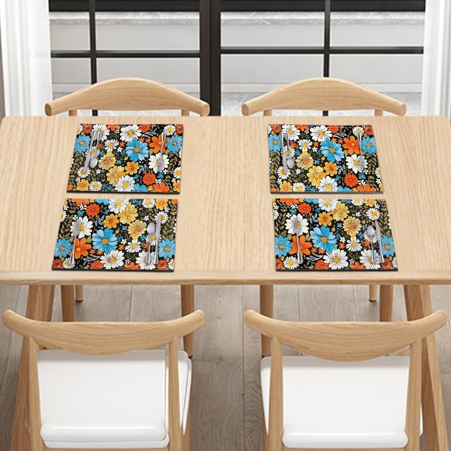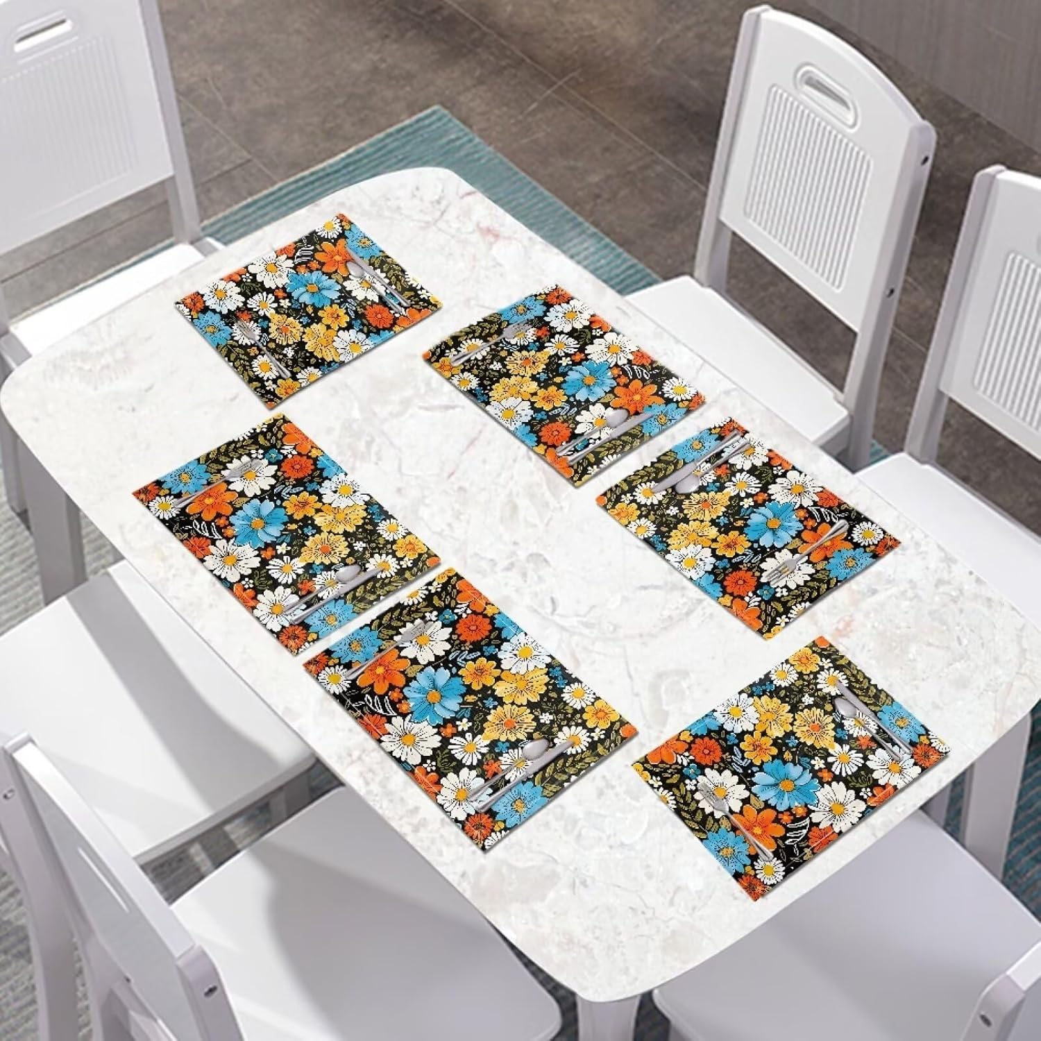 Placemats Set of 6 Boho Hippie Daisy Flower Printed Kitchen Dining Table Mat for Party Holiday Indoor Heat Resistant Soft Home Countertop Accessory Decor, 11.8 X 17.7 Inch