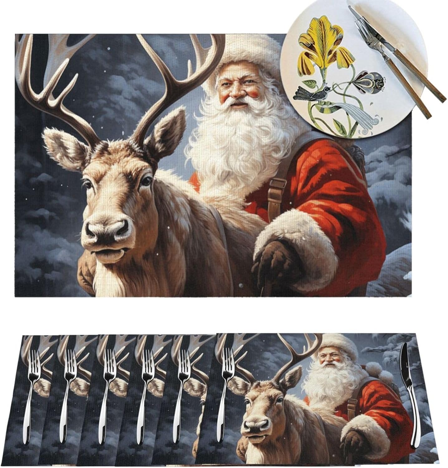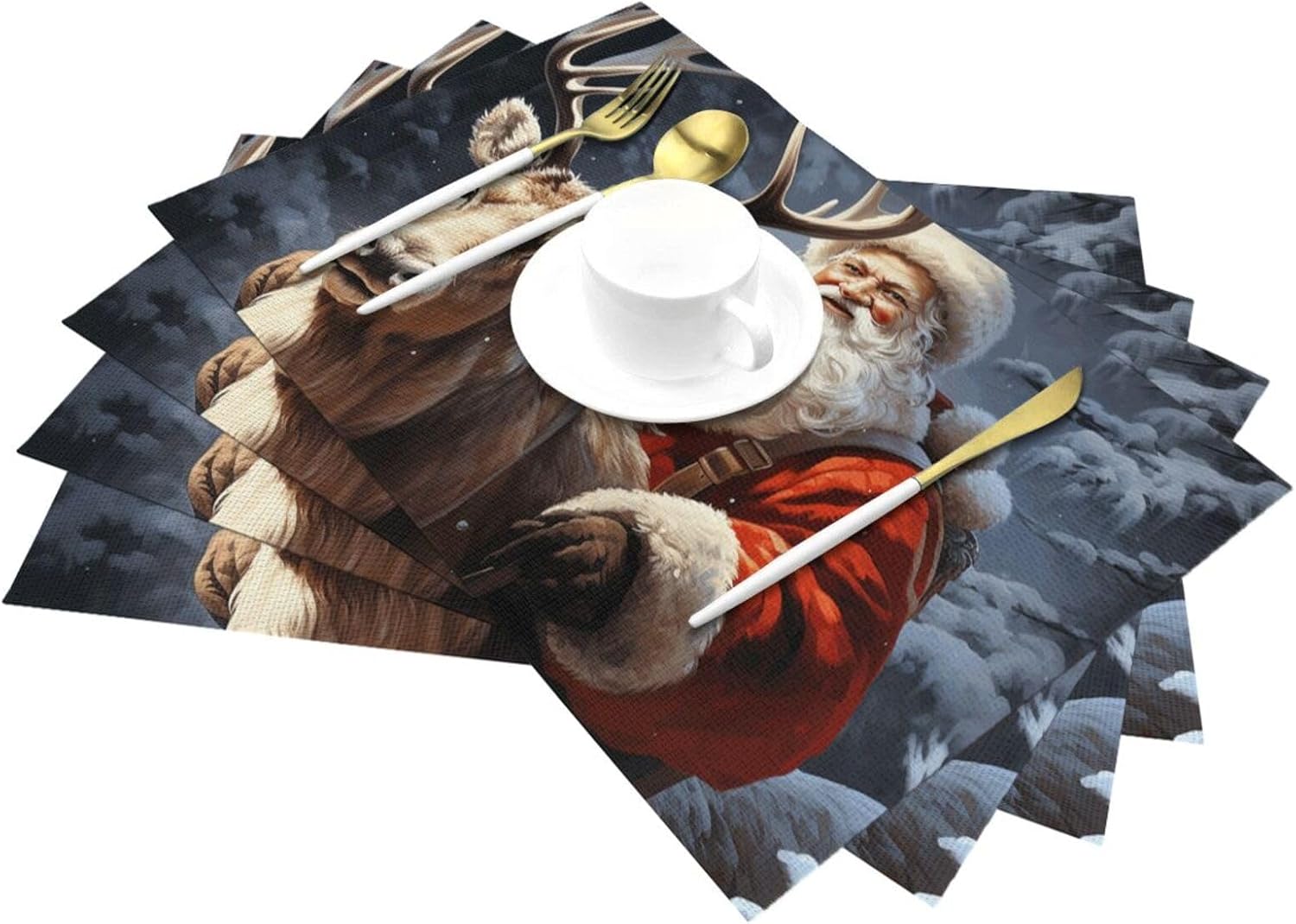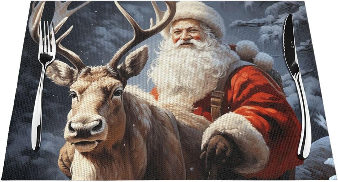 About this itemnPremium Quality and Durability: Kitchen placemats are made from a high-quality blend of 70% PVC and 30% polyester, offering exceptional durability and aesthetic. This combination ensures long-lasting use and superior protection for your dining table, making it a perfect choice for quality-required consumers.nAdvanced Heat & Scratch Protection: Protect your dining table with our placemats capable of handling up to 176? (80?). They prevent damage from heat and scratches while adding an element of elegance to your meals. Enjoy added functionality with their heat retention properties.nHome Practical Decor: Various types of modern textured and color placemats are available,18×12 inch extra large rectangular perfect size, both indoor and outdoor will be perfect for your dish or dinner plate size,can be rolled up and put away,will stay flat when spread out very easy to store.nMulti Ocassion: Our washable placemats are a great choice for everyday life in the kitchen, home,restaurant,hotel or business office,outdoor and indoor use meet your different needs. Great gift idea for Christmas, Wedding, Fathers Day, Mothers Day, Valentines.nWashable & Easy to Clean: Santa Claus and Deer Elk table mats are easy to clean, just wipe with soap, water and a soft sponge/rag. Scrub stubborn stains with a soft bristle-brush and a bleach-based cleanse. The color scheme make the whole table stylish of texture.