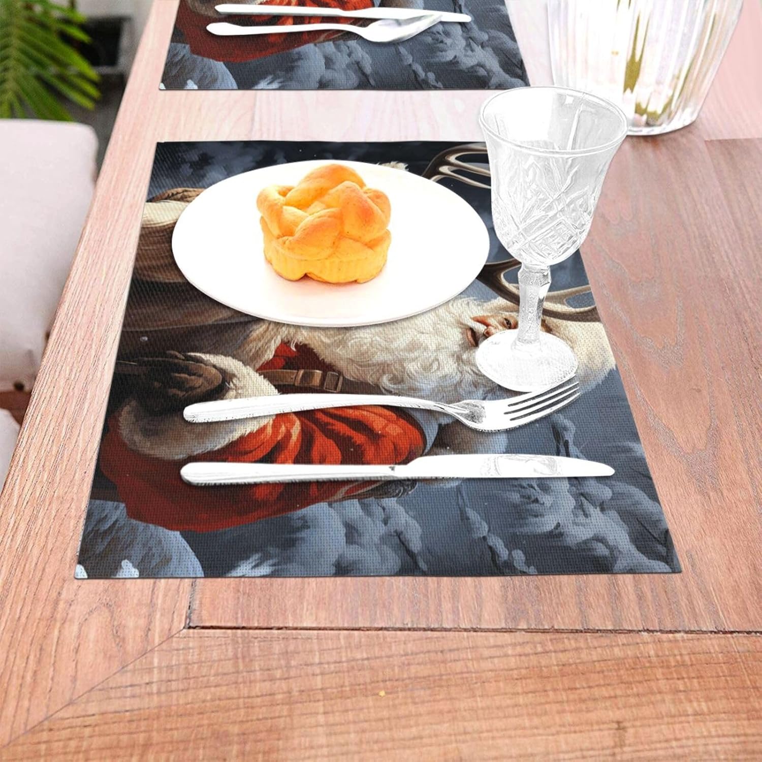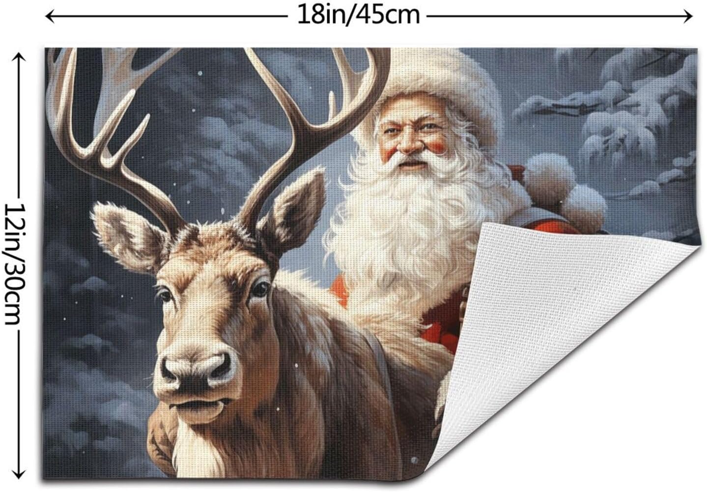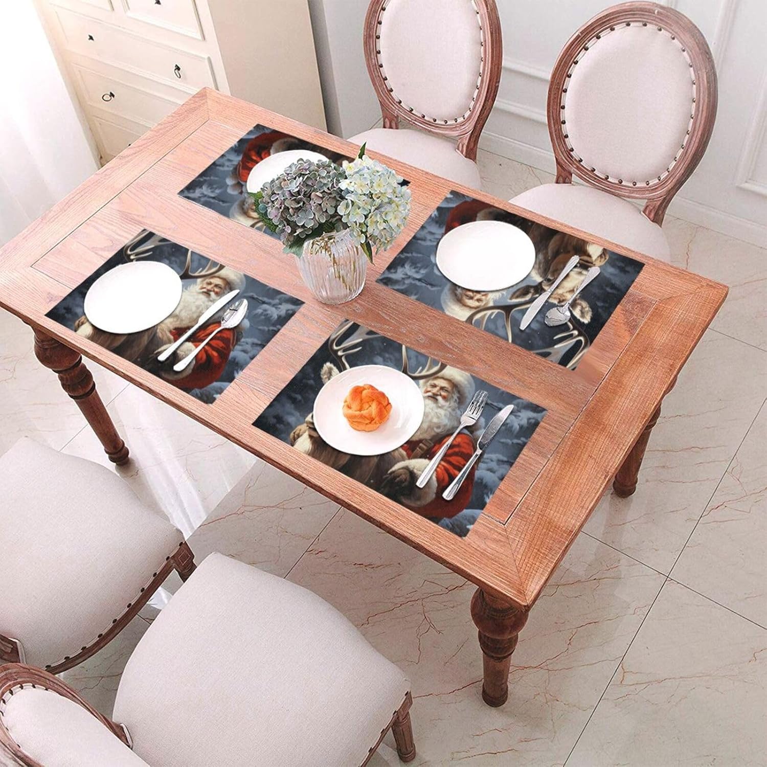 About this itemnPremium Quality and Durability: Kitchen placemats are made from a high-quality blend of 70% PVC and 30% polyester, offering exceptional durability and aesthetic. This combination ensures long-lasting use and superior protection for your dining table, making it a perfect choice for quality-required consumers.nAdvanced Heat & Scratch Protection: Protect your dining table with our placemats capable of handling up to 176? (80?). They prevent damage from heat and scratches while adding an element of elegance to your meals. Enjoy added functionality with their heat retention properties.nHome Practical Decor: Various types of modern textured and color placemats are available,18×12 inch extra large rectangular perfect size, both indoor and outdoor will be perfect for your dish or dinner plate size,can be rolled up and put away,will stay flat when spread out very easy to store.nMulti Ocassion: Our washable placemats are a great choice for everyday life in the kitchen, home,restaurant,hotel or business office,outdoor and indoor use meet your different needs. Great gift idea for Christmas, Wedding, Fathers Day, Mothers Day, Valentines.nWashable & Easy to Clean: Santa Claus and Deer Elk table mats are easy to clean, just wipe with soap, water and a soft sponge/rag. Scrub stubborn stains with a soft bristle-brush and a bleach-based cleanse. The color scheme make the whole table stylish of texture.