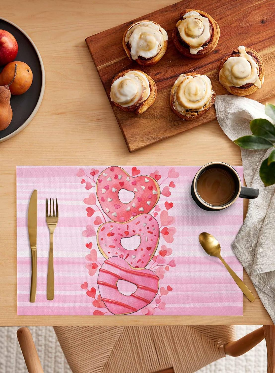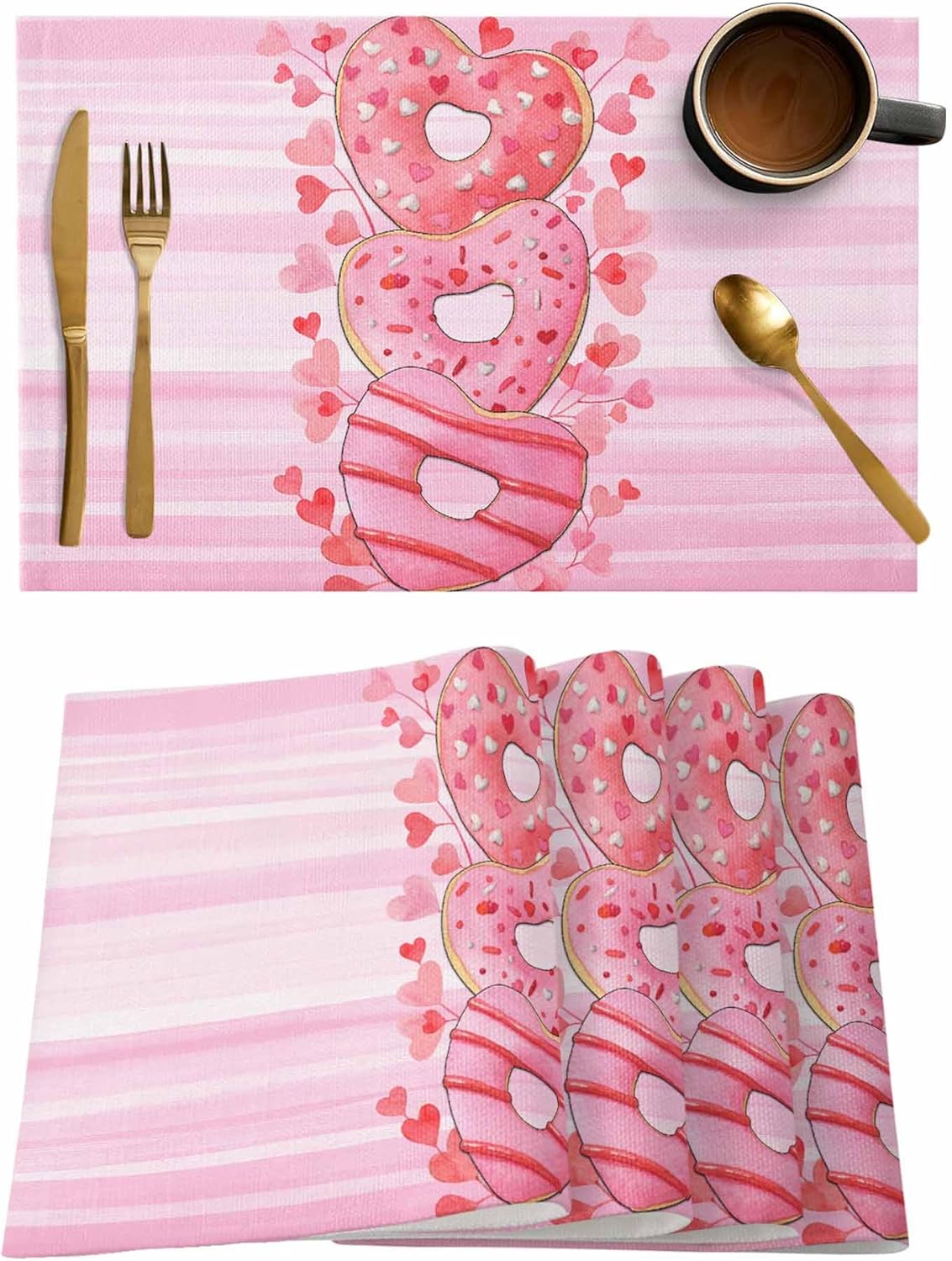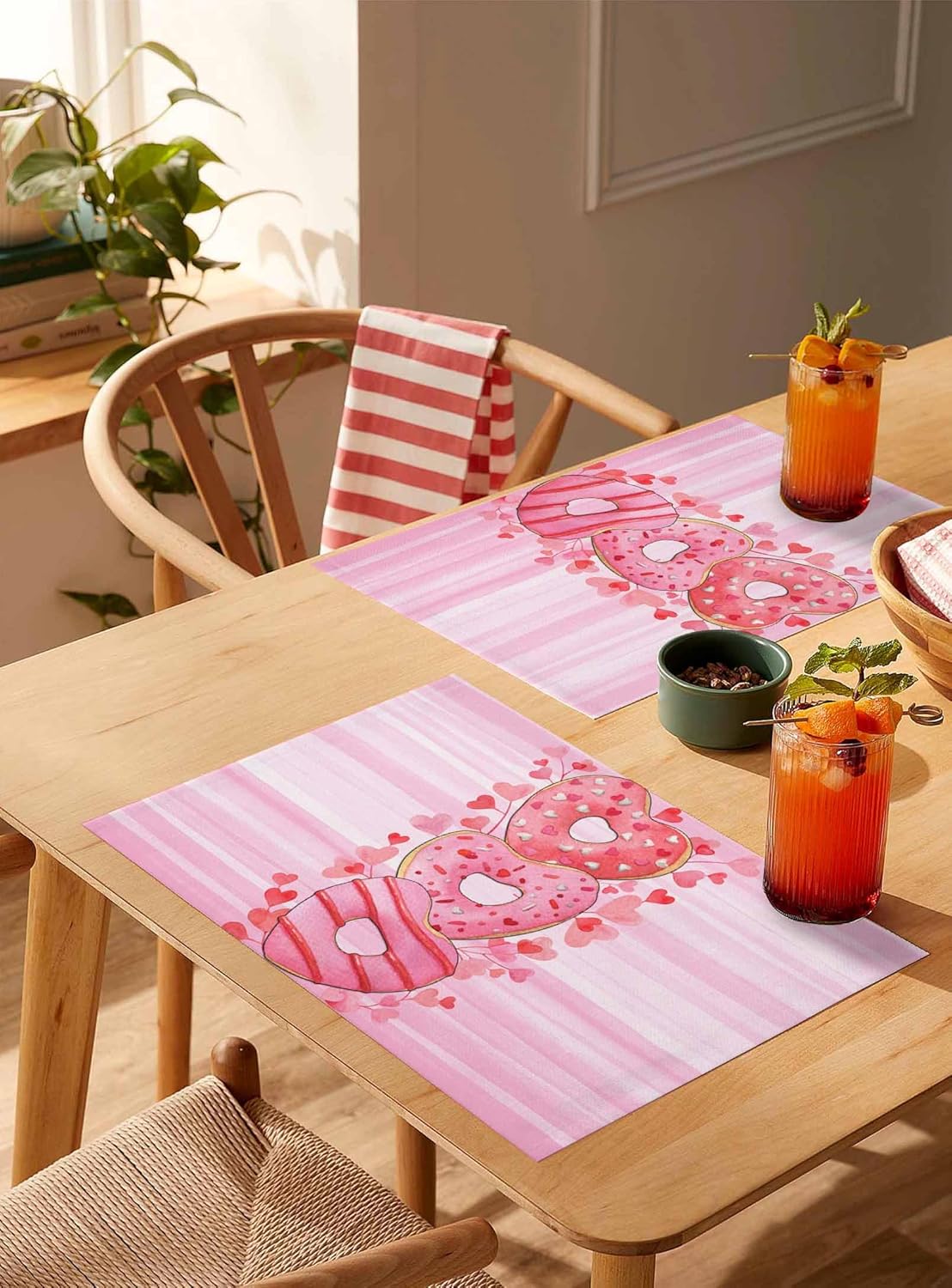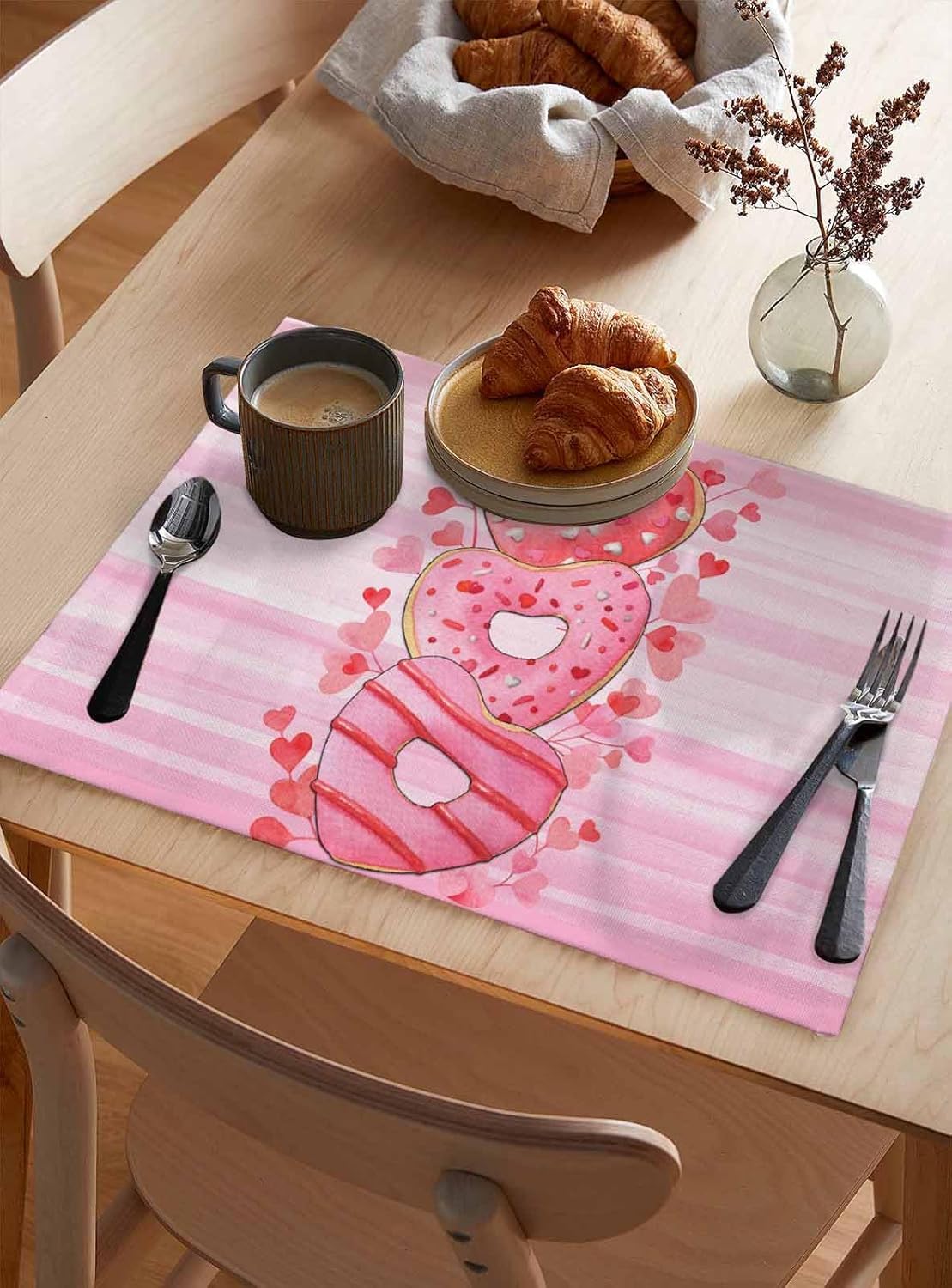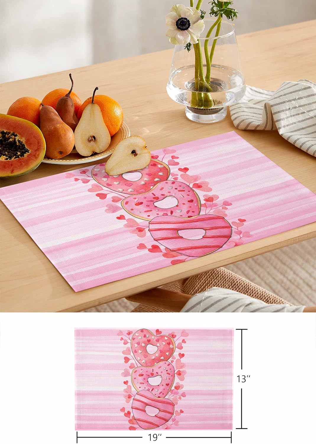 Placemats Set of 6 Valentine’s Day Pink Love Heart Doughnut Dessert Watercolor Non Slip Washable Table Mats Set Table Placemats for Kitchen Dining Table Wedding Holiday Party Decoration