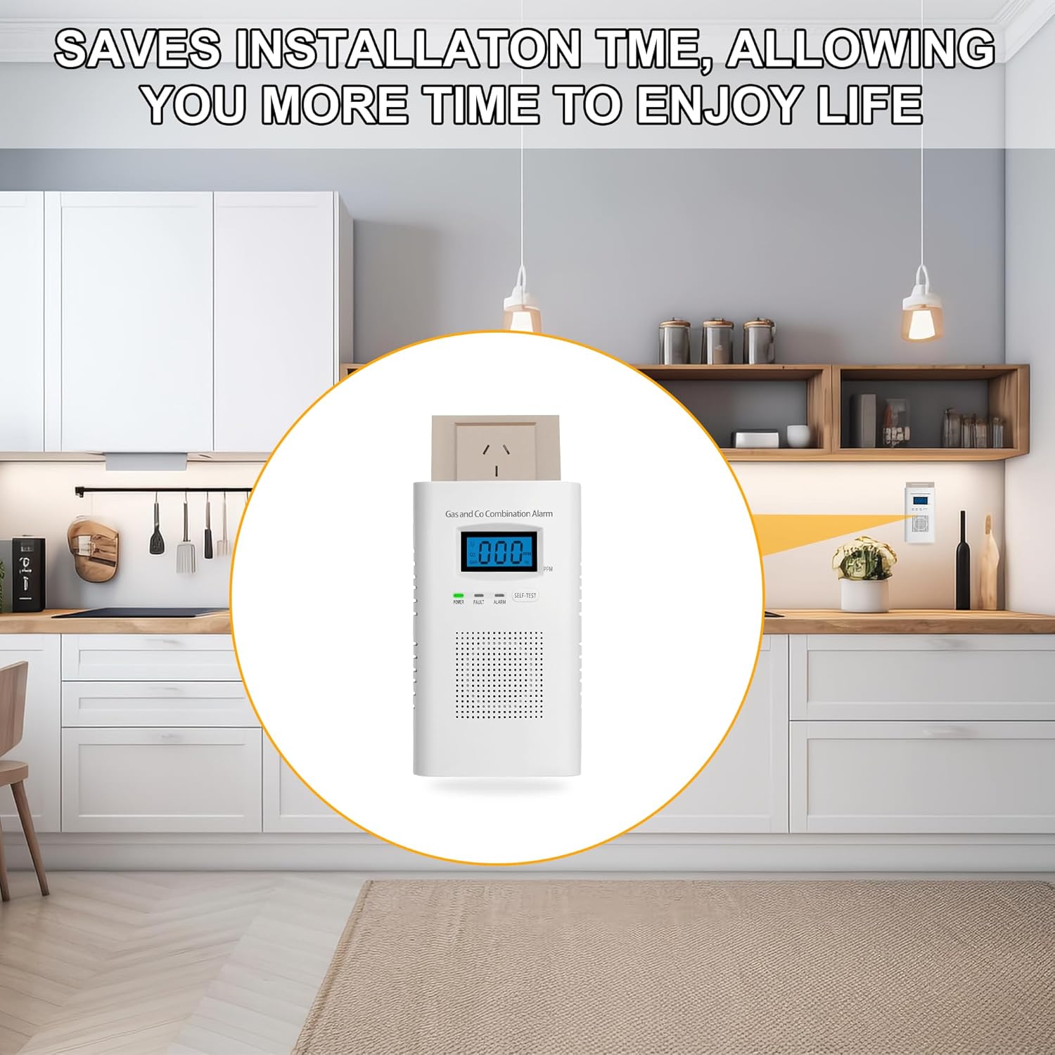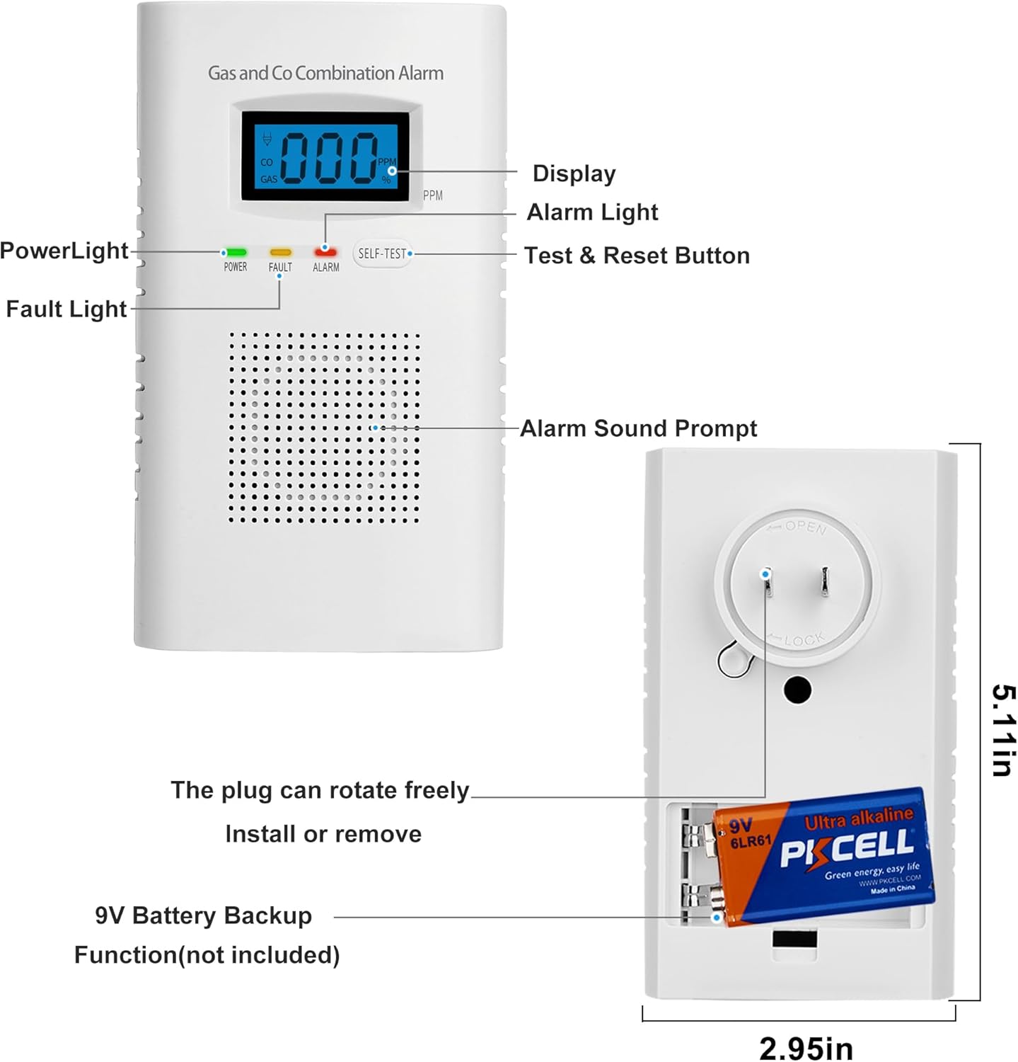 About this itemn?Koabbit Combination Gas & Carbon Monoxide Detectors?Plug and play, easy to install and easy to read.n?High Sensitivity Sensors?The gas and carbon monoxide detector contains a catalytic combustion sensor and an electrochemical sensor, both of which are highly sensitive and accurate, allowing you to detect conditions in a timely manner.n?LCD Display & 85 High Volume Alarm?When the combustible gas or carbon monoxide gas reaches a certain level, the gas detector will display the gas concentration value and sound an alarm, allowing you to quickly determine and make the right choice.n?9V Battery Backup?A 9V battery backup can be installed to avoid the hassle of power outages.n?Combustible Gas Detection Range?LPG(Methane), natural gas, coal gas, gas fuel, artificial gas, liquefied petroleum gas, liquefied natural gas etc.n?Power Saving Design?: the display will turn off automatically when no dangerous gas is detected.nTips:Package does not include 9V battery