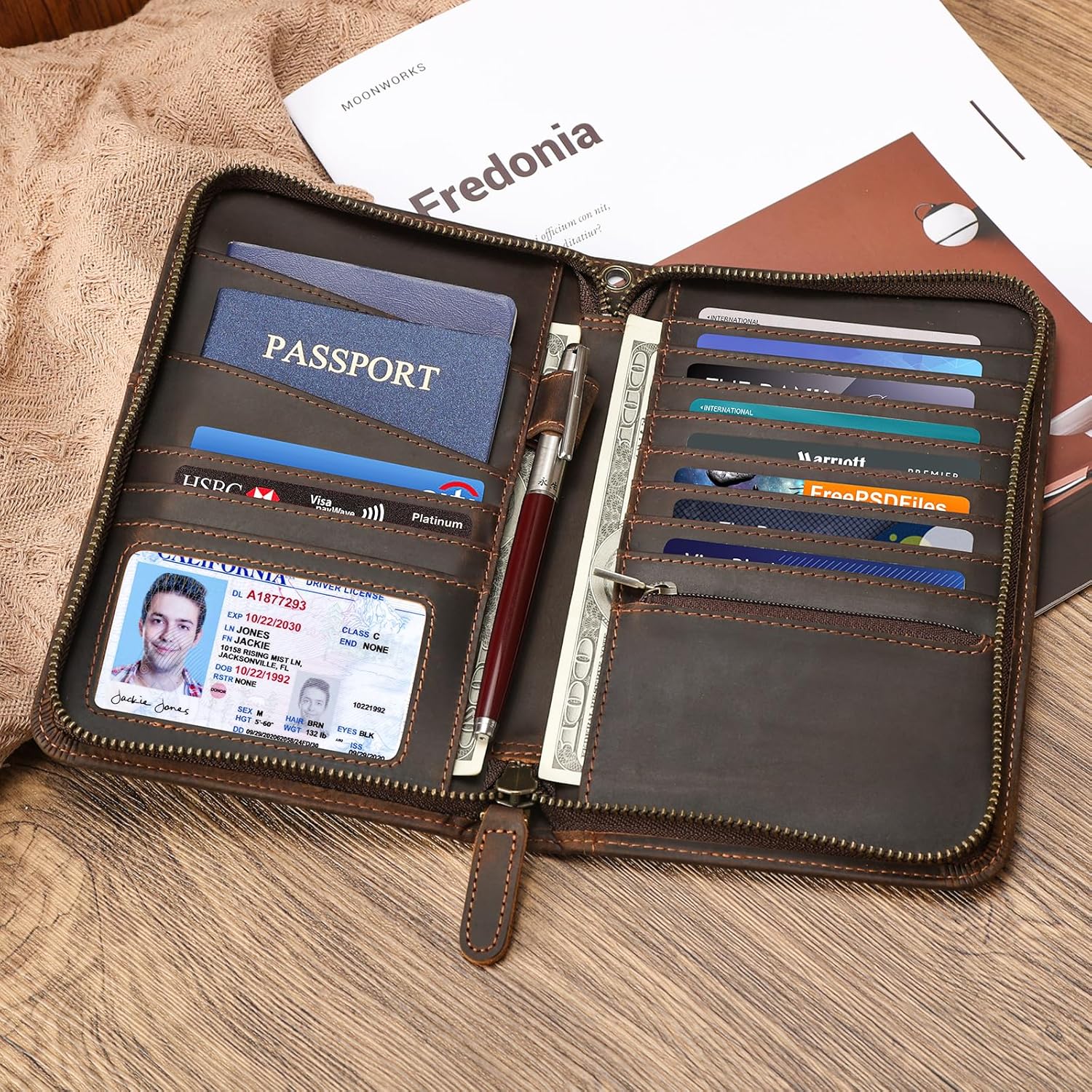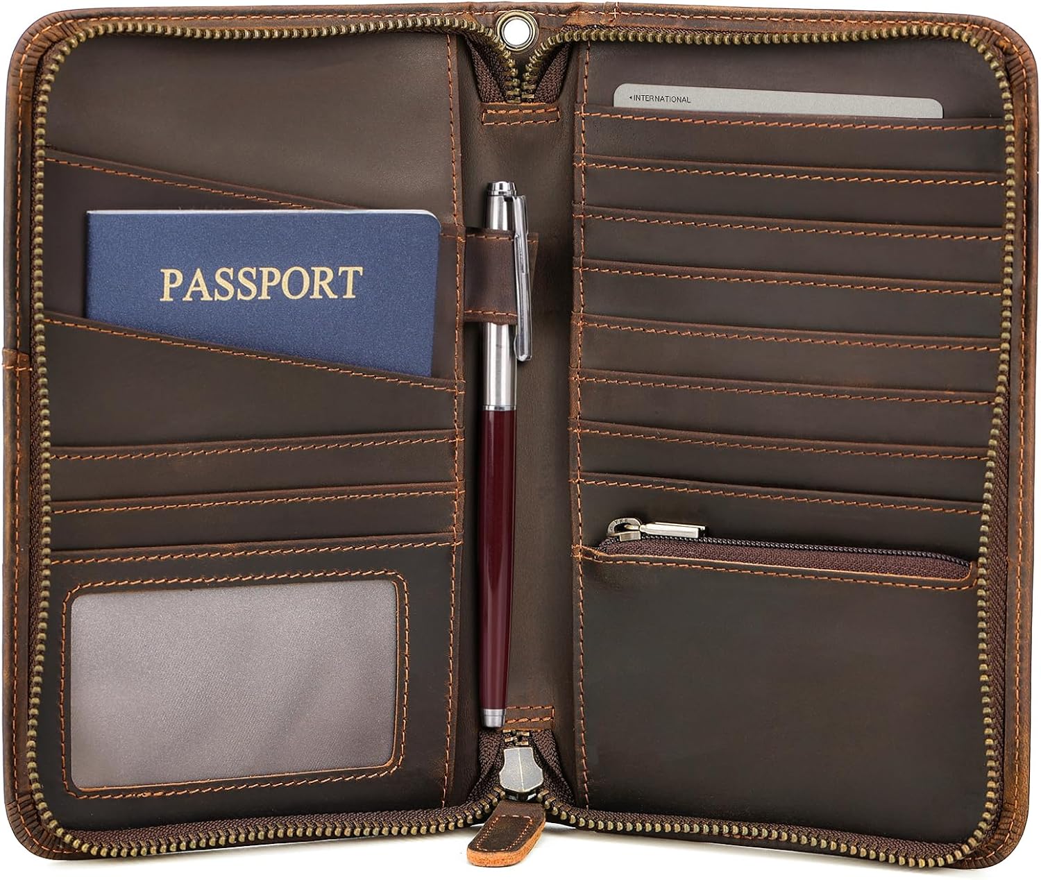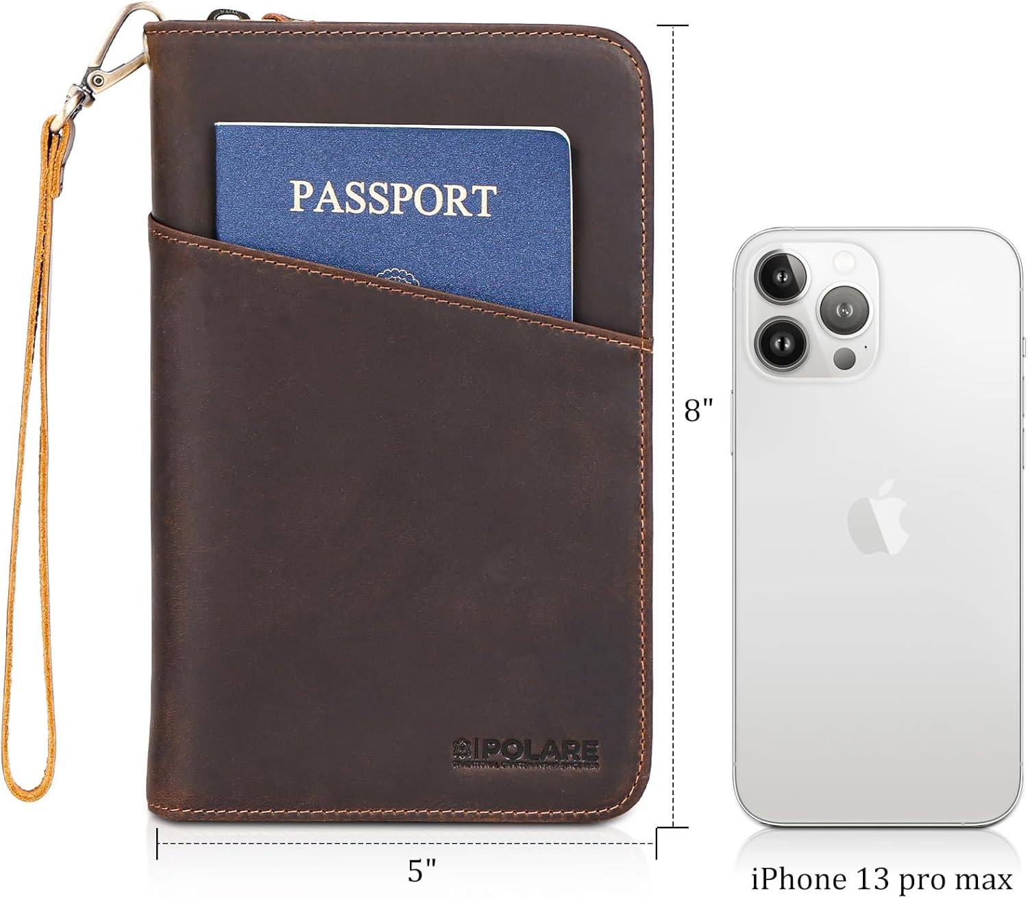 About this itemnHigh Quality Leather Craftsmanship: Handmade from luxury full grain leather with YKK zippers, has a smooth, soft and luxurious feeling in your hand. Around with reinforced stitching, it will not tear or become loose, making it both handsome and reliable for long-term usenLarge Capacity: 2 passport slots, 10 credit card slots, 1 ID card window, 1 zipper pockets on the right sides, 2 large internal pockets for cash on the left and right sides, 1 pen holder, 1 surface boarding pass pocket and 1 removable wristlet strapnDimensions: 5 L x 8 H. Item weight: ~0.48lbs. Well-designed removable wristlet strap could easy carry-on with your need. Spacious enough to keep your necessities organized and close at handnRFID Travel Protection: Along with a premium texture, these RFID blocking wallets can perfectly block unwanted RFID scanners, keep chip cards, personal and financial information safe from unauthorized scans. It is secure and is good for travel RFID credit card holdernWarranty and Support: Comes with a one year Warranty and Lifetime customer service! Your satisfaction is our priority, we stand behind our products and support every customer get great buying experience with Polare, so you can make your purchase with peace of mind