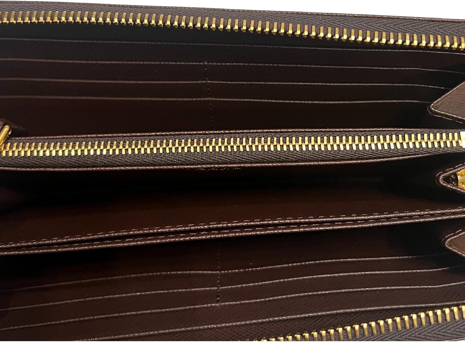 About this itemnCarry all your daily needs in style with this large continental Prada wallet. Crafted from luxurious and durable saffiano leather in bruciato brown, this chic wallet features the signature Prada logo plaque.nThis large wallet features lots of space and organization including two interior pockets and twelve card slots. This sleek and functional design is perfect for everyday use.nModel: 1ML506 Saffiano Brown Calfskin Leather Gold-tone hardwarenOne interior zip coin pocket One interior slip pocket Two bill compartments Twelve credit card slotsnMeasurements: 8