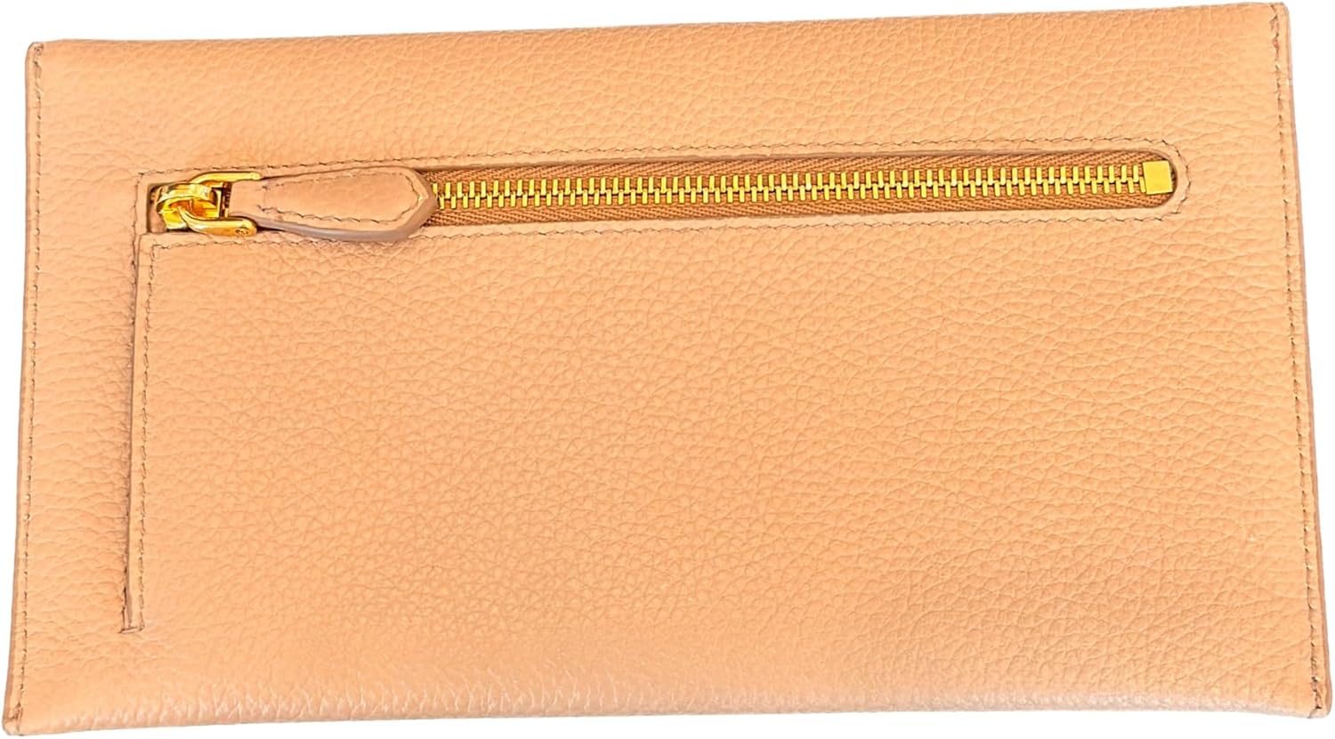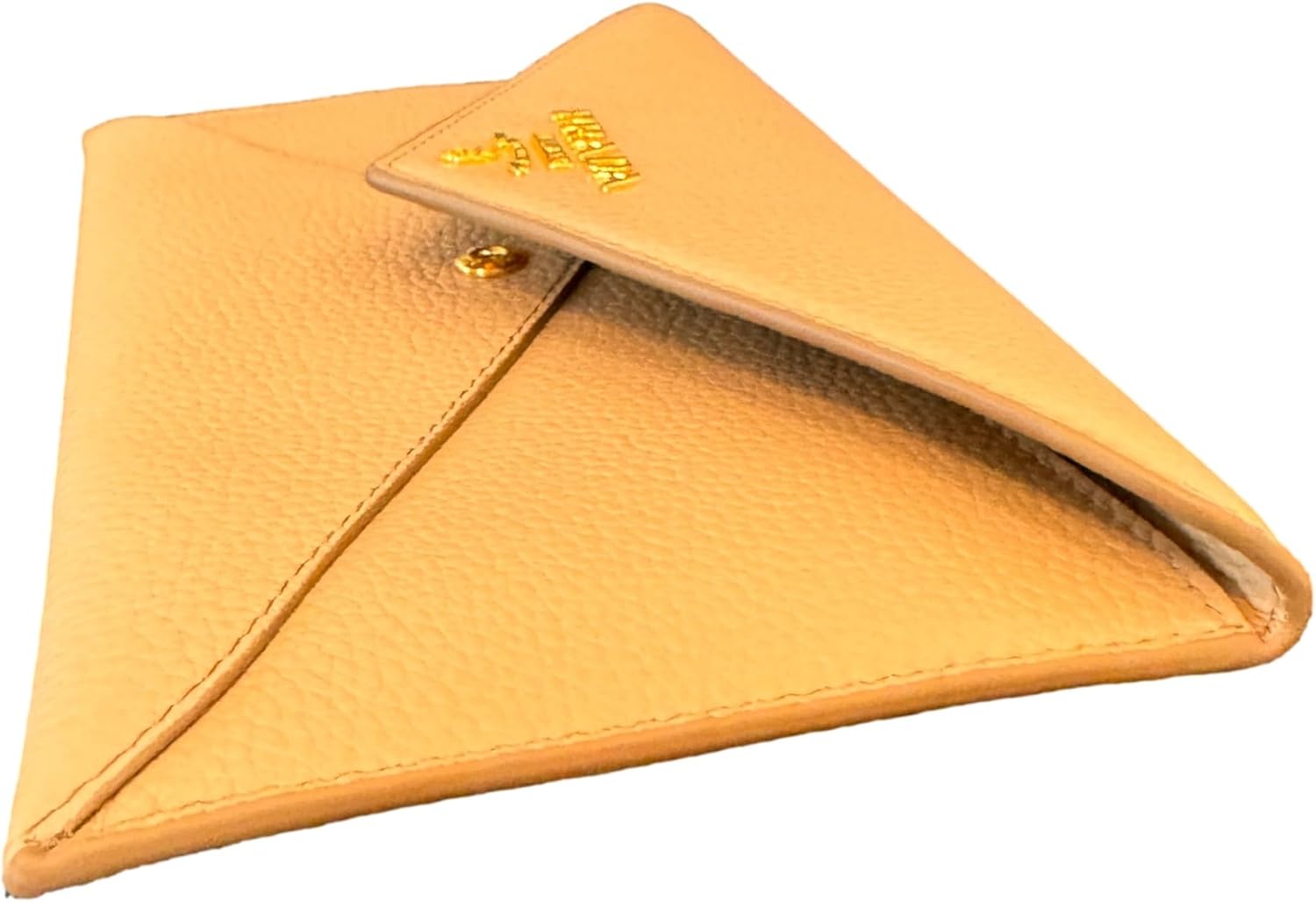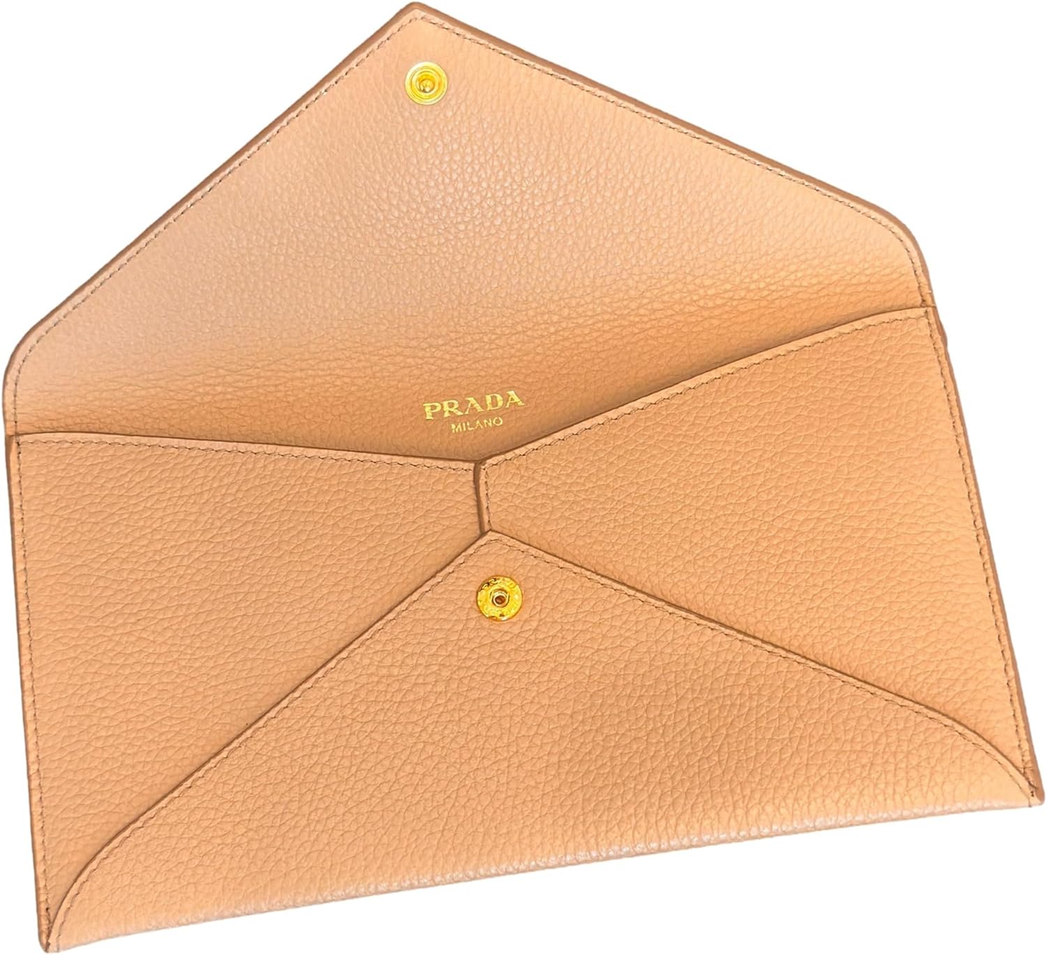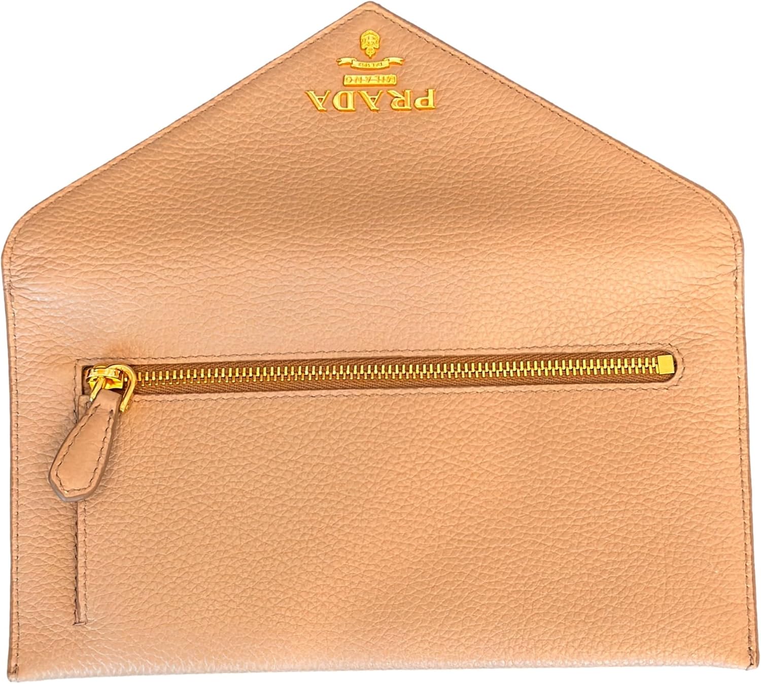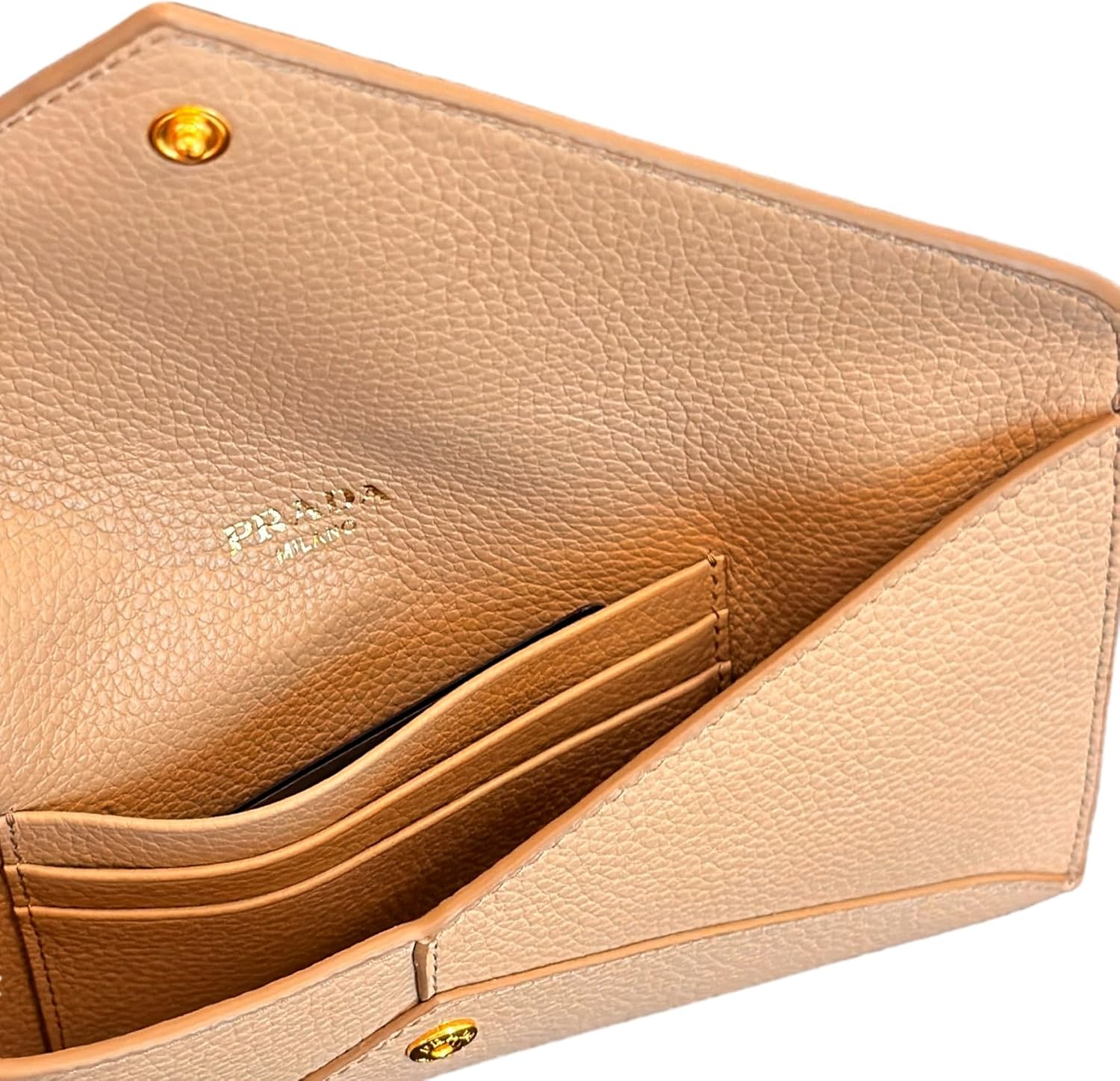 About this itemnThis long envelope wallet from Prada is constructed of beautiful beige vitello grain leather and features the Prada logo in gold hardware.nModel: 1MF175 – Long Envelope Clutch WalletnMaterial: Vitello grain leather – Color: Beige – Cammeo -Gold-tone hardwarenThree interior card slots – One exterior zipper pocketnMeasurements: 7.75