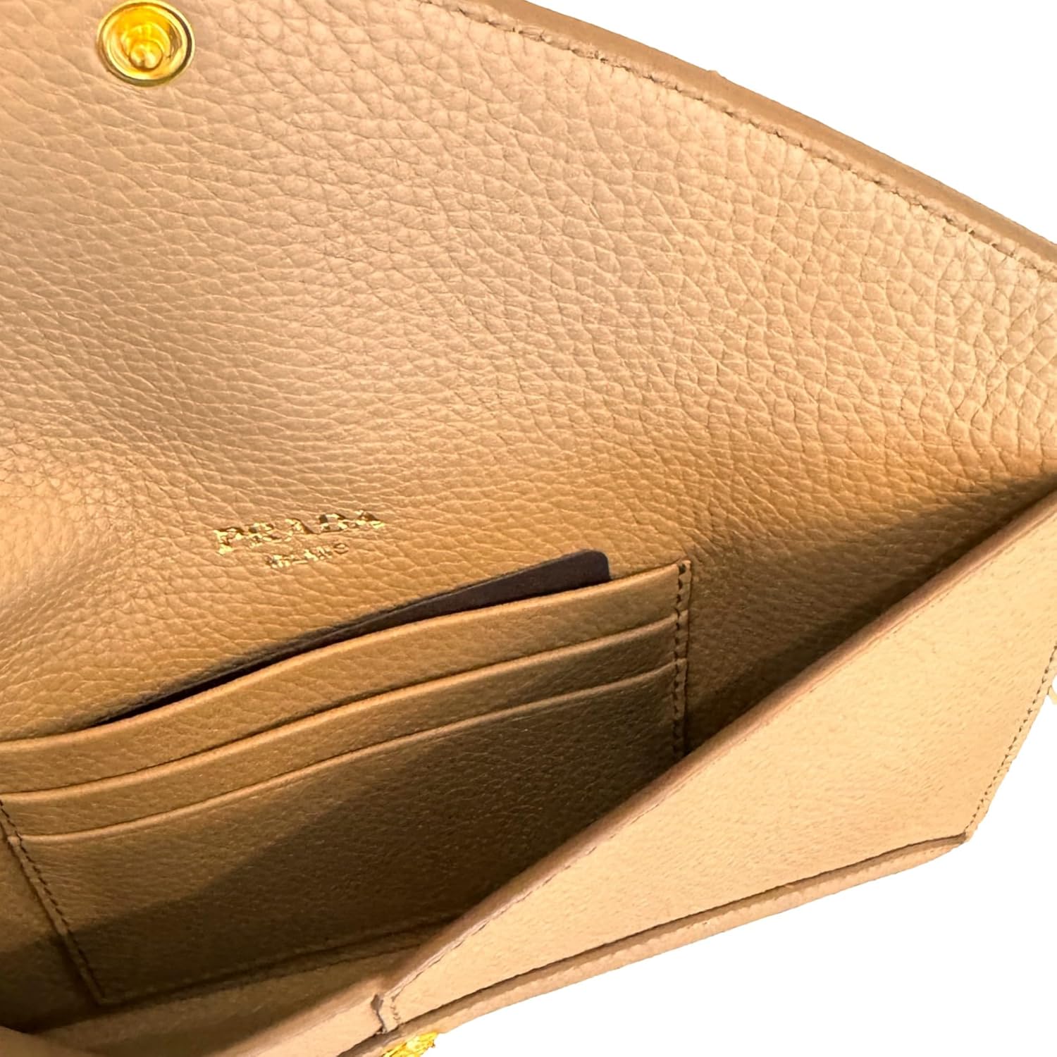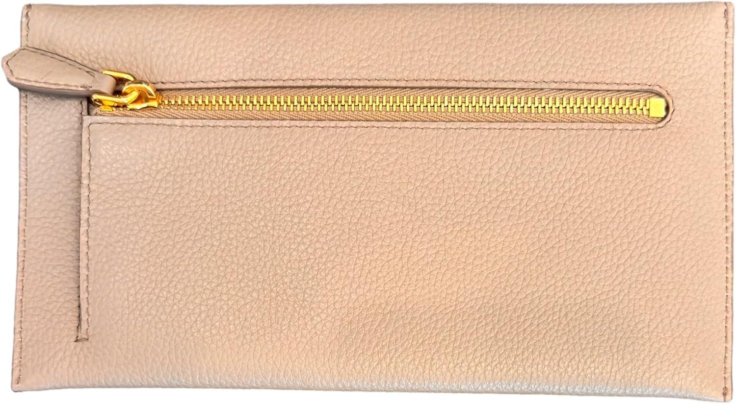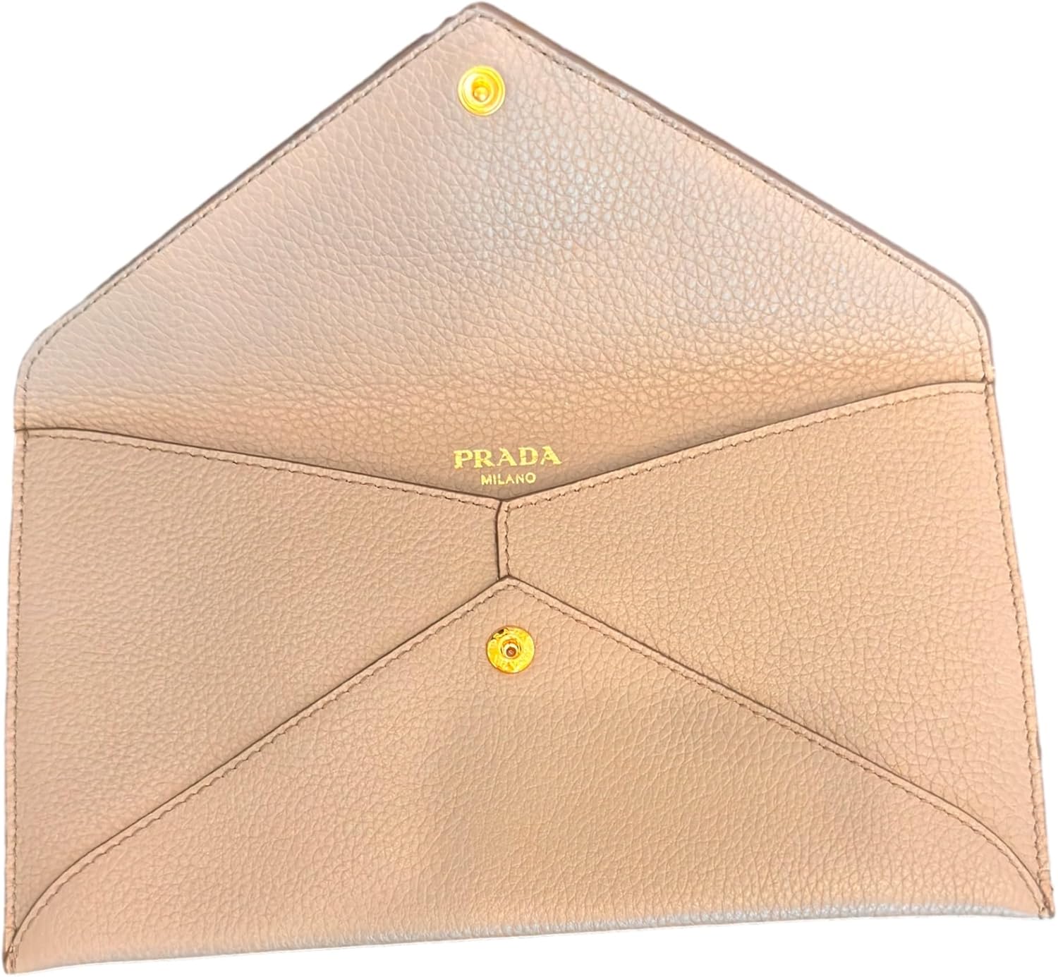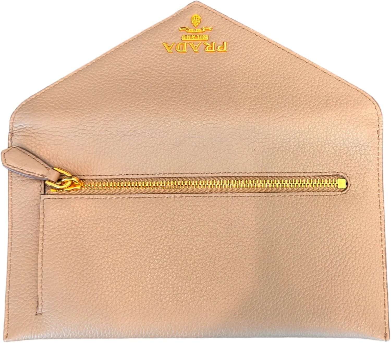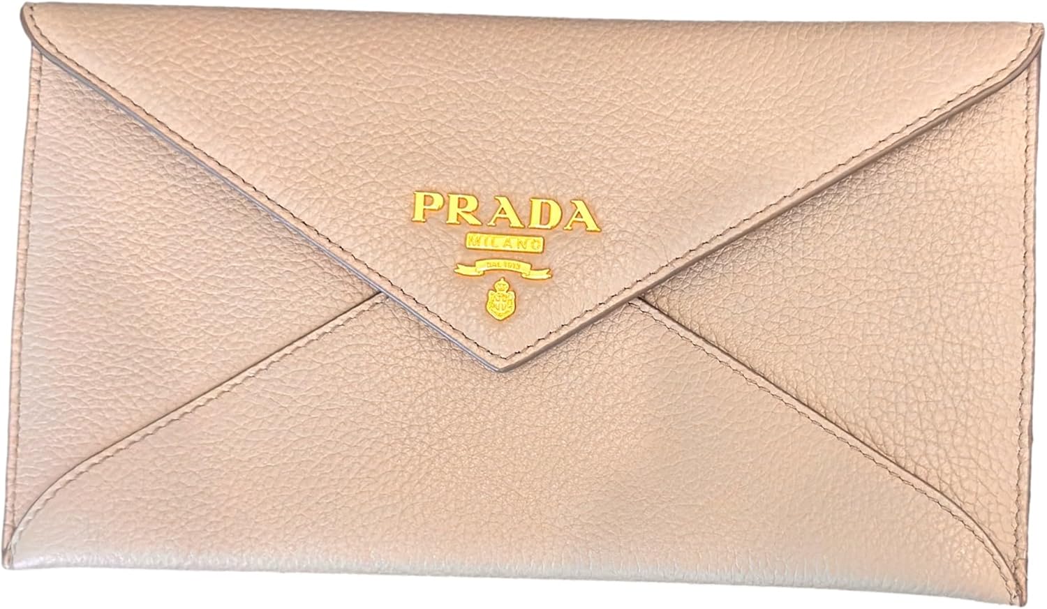 About this itemnThis long envelope wallet from Prada is constructed of beautiful grey vitello grain leather and features the Prada logo in gold hardware.nModel: 1MF175 – Long Envelope Clutch WalletnMaterial: Vitello grain leather – Color: Argilla Grey -Gold-tone hardwarenThree interior card slots – One exterior zipper pocketnMeasurements: 7.75