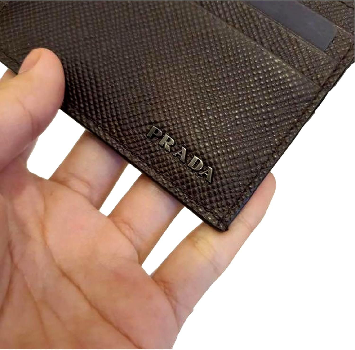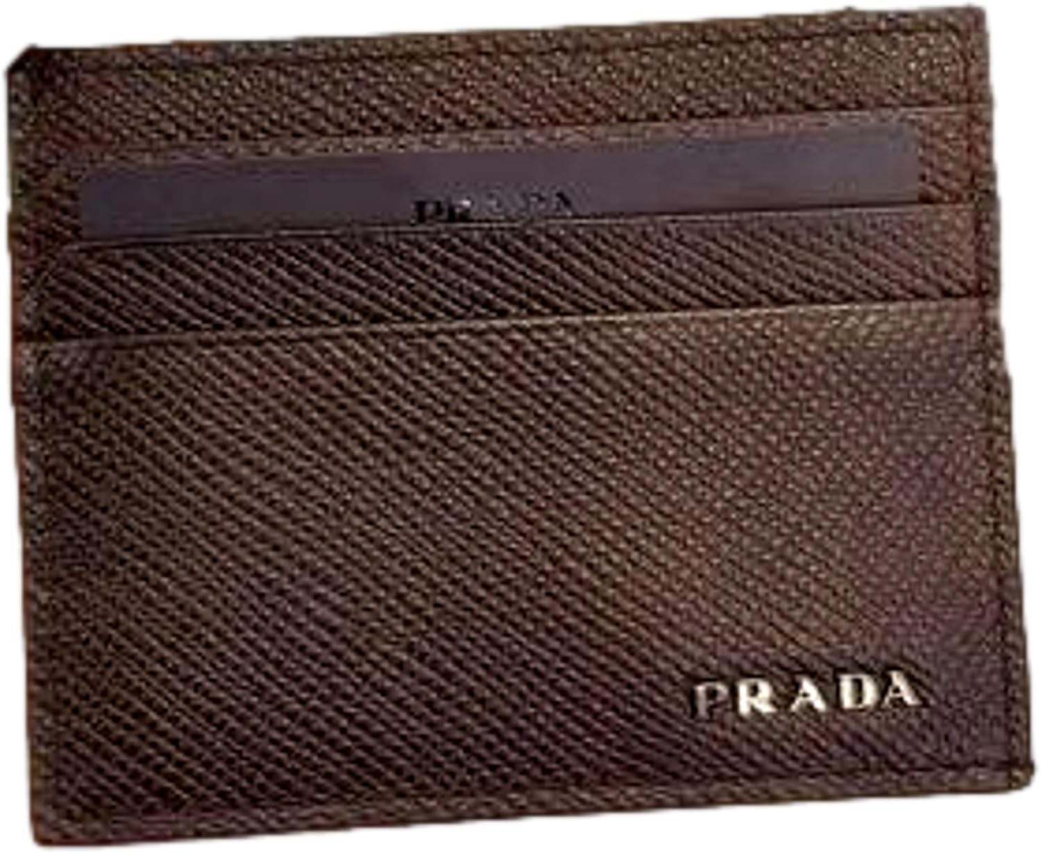 About this itemnThis stylish Prada card holder is the perfect addition to your everyday essentials. The iconic Prada logo is featured prominently on the front in silver metal. Beautiful rich brown color. With six slots for cards as well as one down the middle, there is plenty of storage for all of your needs. Its small size makes this leather card holder perfect to place in your pocket or bag. Made in Italy.nMiddle Slot Available – 6 Credit Card Slots – 1 interior Card SlotnModel 2MC223 – Dimensions: 4