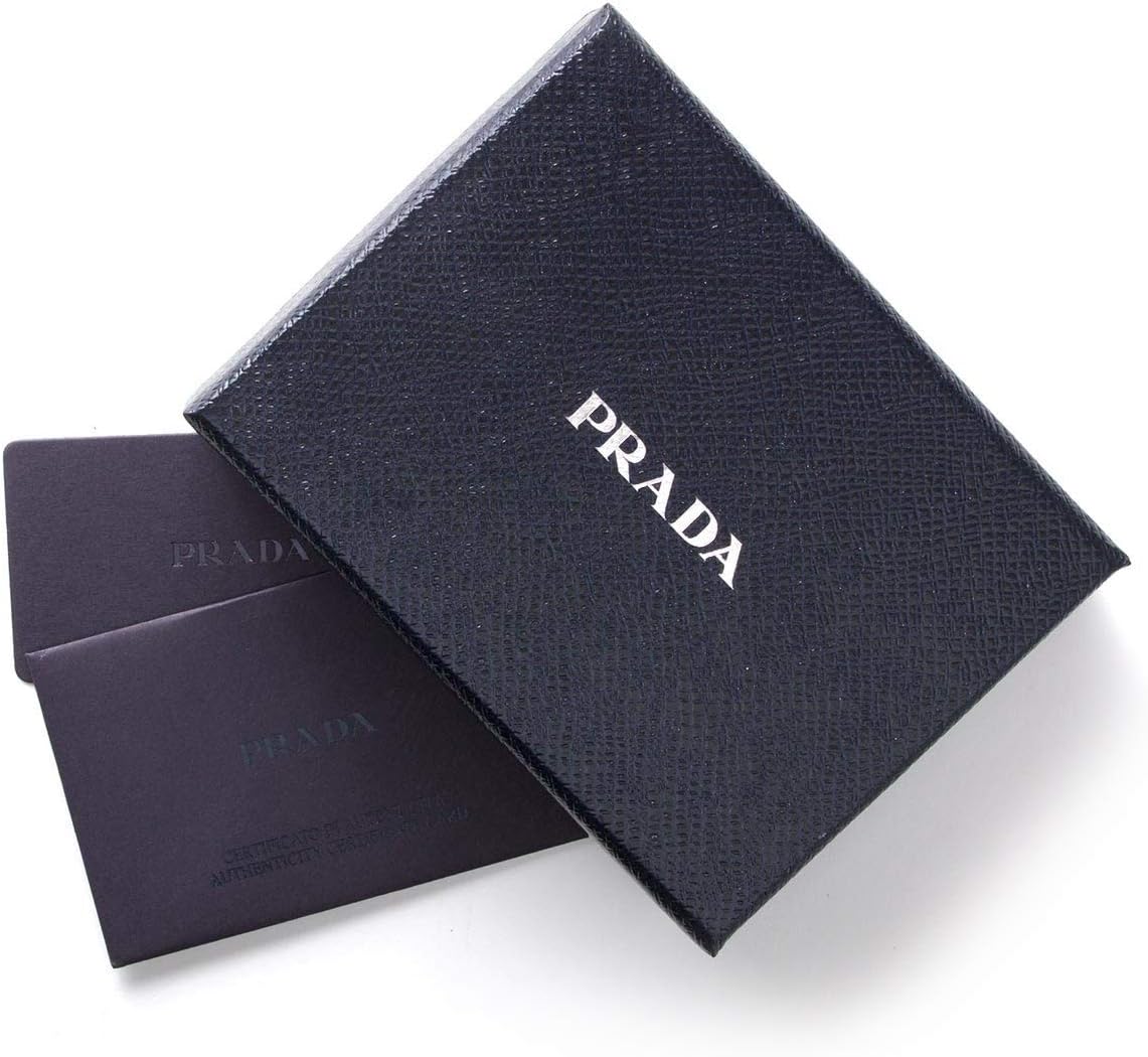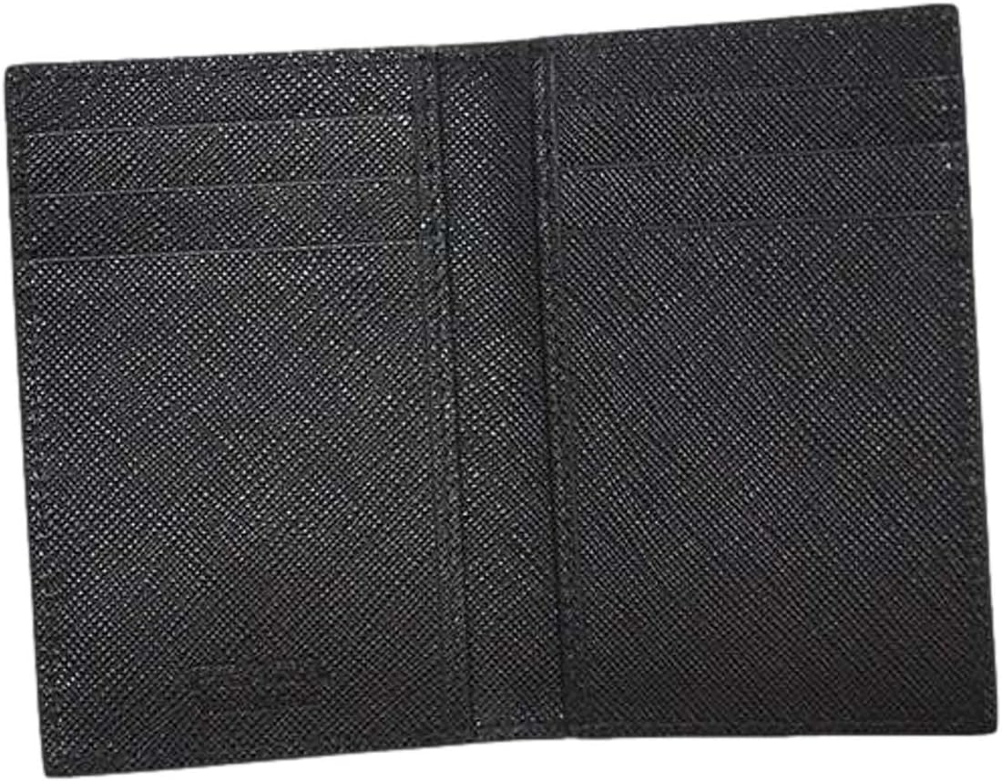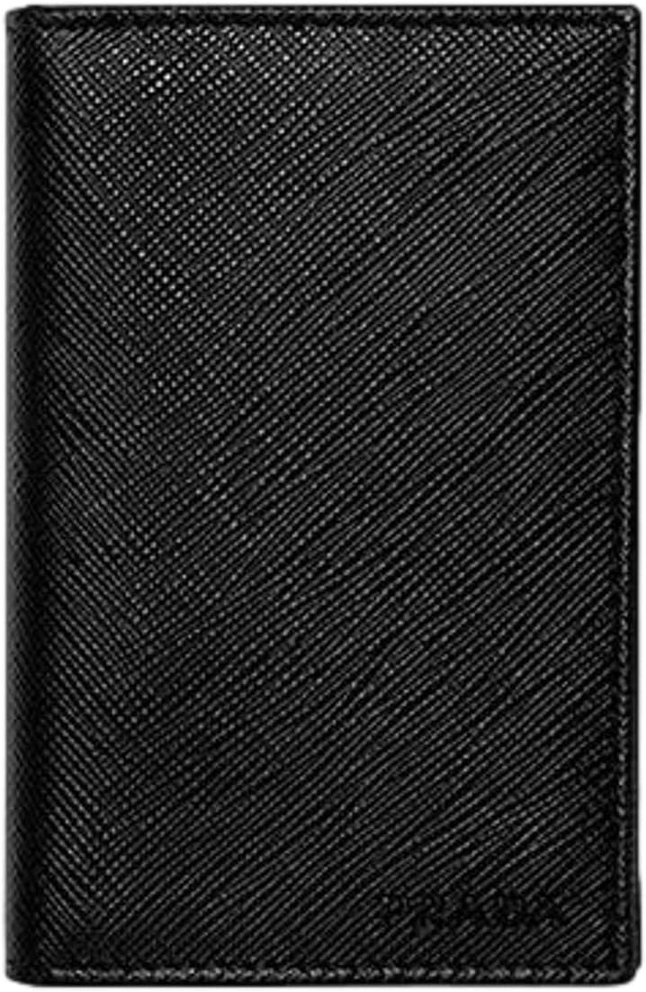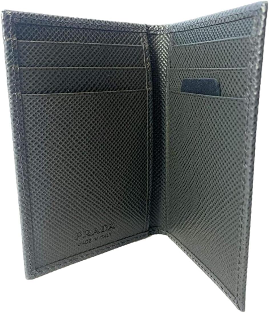 About this itemnThis Prada saffiano bifold vertical card holder, with its six credit cards slots and two bill slots, is the perfect wallet to hold your essentials. Its compact frame and light weight make it easy to slip in and out of your pocket.nModel: 2MC101nBlack Saffiano leather Embossed Prada logonSix credit card slots Two Bill compartmentsnMeasurements: 2.75 x 0.25 x 4.25