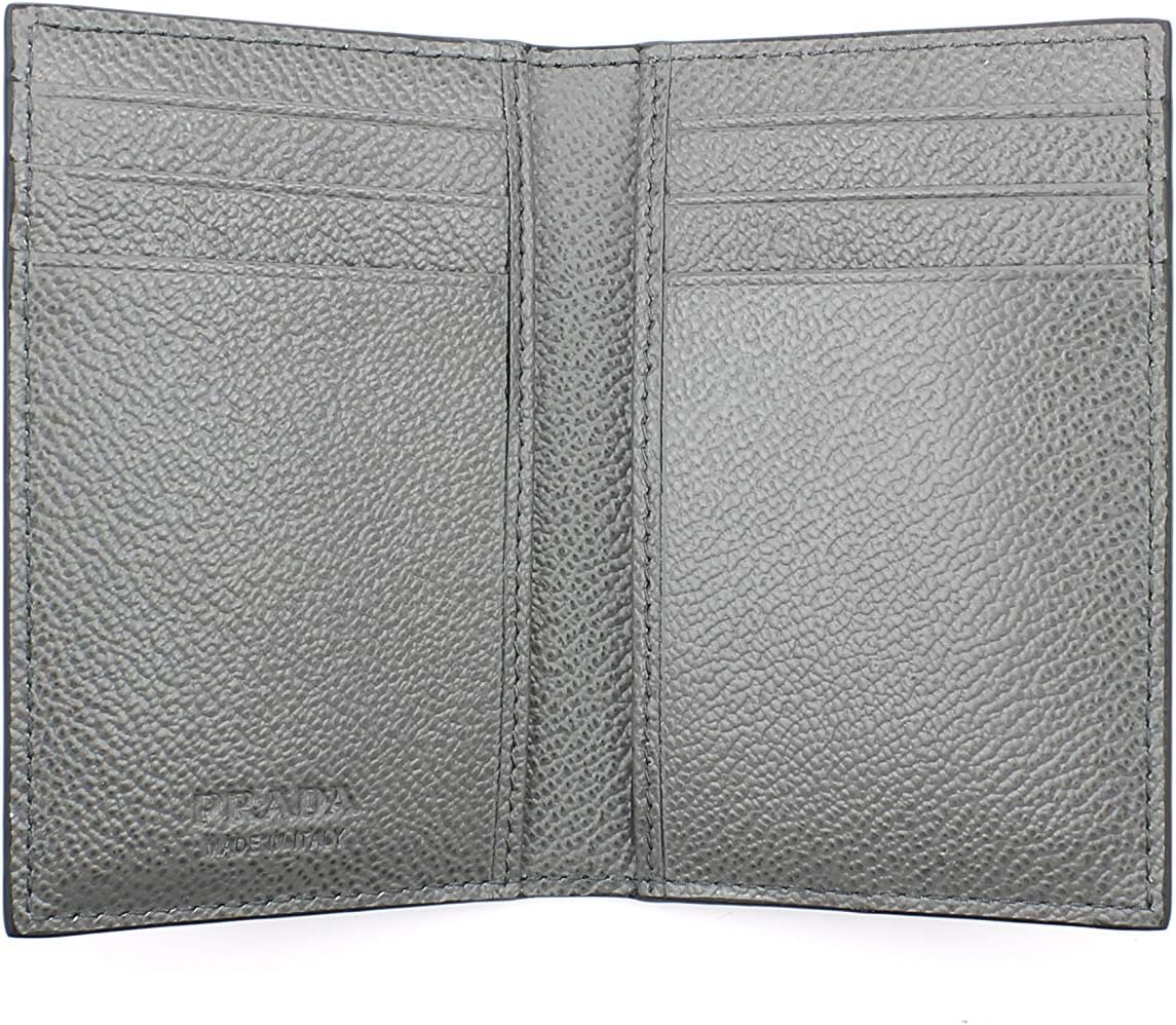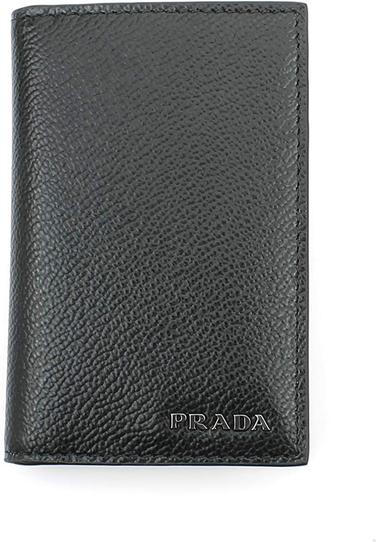 About this itemnCarry all your essentials in the Prada Men’s Vitello Micro Grain Black Leather Vertical Bifold Card Holder with silver Prada Logo.nThis Prada bifold vertical card holder, with its six credit cards slots and two bill slots, is the perfect wallet to hold your essentials. Its compact frame and light weight make it easy to slip into your pocket.nModel: 2MC101nBlack Vitello Grain Leather Silver-Tone Hardware Signature Prada Triangle LogonGrey leather interior lining Six credit card slots Two Bill compartmentsnMeasurements: 3