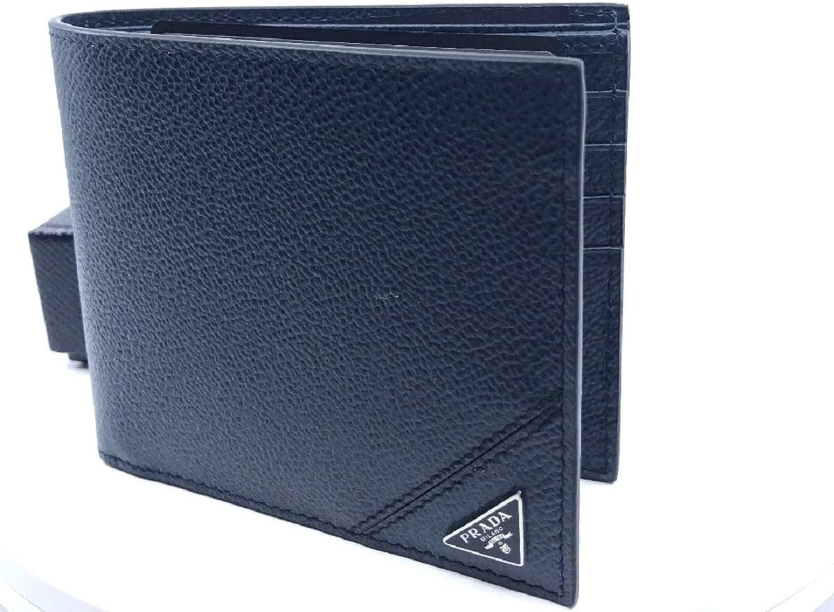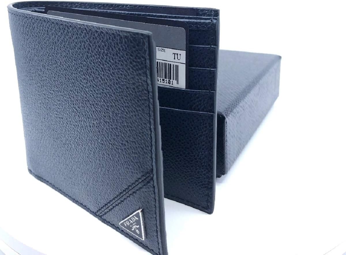 About this itemnThis black Prada wallet is a great addition for any man or woman. It is a universal wallet so it is great for any purse or back pocket. The smooth leather feels amazing to the touch. The design is sleek and stylish which makes it perfect for any outing.nModel: 2MO513nBlue Vitello Micro Grain LeathernEight Credit Card slots Two bill compartmentsnMeasurements: 4.5