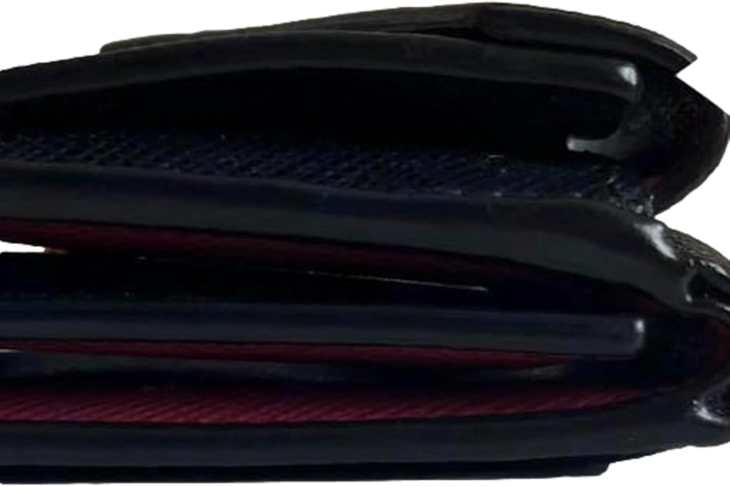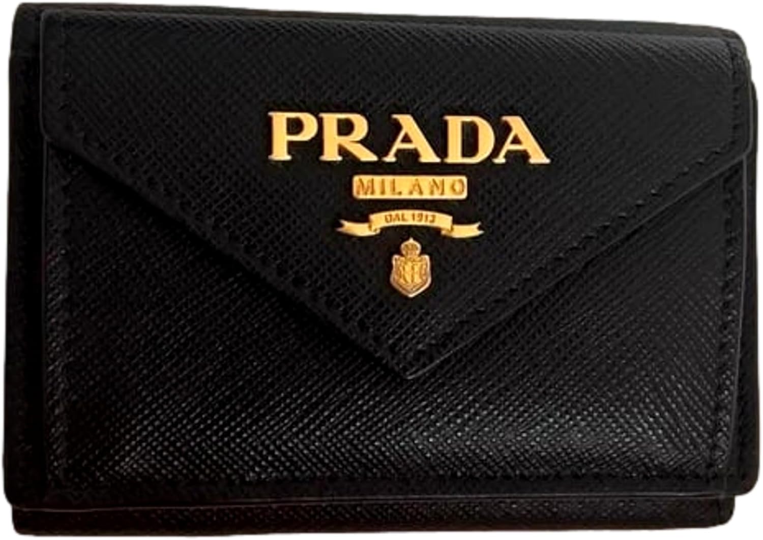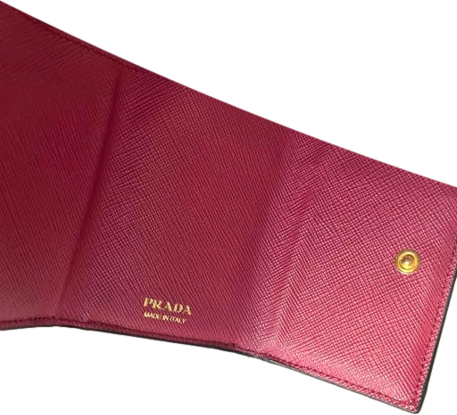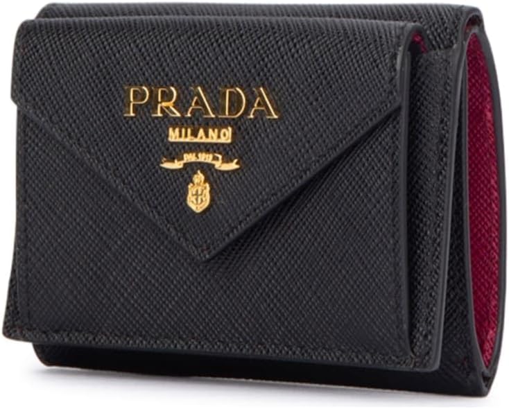 About this itemnThis classic Prada womens trifold envelope wallet is beautiful inside and out. Crafted in black saffiano leather the attention to detail is in the clean lines and minimal hardware. This trifold leather wallet features an envelope flap opens to a coin pouch with the iconic gold Prada metal emblem on the front.nIt is the perfect accessory to hold your cards and bills. When fully open there are 4 credit card holders and a coin pouch a separate bill container with snap closure.nModel: 1MH021nBlack and Pink Saffiano LeathernFront Coin Pouch Three Credit Card Slots One Bill CompartmentnMeasurements: 4.5