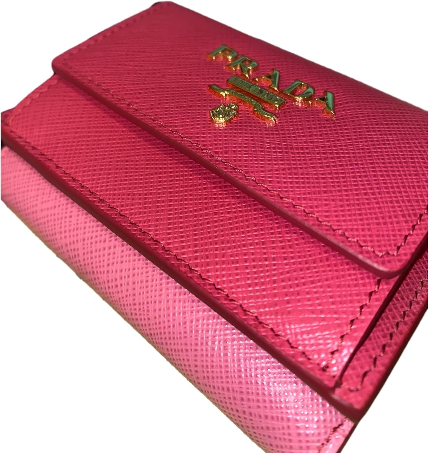 About this itemnThis classic Prada womens trifold envelope wallet is beautiful inside and out. Crafted in pink saffiano leather the attention to detail is in the clean lines and minimal hardware. This trifold leather wallet features an envelope flap opens to a coin pouch with the iconic gold Prada metal emblem on the front.nIt is the perfect accessory to hold your cards and bills. When fully open there are 4 credit card holders and a coin pouch a separate bill container with snap closure.nModel: 1MH021nPink Saffiano LeathernFront Coin Pouch Three Credit Card Slots One Bill CompartmentnMeasurements: 4.5
