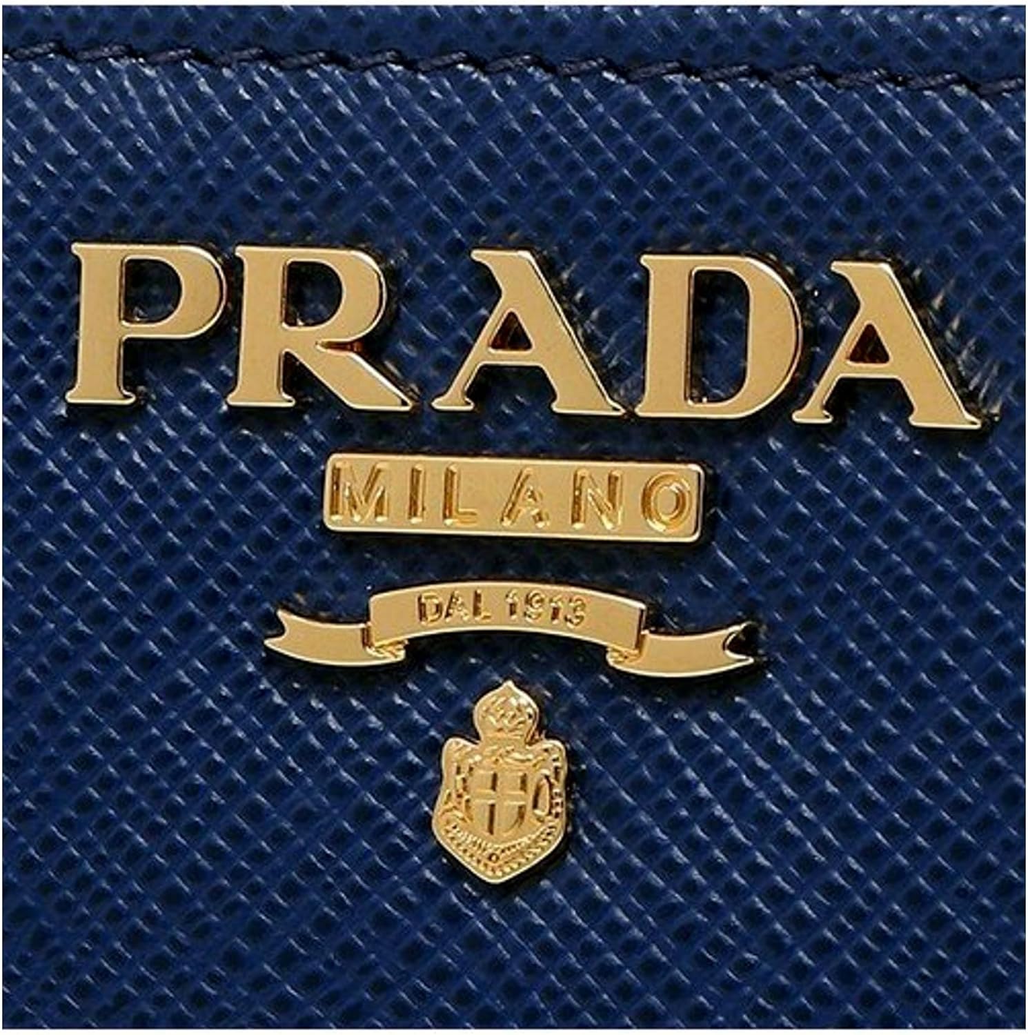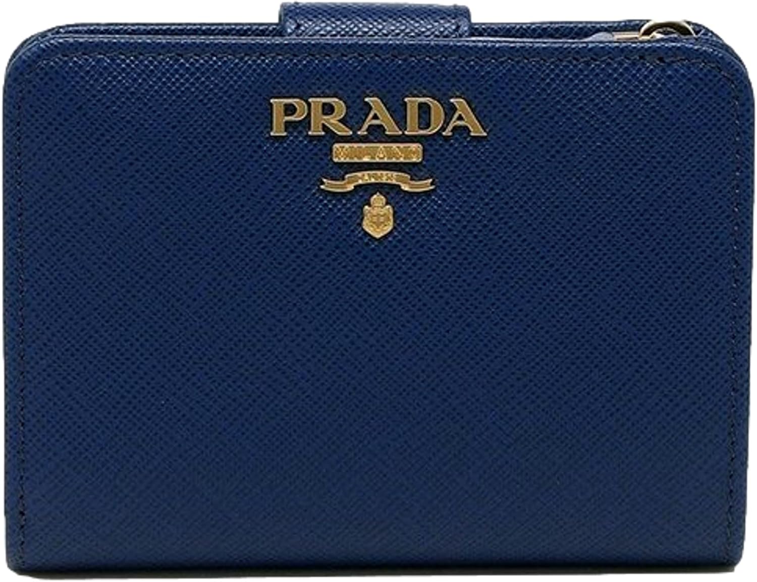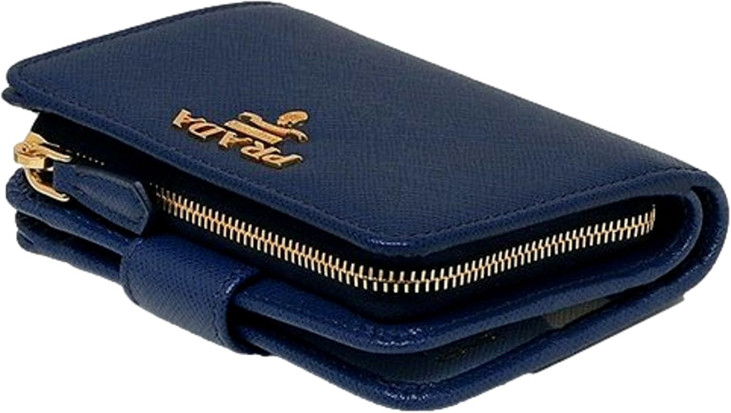 About this itemnThis sleek Prada wallet is perfect for everyone. Its size allows it to easily be thrown in a bag, while holding all the essentials. The combination of a change purse and bifold wallet with many card slots makes this wallet multipurpose and multi-functional.nModel: 1ML018 Color: Blue Saffiano Leather textured leather Gold-Tone HardwarenZip and Snap Closure One bill Compartment Eight credit card slotsnMeasurements: 4.75