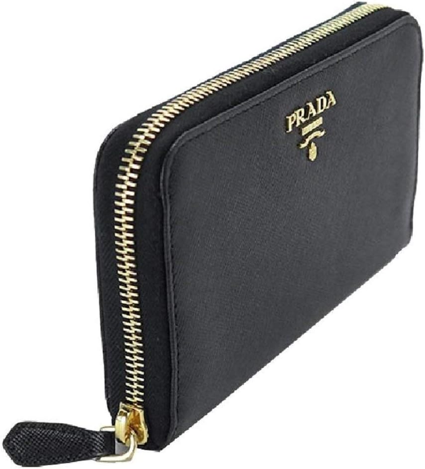 About this itemnThis wallet from Prada is crafted from black saffiano leather with gold-finish hardware. With 4 billfold compartments, 4 credit card slots, and a coin compartment, you can carry all your essentials in this compact size. Fashion meets function with this classic Prada wallet.nModel: 1ML157nBlack Saffiano Cuir Leather Gold-tone HardwarenFull Zip Closure Exterior Zip Pocket Four Credit card Slots Four bill compartments One Coin CompartmentnMeasurements: 6