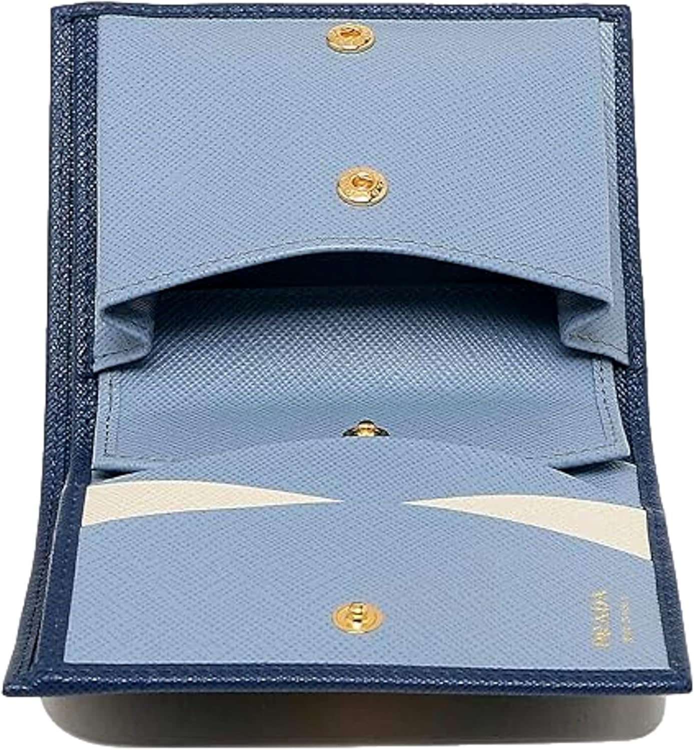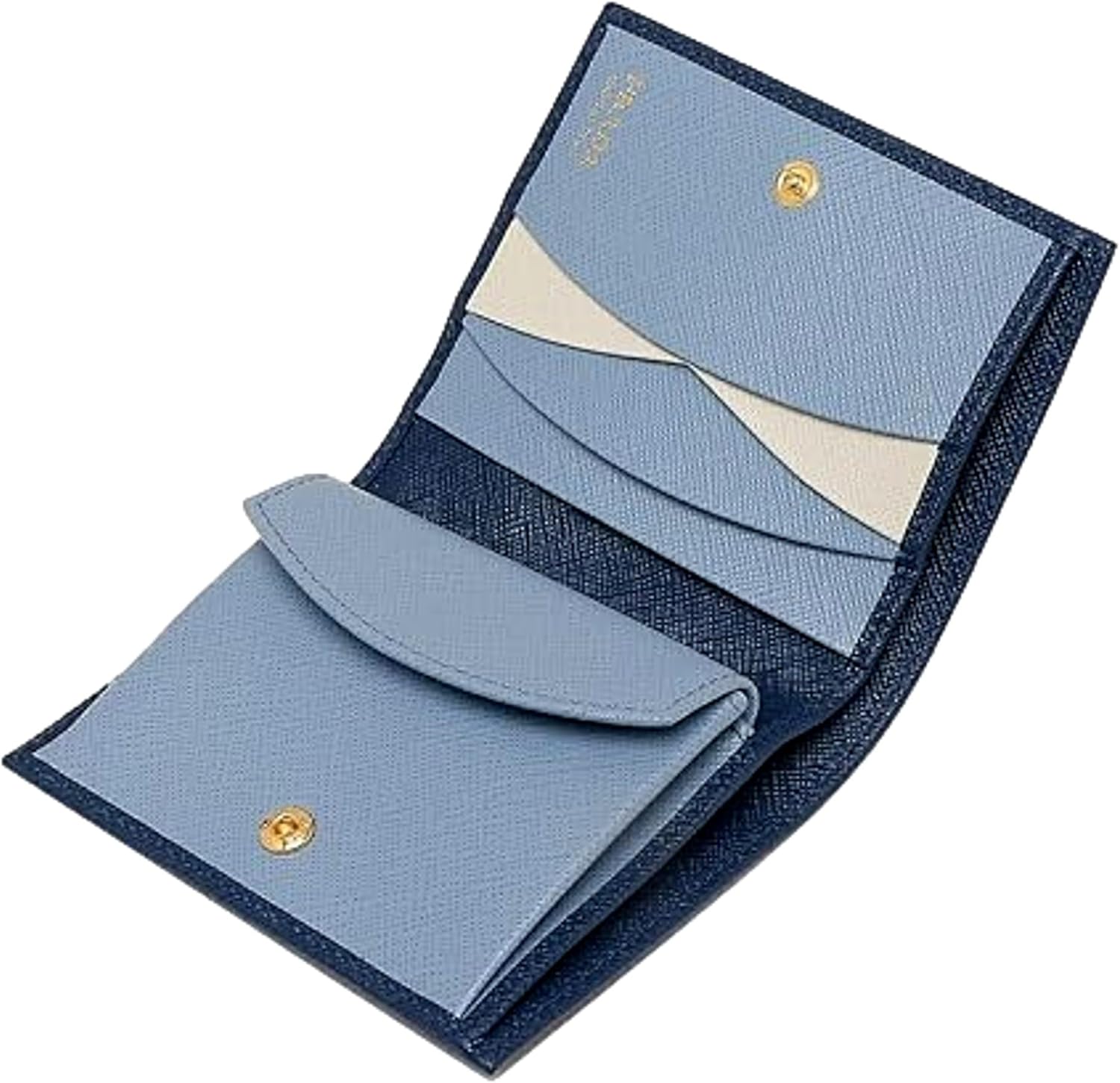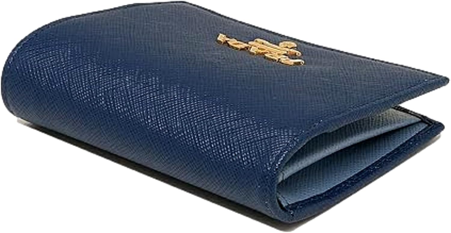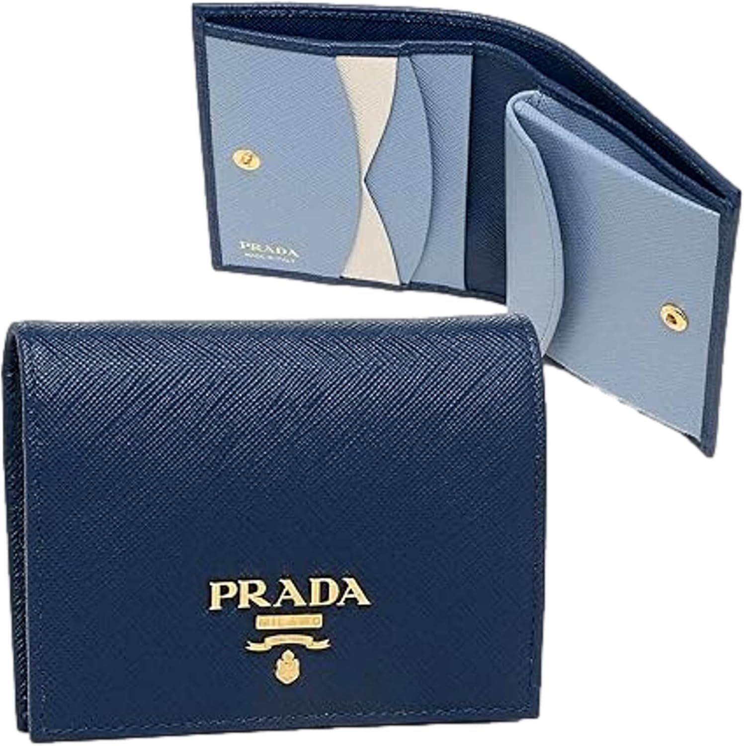 About this itemnPrada Women’s Saffiano Multi-Color Folding Wallet in Bluette and Astrale is a stunning accessory that exudes sophistication and style. Model: 1MV204nCrafted from high-quality Saffiano leather, this wallet features a vibrant combination of rich blues, adding a modern touch to its classic design.nFolding style opens to reveal multiple card slots, a bill compartment, and a snap closure coin pocket, offering both organization and convenience. 1 coin pouch, 1 bill compartment, 2 open pockets, 3 card slotsnLuxurious interior is lined with soft leather, ensuring durability and elegance. Dimensions:(W x H x Thickness): Approx. 4.5 x 3.5 x 1.2 inchesnThe iconic Prada logo is subtly embossed on the front, showcasing the brand’s commitment to quality.nSleek silhouette and chic color palette, this wallet is perfect for the fashion-forward woman who appreciates both functionality and flair. Made in Italy