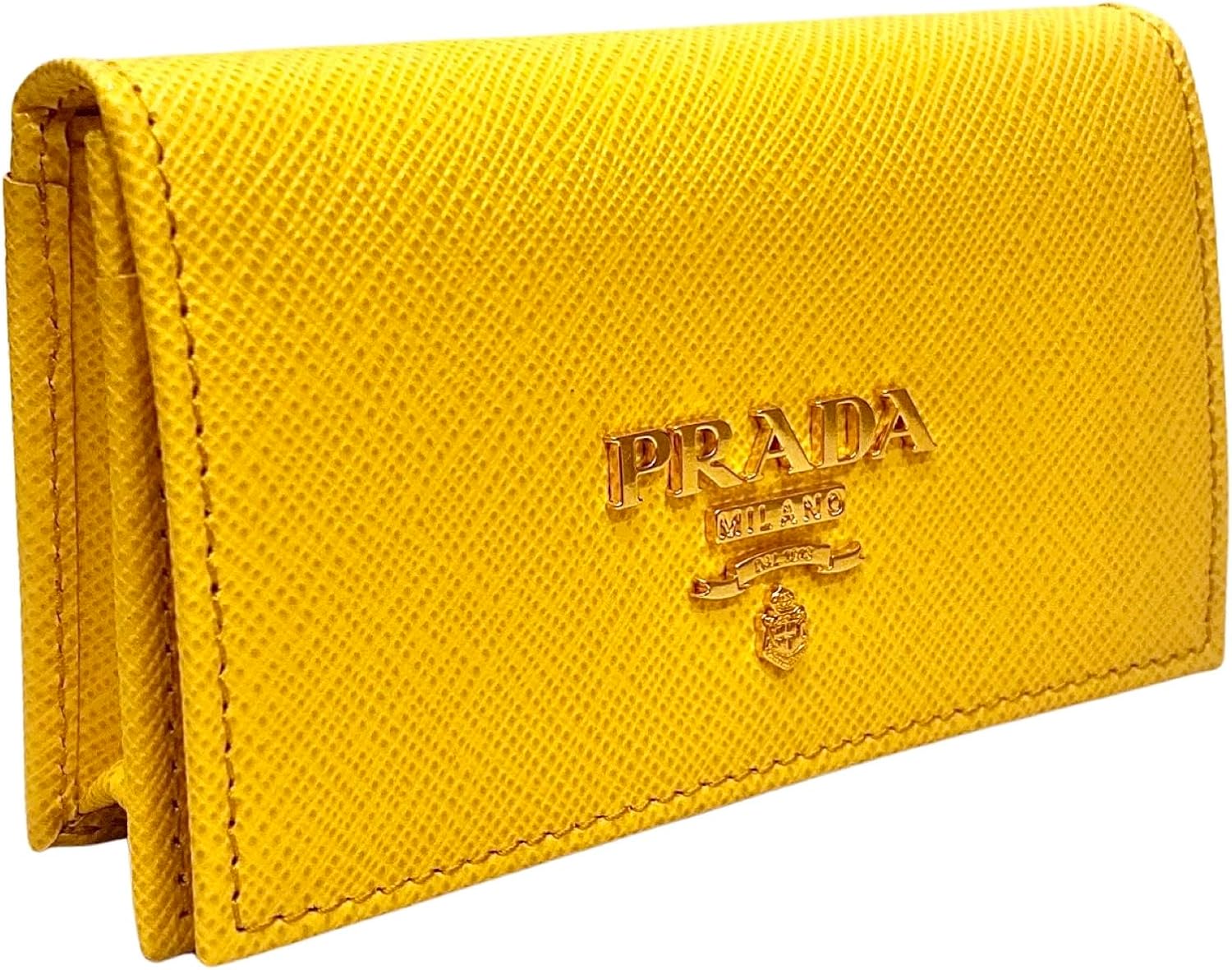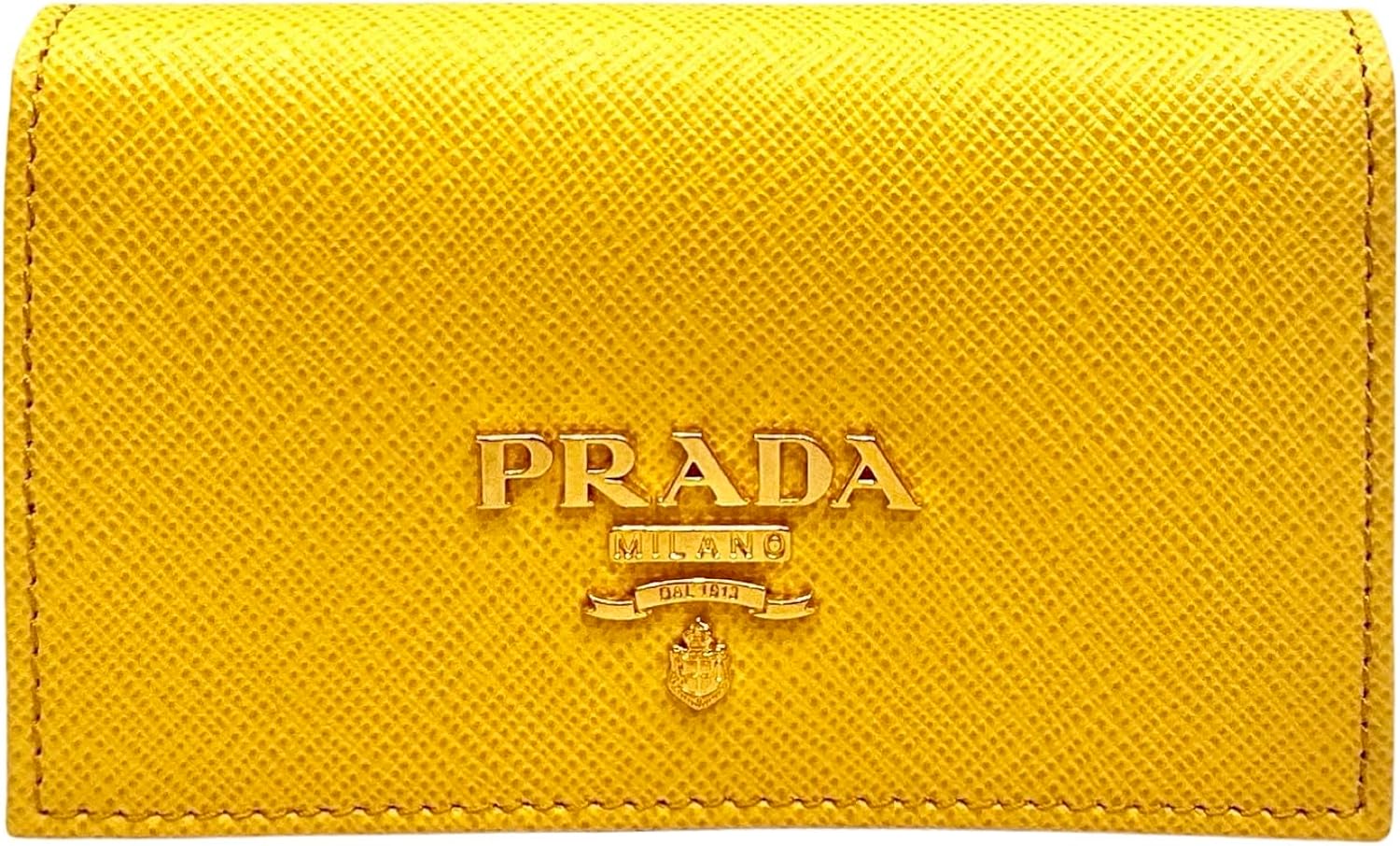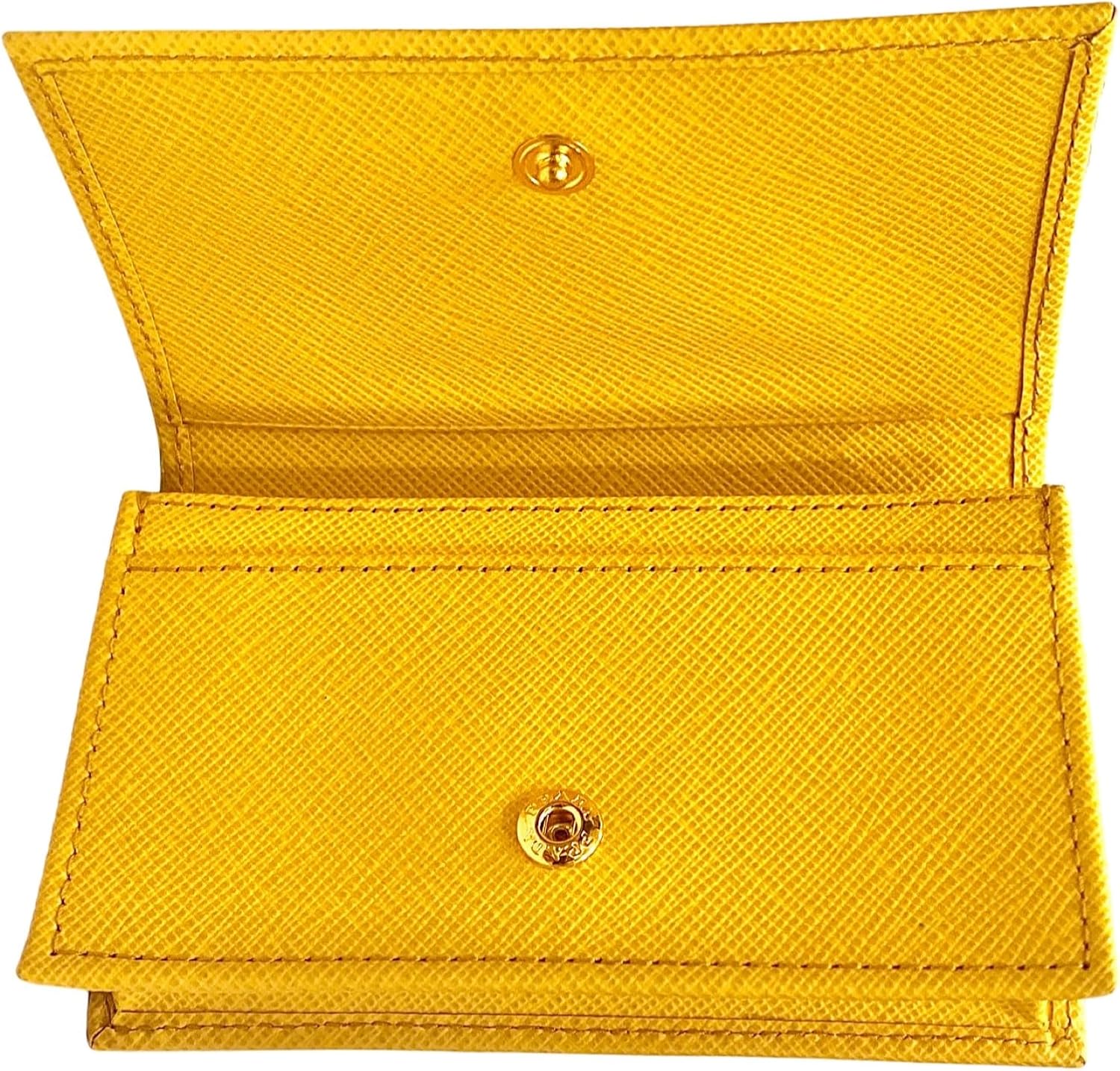 About this itemnThis vibrant yellow Prada card holder is an effortlessly chic way to store credit cards, business cards, coins, and small objects. The wallet’s conveniently small size makes it easy to keep in your purse or pocket. Three card slots and a main pocket mean organizing is a breeze. Authenticity guaranteed and Prada box included.nModel: 1MC122nYellow Saffiano Leather Gold-tone hardwarenSnap closure Card holder/walletnMeasurements: 4.5