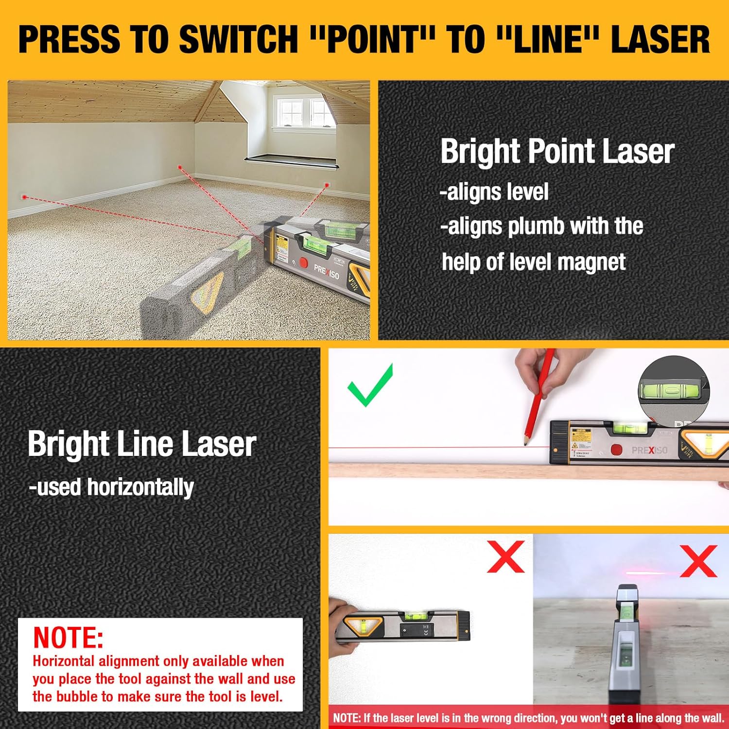PREXISO 2-in-1 Laser Level 12 in Spirit Level with Light, 100Ft Alignment Point & 30Ft Leveling Line, Magnetic Laser Leveler Tool for Construction Picture Hanging Wall Writing Painting Home Renovation