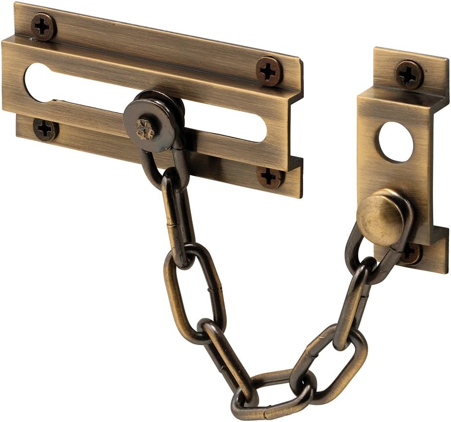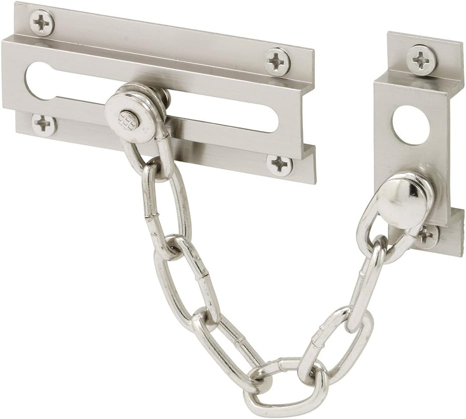 About this itemnSECURITY LOCKING DEVICE –This U 10304 Chain Door Guard is a security locking device for doors, allowing a door to be slightly opened to allow safe viewing and ventilation.nCHILD-SAFE SECURITY DEVICE – This door chain lock can also be installed out of reach of children so they cannot open the door by themselves, providing additional child-safe door security.nEASY INSTALLATION – Installation is quick and easy – additional security for your home or office doors are within reach! Installation fasteners are included.nDURABLE CONSTRUCTION – This chain door guard is constructed of extruded brass with a satin nickel plated finish and a 6 inch, 8-link welded steel chain It’s strong and durable and sure to last.nPRODUCT INFO – The 3-5/16 inch U 10304 Chain Door Guard can be used on a variety of door types and can be placed over or beside door casing. It features a 6 inch long, 8-link welded steel chain and all installation fasteners necessary for complete install.nNOTE – Please refer to the line art for dimensions and compare with your needs before orderingn› See more product details