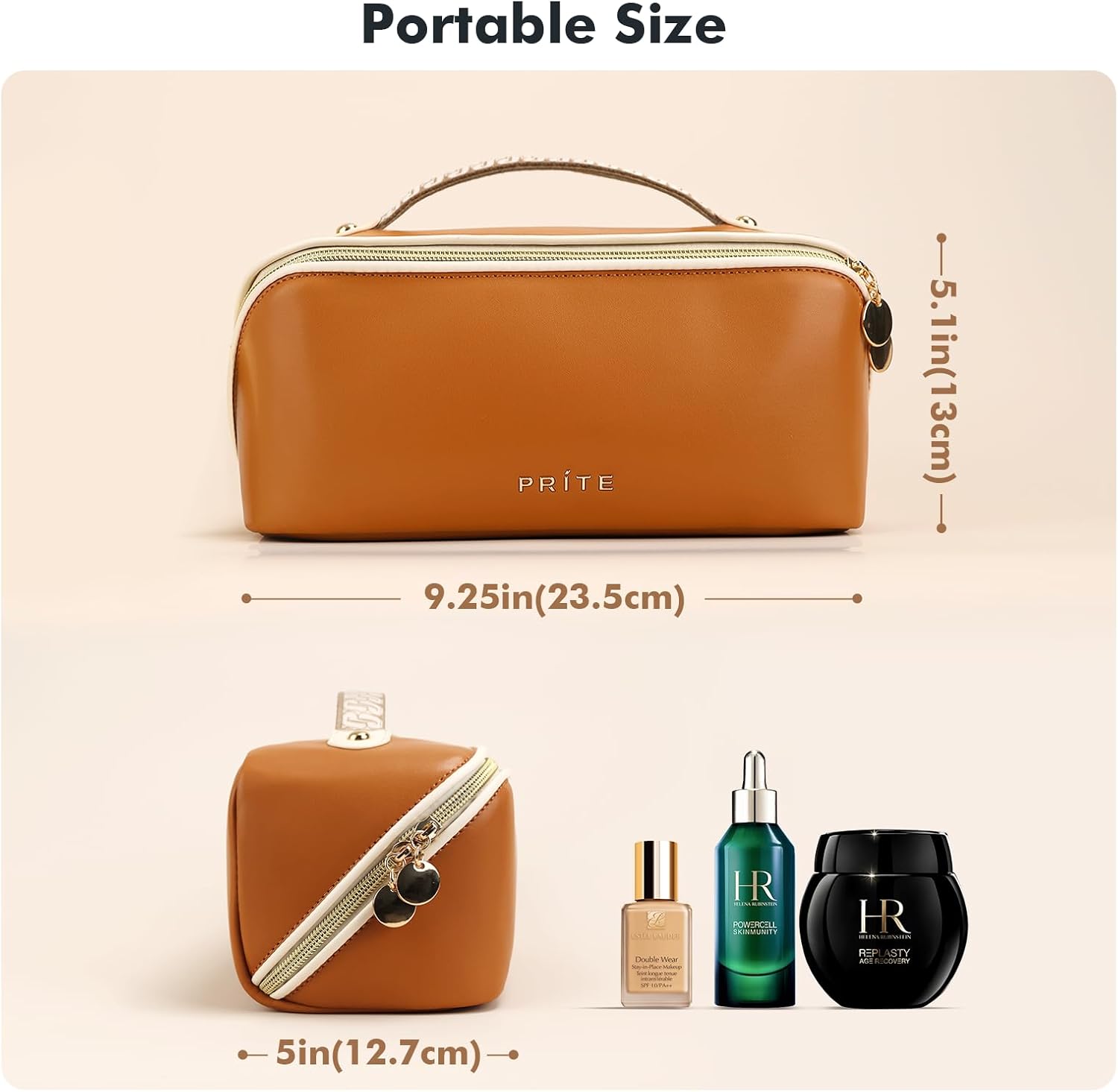 ?Generous Storage Capacity?Enjoy ample storage space with our makeup bag, measuring 9.25*4.9*4.9 inches. Designed for personal travels, this spacious bag comfortably fits all your cosmetics and toiletries. Crafted from high-quality PU material, it offers a soft, lightweight, and durable construction.n?Convenient design & durable materials?Say goodbye to rummaging through your makeup with our innovative Flat makeup bag. The unique design allows it to open flat, providing easy access to all your products at once. Simply scrunch it closed when you’re ready to hit the road.Premium waterproof PU leather material is strong and durable. It features a stylish woven pattern and color clashing design that is easy to clean and protects your items from moisture.n?Details that Elevate Your Beauty Routine? This makeup bag is equipped with custom gold metal zippers and pulls, making closure effortless and adding a touch of elegance to your daily routine. The reinforced leather straps ensure durability and ease of carrying. The brand new 3D TPU logo adds a stylish touch. Inside, there is a separate inner pocket for orderly storage of your cosmetics.n?Multifunctional Makeup Travel Bag?Our multifunctional makeup travel bag is a versatile companion for any traveler. Whether you’re on a business trip, vacation, or outdoor adventure, this portable bag can also double as a toiletry bag, purse, or bathroom accessory. It’s the perfect all-in-one solution for your beauty needs.n?Service?Experience premium shipping with our meticulously packed makeup bag. Internal bubble padding ensures that your bag arrives in pristine condition, free from creases or deformations during transit. You’ll be impressed with our products!