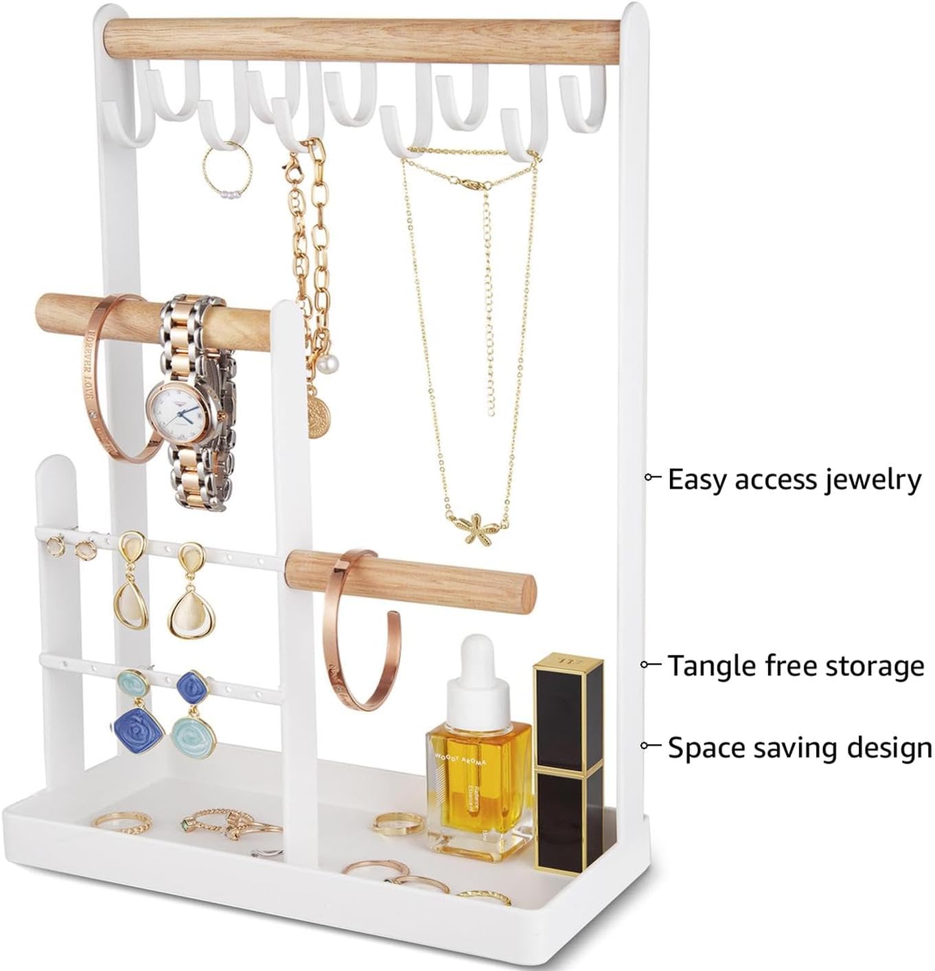 About this itemnCame Fully Assembled- No need to install; Dimensions: 7.87 x 3.94 x 12.6 inches, not too wide or bulky, doesnt take up too much space on your table and keep everything in one spot neat & organizedn4-Tier with Tray Design- Can hold a dozen bracelets along with several rings and necklaces, so much easier and faster to see what you have, accessing everything very easily unlike jewelry box; No more tangled necklaces or hunting for a matching earringnSturdy and Stable- The metal structure with padded bottom for sure helps keep all your piece safely hung, perfectly storing and organizing earings, necklaces, rings, bracelets, etc. Easier to pair things togethernDecorative- Metal construction body and 100% natural wood, will look so sleek on your vanity, dresser top or bathroom counternA Perfect Gift- Ideal for your better half, girlfriend, daughter, mother and friends in many kinds of festivals, such as Valentine’s Day, Mother’s day, Thanksgiving, Birthday, Christmas and etc.n See more product details