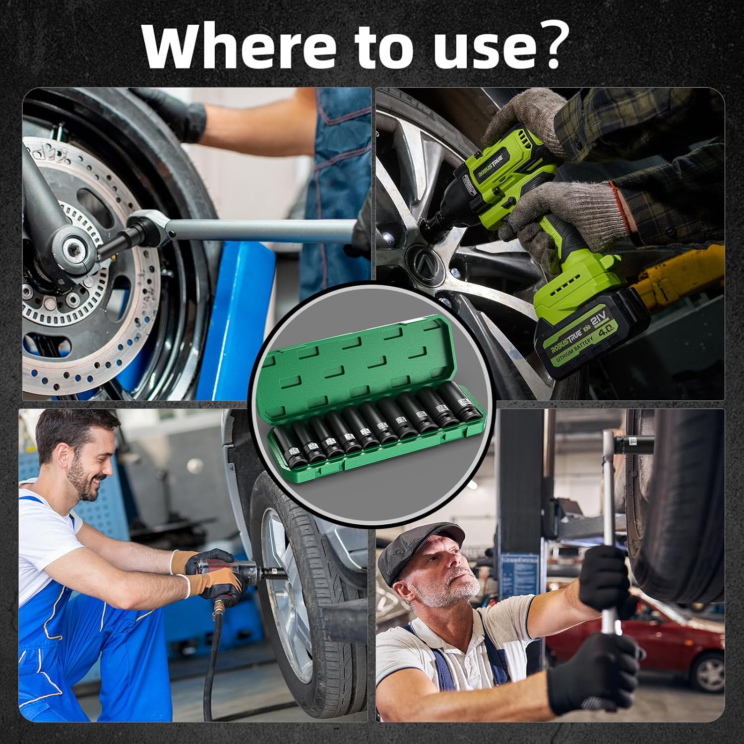 About this itemn?Complete Metric Socket Solution?Our comprehensive Robustrue Socket Set Wrench kit covers sizes 10-12-13-14-16-17-19-21-22-24mm, ensuring you have the right tool for any bolt or nut in automotive, household repairs, or DIY projects.n?Quick-Release Mechanism? The quick-release button on the ratchet handle ensures smooth socket changes, allowing you to quickly switch sizes without losing momentum on the job.n?Ergonomic Design for User Comfort? The set includes a rugged, easy-grip wrench handle that fits all sockets, providing a non-slip hold even with greasy hands and minimizing hand fatigue during extended use.n?Premium Chrome Vanadium Steel Construction? Engineered with high-strength chrome vanadium steel, each socket offers exceptional durability and wear resistance, ensuring a lifetime of reliable performance and accurate fits.n?Durable Storage Case Included? Keep your sockets organized and protected with our sturdy, compact storage case. Each socket is neatly labeled and securely held in place, ensuring theyre always ready when you need them and easy to transport wherever your projects take you.nTrust Robustrue for precision tools that ensure the success of every project.n See more product details