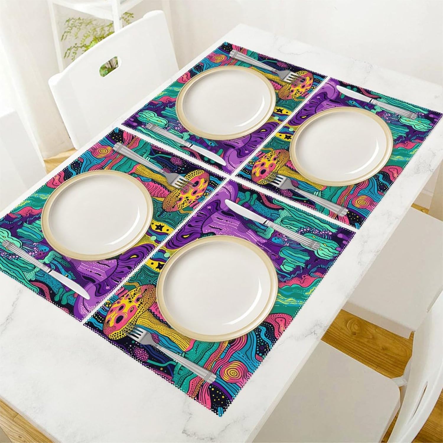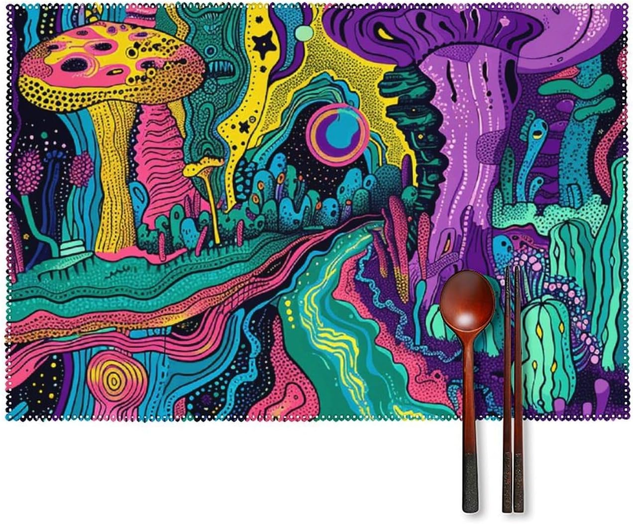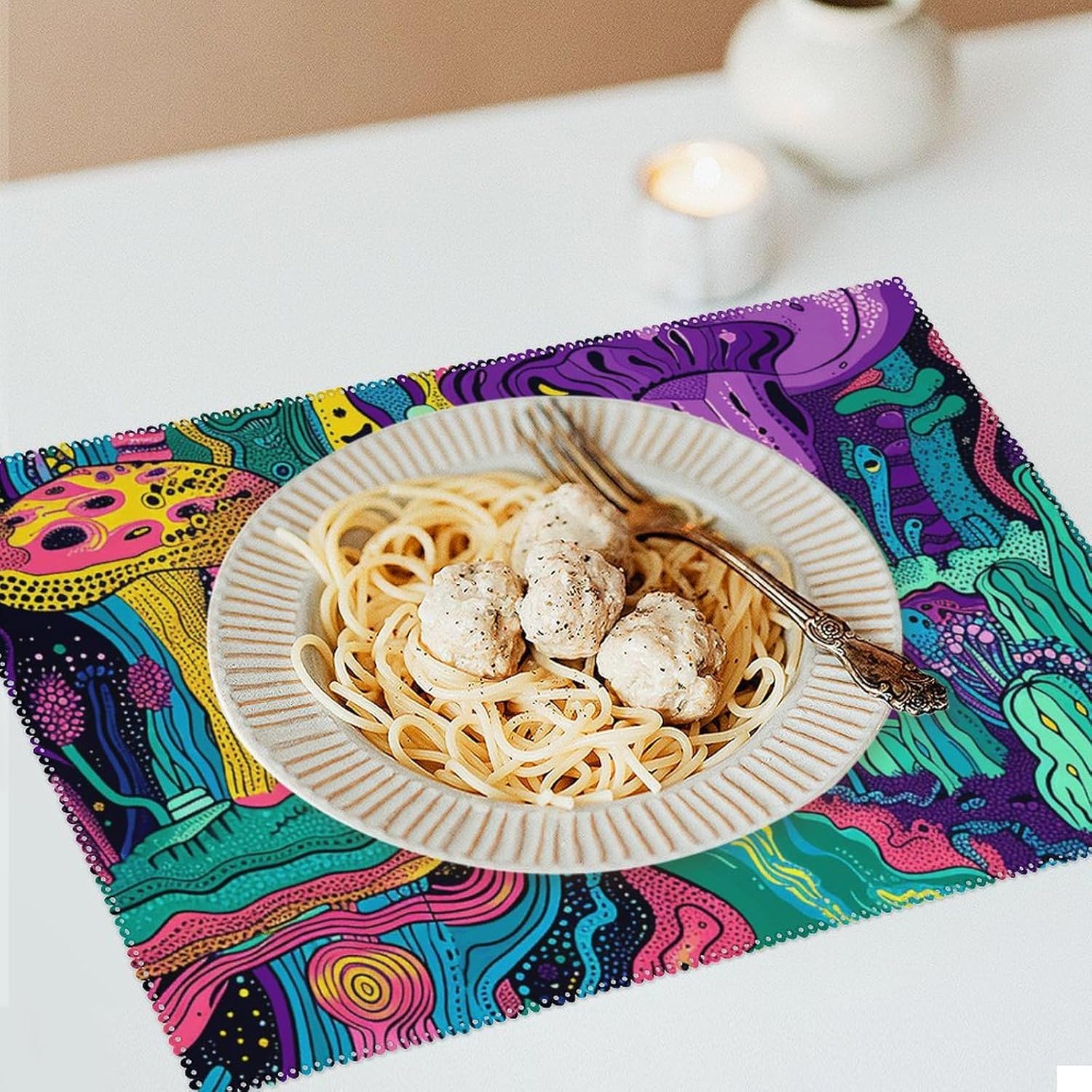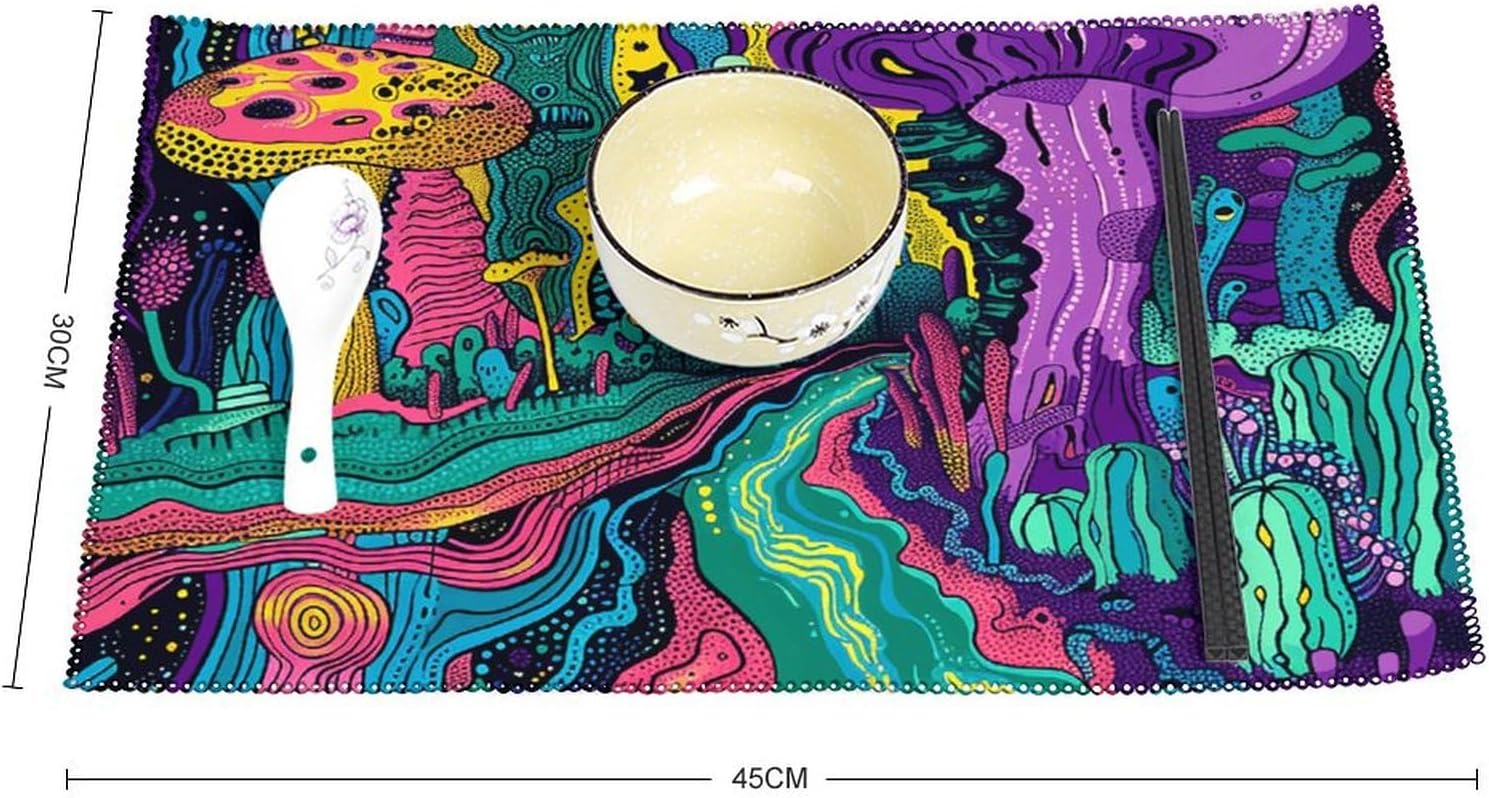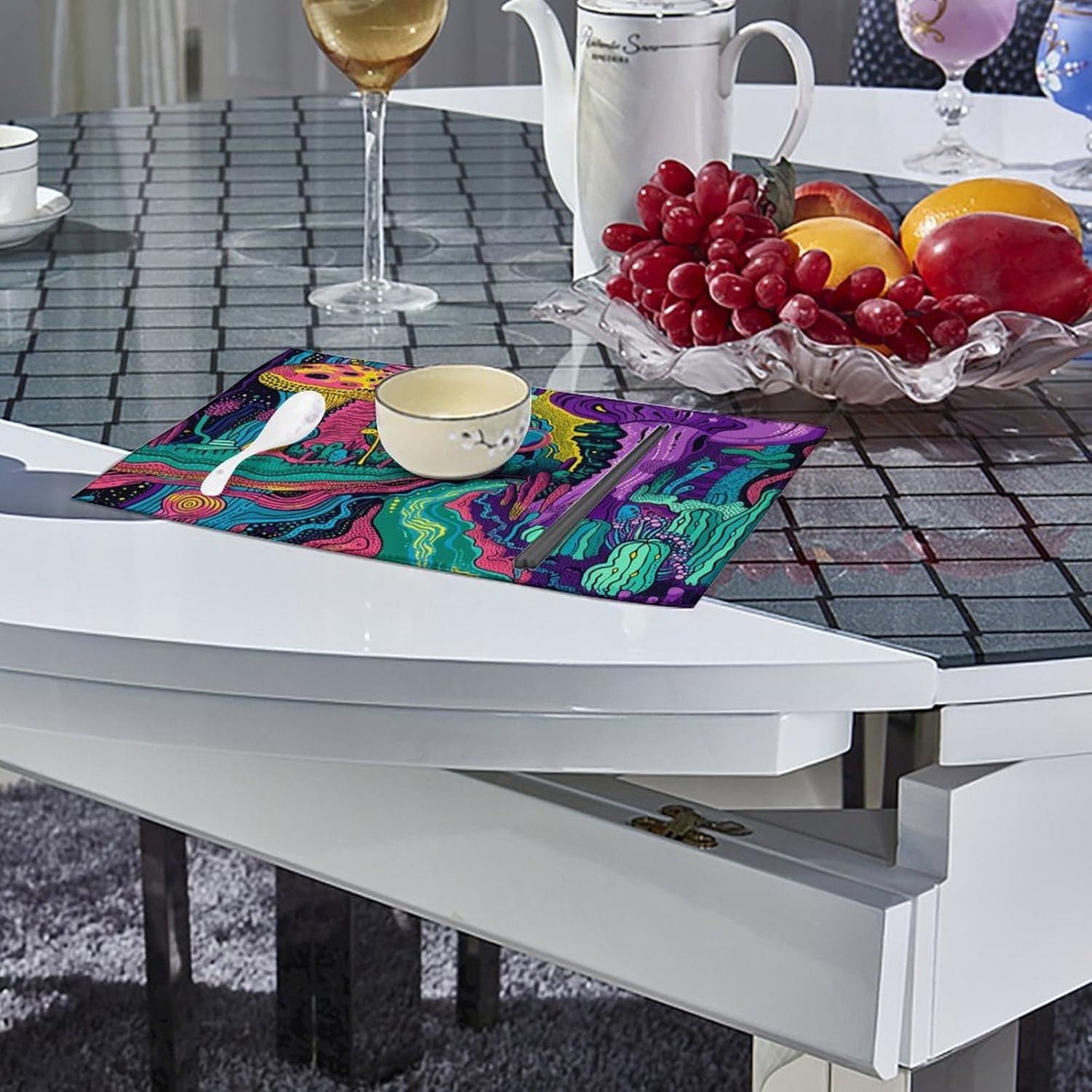 About this itemnPerfect Protection: Crafted from high quality canvas fabric, the Psychedelic Style Lines table protector is thick, protecting your tables and furniture from hot dishes, stains and scratches.They provide a non-slip surface, resist fading, and are easy to clean, elevating your dining experience.nMeasurements: Each package includes 4 pieces of placemats measuring 17.7 x 11.8Inch.If there is any problem,please contact us, our customer support team is always ready to help you. It is suitable for all hot drinks and plates, protect your dining table from scalding.nGreat Gift Idea: The stylish placemats set makes s great housewarming, wedding or birthday gift. They are quality assured, practical, stylish, and add a touch of elegance to any home. Add style to your dining setting while ensuring table protection.nVersatile Uses:Our placemats can be used as nice accessories to match your different decor purposes such as table mats, pot holders, coasters, laptop pads, etc. The rustic and neutral design fits any occasions and helps to create a warm and inviting atmopshere.nEasy to Care: Hand wash with warm soapy water or wipe dry directly; do not wash in a washing machine or use steel balls or something very difficult to clean.They provide a non-slip surface, resist fading, and are easy to clean, elevating your dining experience.