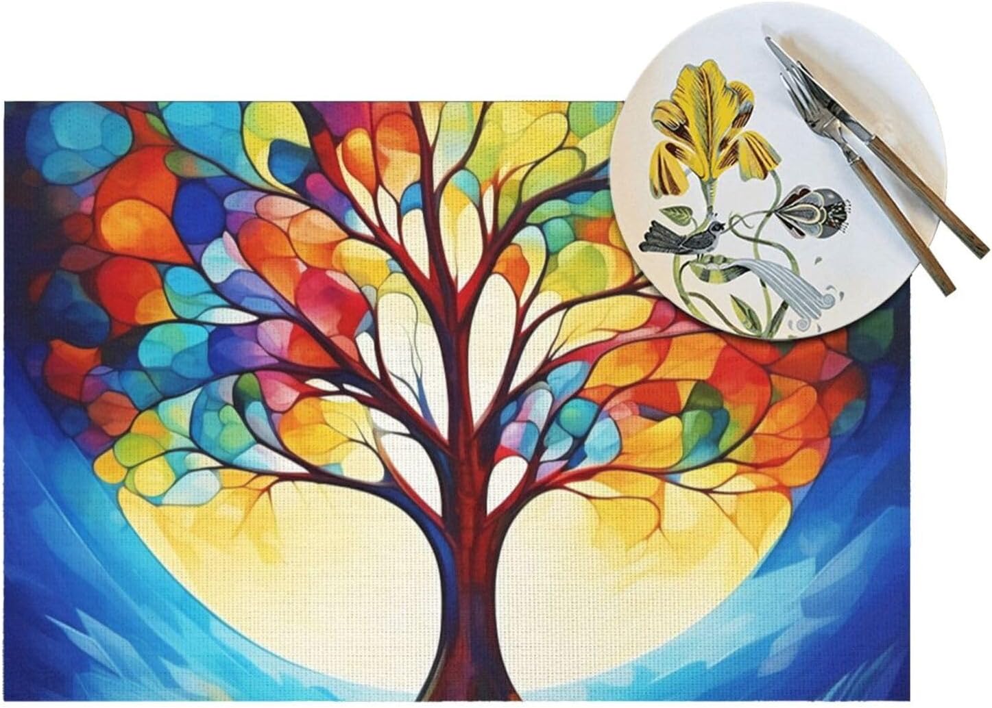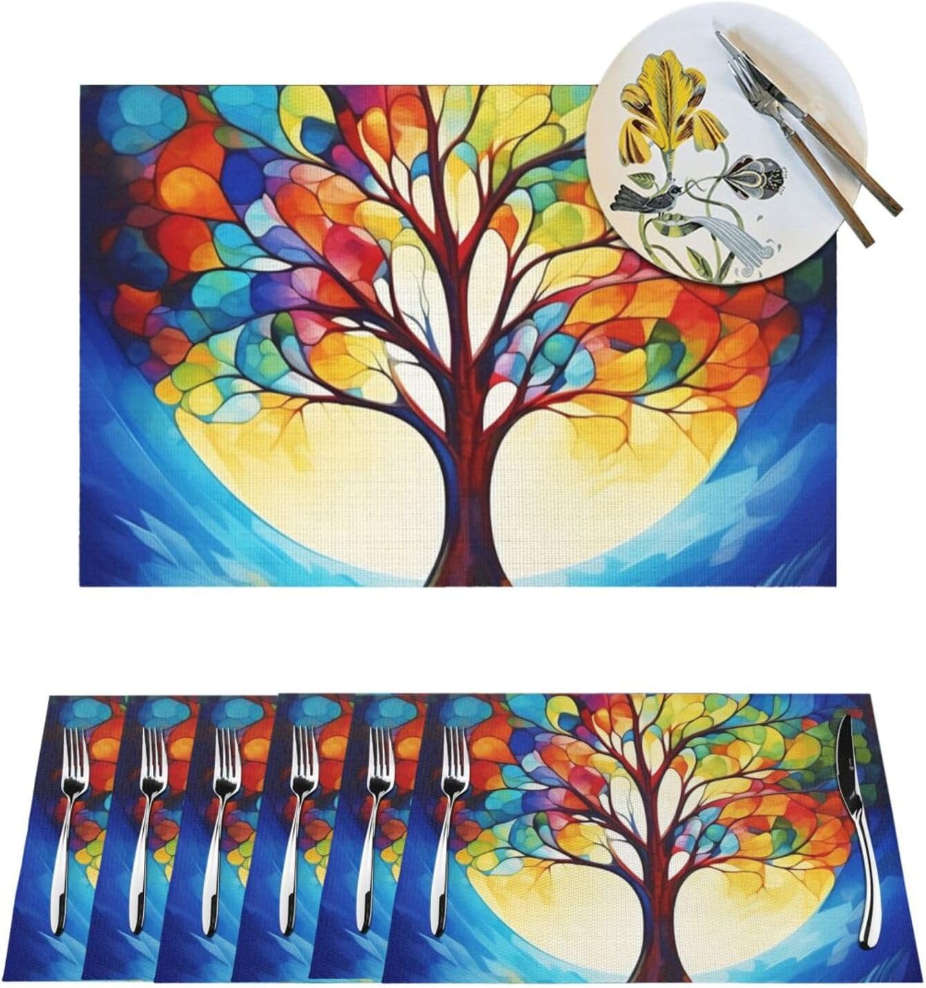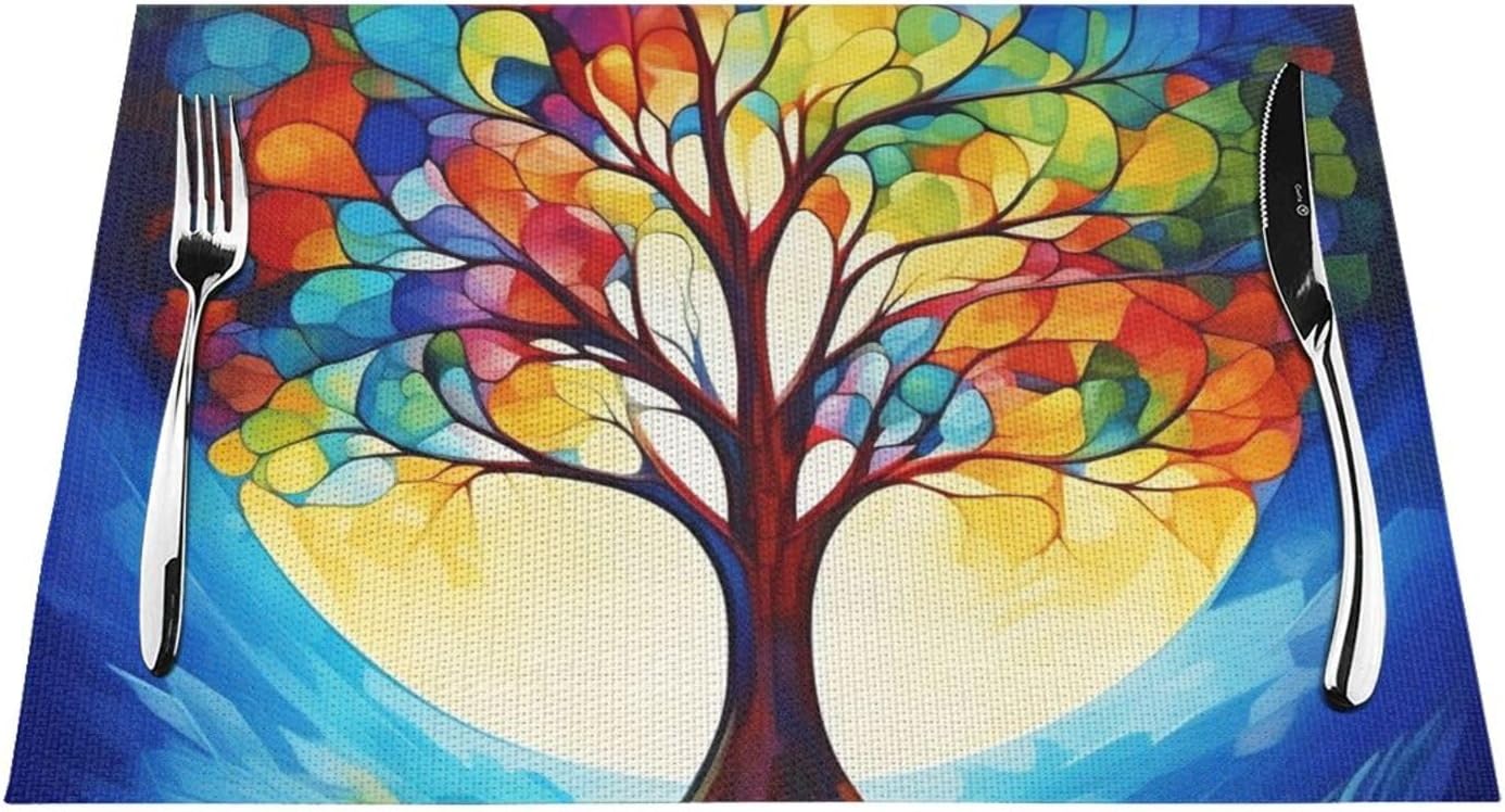 About this itemnFarmhouse Placemats: These meal mats can be easily cleaned by gently wiping with a damp cloth and storing them in a dry place. A set placemats and coasters not only add style to your living room and home but also protect your table. Elevate your table with these, adding both charm and practicality to your dining experience.nElegant and Practical Design: With a luxurious vinyl woven texture, precision cutting, and heat-trimmed edges, our double-sided placemats offer a sophisticated and practical solution. They provide a non-slip surface, resist fading, and are easy to clean, elevating your dining experience.nProtects Your Table: Keep your table safe from scratches and spills with our Colorful Tree of Life Table Mats heat-resistant placemats. They can withstand temperatures up to 176?(80?) and help keep food warm. Add style to your dining setting while ensuring table protection.nPremium Quality and Durability: Our Colorful Tree of Life place mats are crafted from a superior blend of PVC and Polyester, ensuring exceptional quality and long-lasting durability. Its luxurious texture only gets softer with each wash, making it a long-term investment in both comfort and style.nVersatile for Any Occasion: These linen table placemats are not just a table accessory; it’s a statement of elegance. Whether you’re setting up for a casual family dinner or a formal celebration like birthdays, weddings, Fall, Thanksgiving, Christmas, or any celebration, these Kitchen Table Mat elevate any dining experience with its refined simplicity and timeless charm.