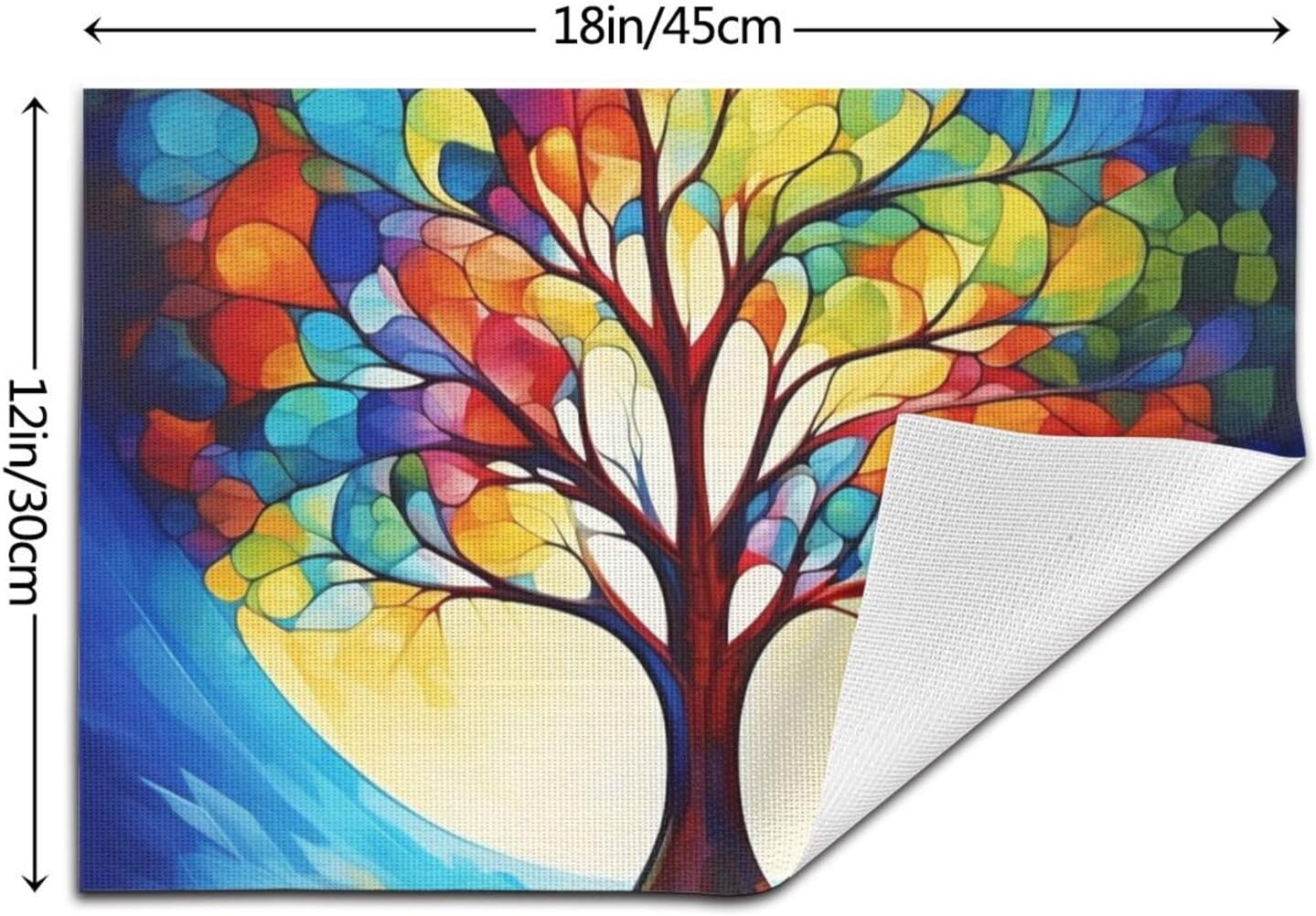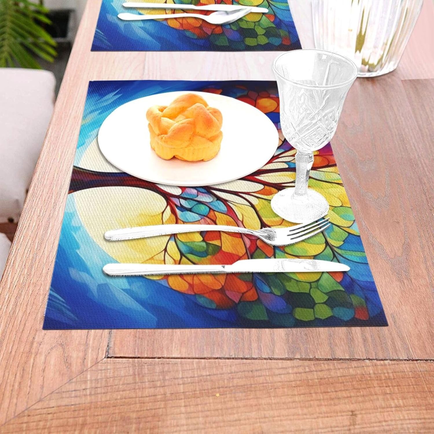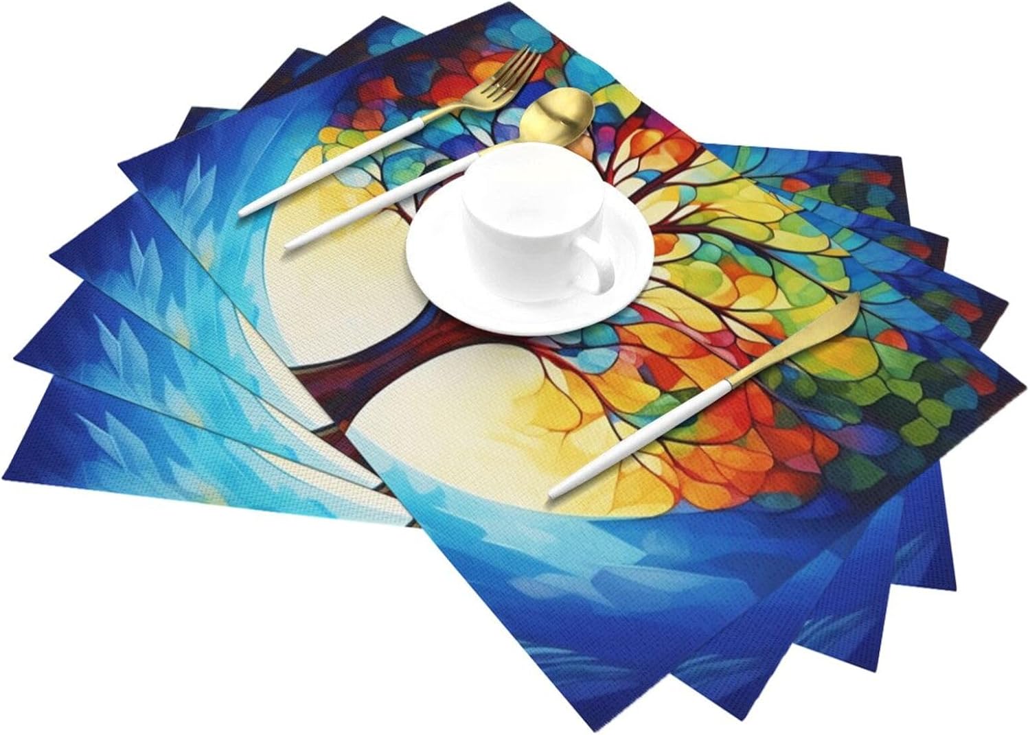 About this itemnFarmhouse Placemats: These meal mats can be easily cleaned by gently wiping with a damp cloth and storing them in a dry place. A set placemats and coasters not only add style to your living room and home but also protect your table. Elevate your table with these, adding both charm and practicality to your dining experience.nElegant and Practical Design: With a luxurious vinyl woven texture, precision cutting, and heat-trimmed edges, our double-sided placemats offer a sophisticated and practical solution. They provide a non-slip surface, resist fading, and are easy to clean, elevating your dining experience.nProtects Your Table: Keep your table safe from scratches and spills with our Colorful Tree of Life Table Mats heat-resistant placemats. They can withstand temperatures up to 176?(80?) and help keep food warm. Add style to your dining setting while ensuring table protection.nPremium Quality and Durability: Our Colorful Tree of Life place mats are crafted from a superior blend of PVC and Polyester, ensuring exceptional quality and long-lasting durability. Its luxurious texture only gets softer with each wash, making it a long-term investment in both comfort and style.nVersatile for Any Occasion: These linen table placemats are not just a table accessory; it’s a statement of elegance. Whether you’re setting up for a casual family dinner or a formal celebration like birthdays, weddings, Fall, Thanksgiving, Christmas, or any celebration, these Kitchen Table Mat elevate any dining experience with its refined simplicity and timeless charm.