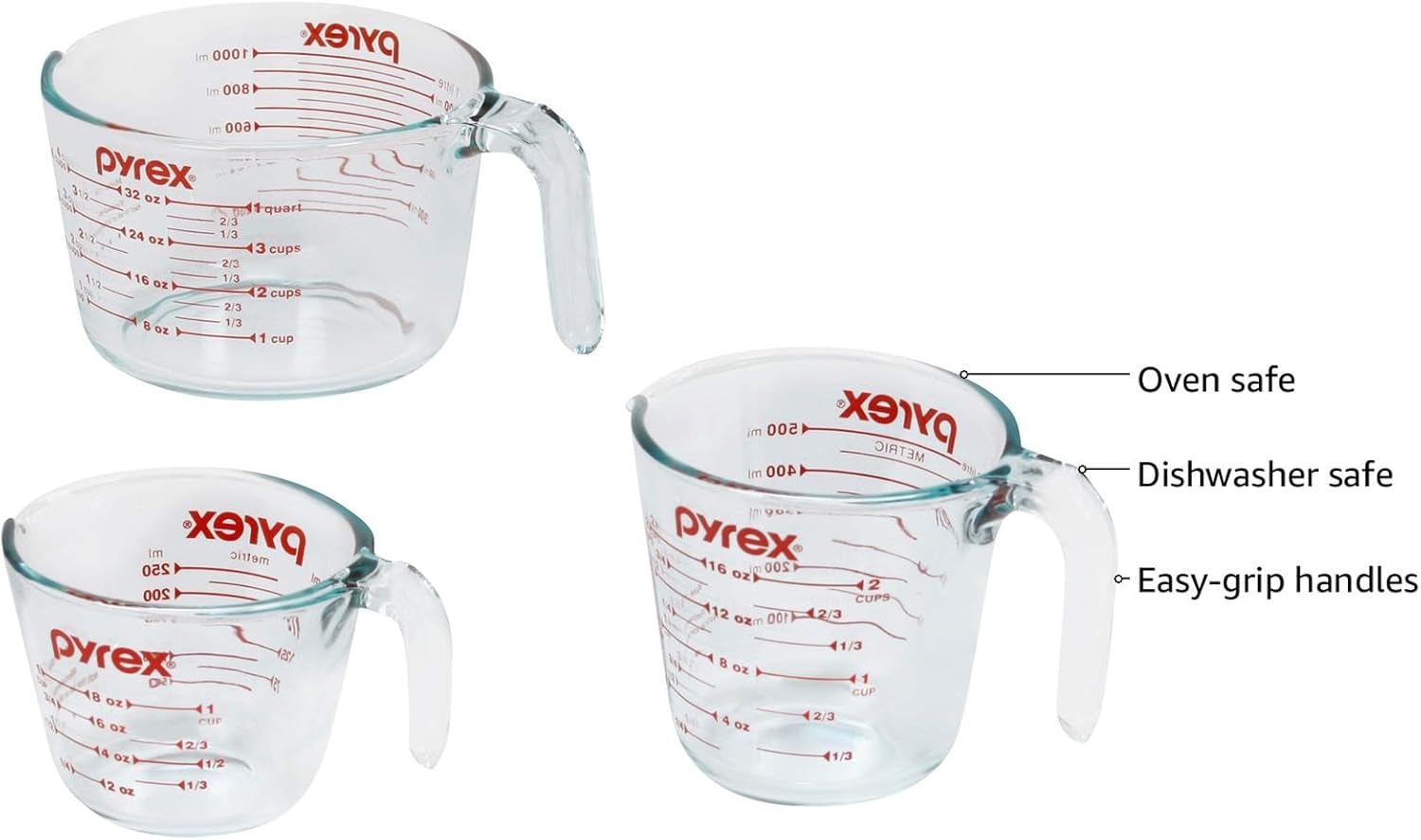 About this itemn3-PIECE: Includes 1-cup, 2-cup, and 4-cup measuring cups that are perfect for baking, cooking, mixing and more. Dimensions for 1 cup: 6” diameter x 4.5” high. Dimensions for 2 cup: 6.5” diameter x 4.5” high. Dimensions for 4 cup: 8” diameter x 6” high.nEASY TO READ: Featuring bold and large measurements in both ounces and milliliters making this effortless to read.nEASY GRIP HANDLES: Adding milk to your cake batter, We got you covered. All Pyrex measuring cups feature a curved spout for non-mess pouring and easy-grip handles for comfort.nMICROWAVABLE: Need to melt a cup of butter for a batch of chocolate cookies, Just throw our Pyrex Measuring Cup in the microwave. High-quality tempered glass is dishwasher, freezer, microwave and preheated oven safe. Non-porous glass is BPA free, non-toxic and wont absorb food odors, flavors, or stains.nPyrex IS THE #1 BRAND OF GLASS PREPWARE*: Loved for generations, experienced cooks and beginners alike have reached for Pyrex brand glassware products, because theyre affordable, durable, and great for all their cooking, serving and storing needs. Source: The NPD Group / Retail Tracking Service, dollars, 12 ME December 2022