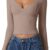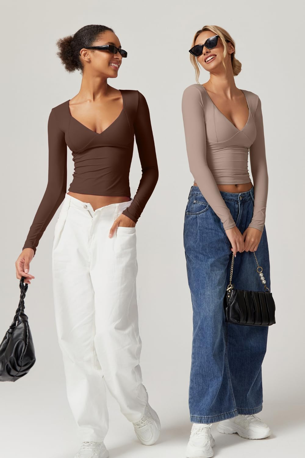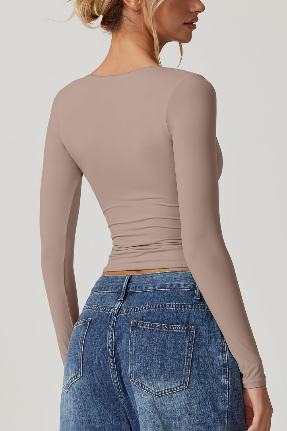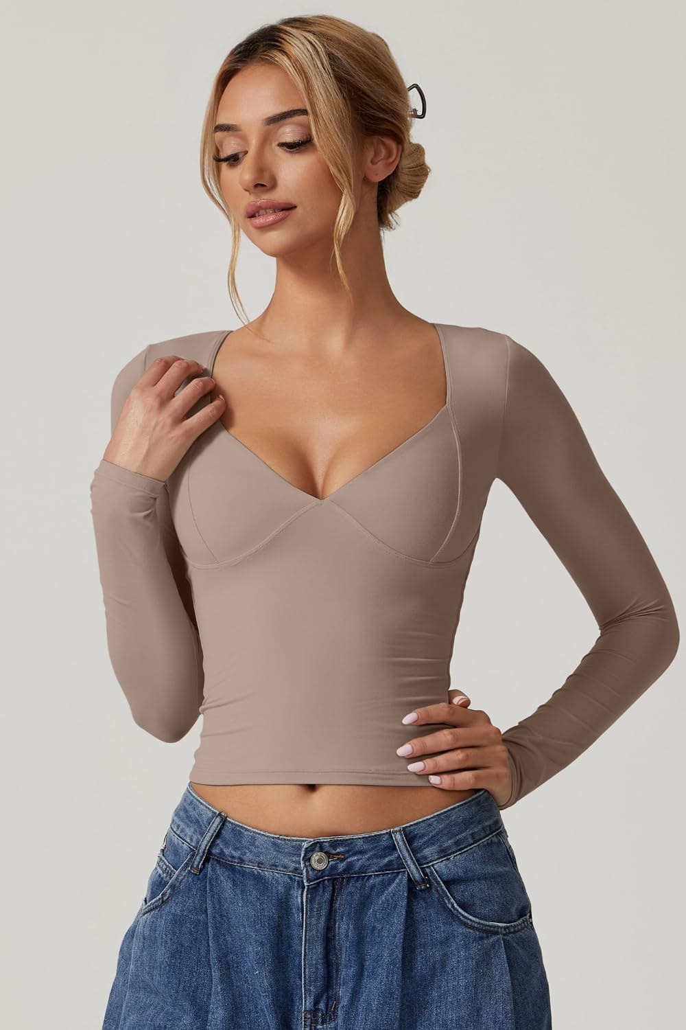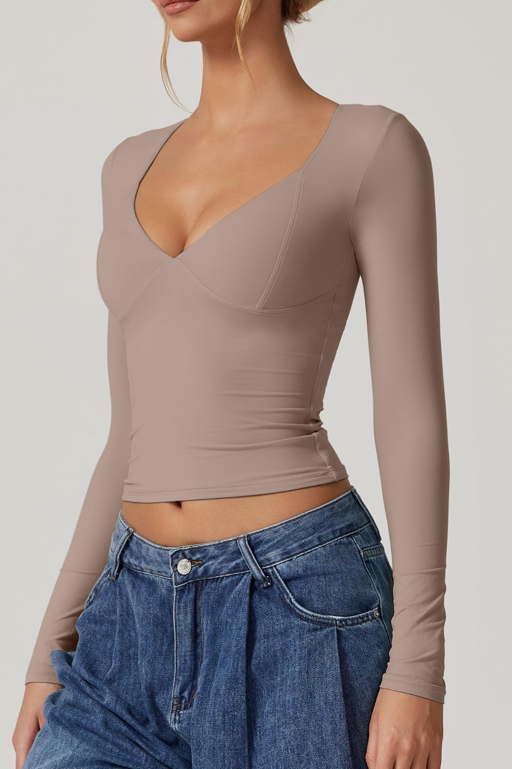 QINSEN Women’s Long Sleeve V Neck T Shirts Double Lined Crop Top Seamed Cup Going Out Tops