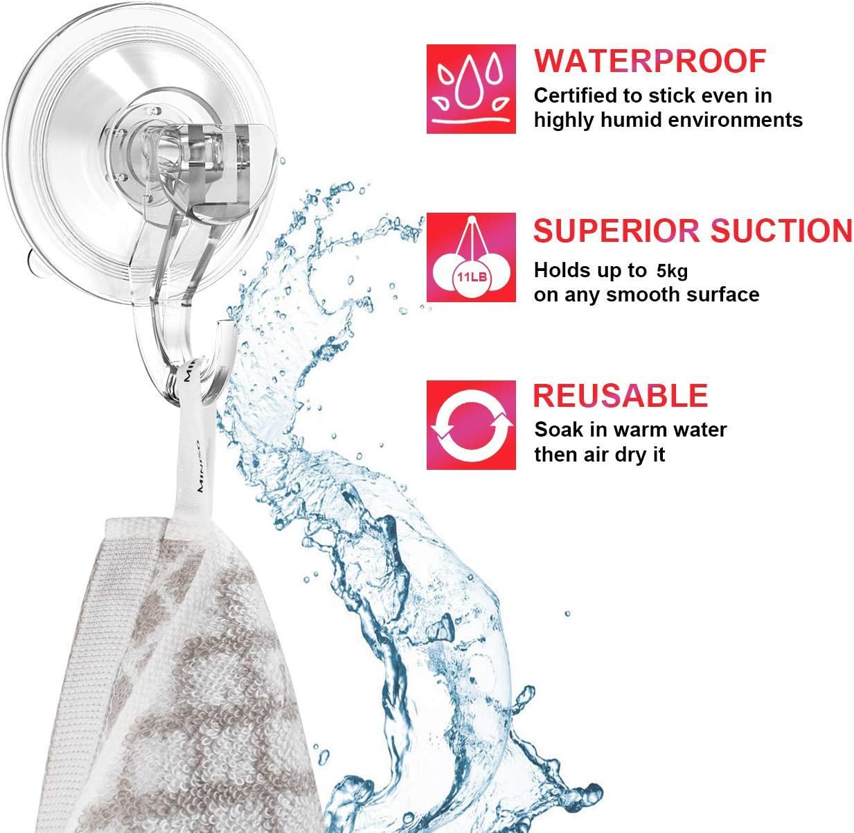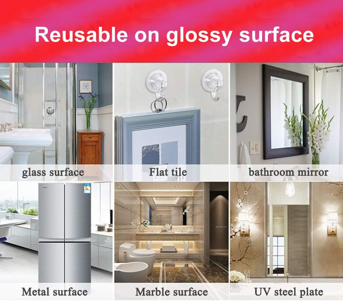 About this itemnStrong and Durable: Our bathroom suction hooks are made of user-friendly silica gel and clear durable plastic. Different from other products, our shower hooks can hold a maximum load of 3 kilograms.nSmooth Wall Hooks: The suction hooks work best on ceramic tiles, glass, mirror, granite, stainless steel or any flat, non-porous airtight surfaces.The diameter of bathroom hooks is 5.8cm that have compact shape, can decoration your home and save more space.nWide Application: Quntis suction cup hooks Ideal for bedrooms, bathrooms, closets, cabinet, kitchen, office, armoire and more places to save space and organize your favorite things in neat.nEasy to Install & Reusable: Just press the hook on smooth and dry surface, squeeze the air out. Adhesive to the wall easily, without any damage on the wall.nInvisible Design: Our sucker hooks is transparent and blend in any decoration style, and will not yellow or lose adhesion over time.