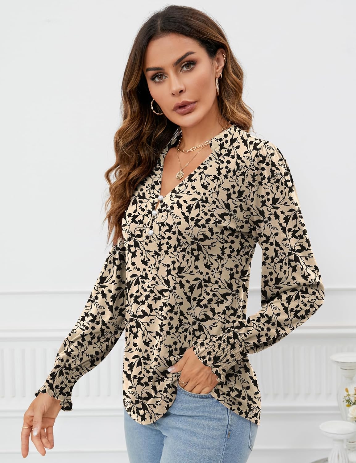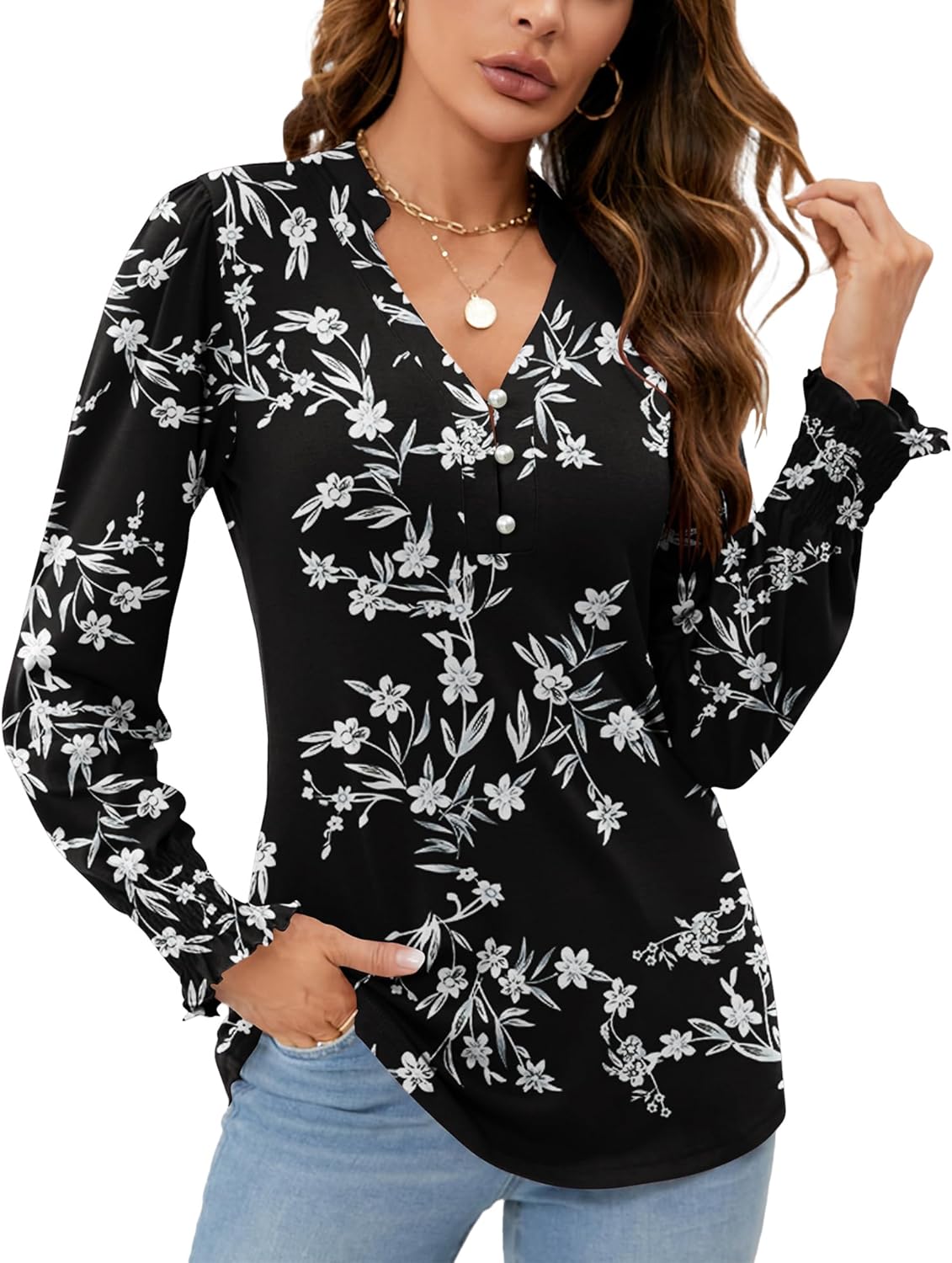Rapbin Womens V Neck Puff Long Sleeve Button Down Tunic Blouses Fall Tops 2024 Ruffle Cuffs Dressy Casual T-Shirts