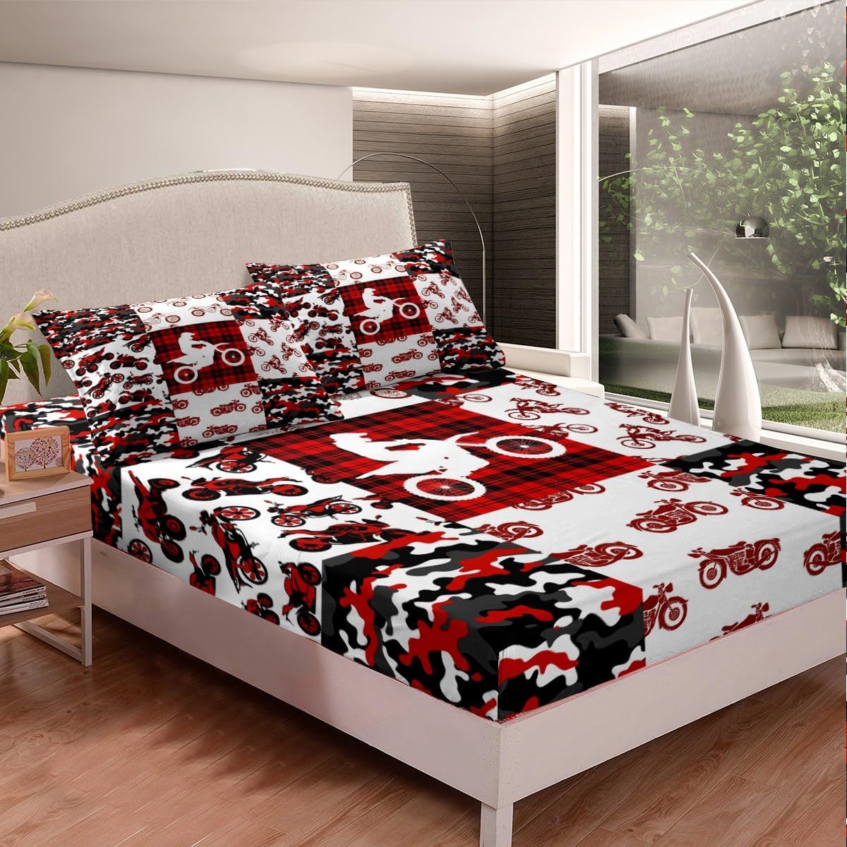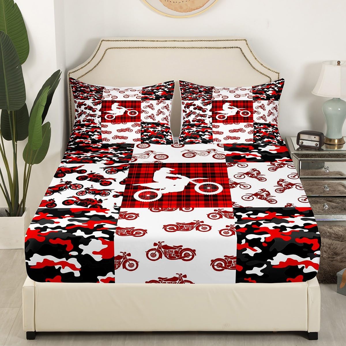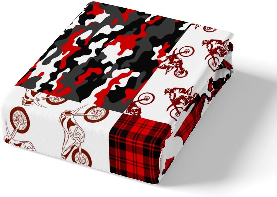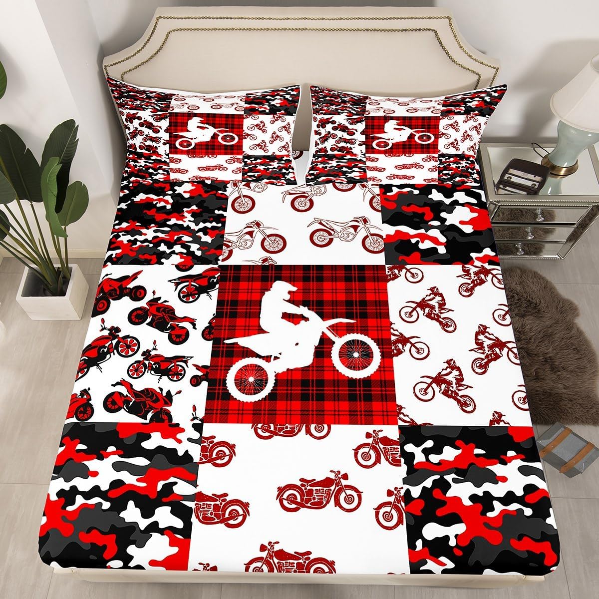 Red Camouflage Grid Geometric Fitted Sheet Queen Size Extreme Sports Theme Bedding Sheet Set,Motorcycle Bed Cover Ultra Soft Breathable Bedding 3 Pcs