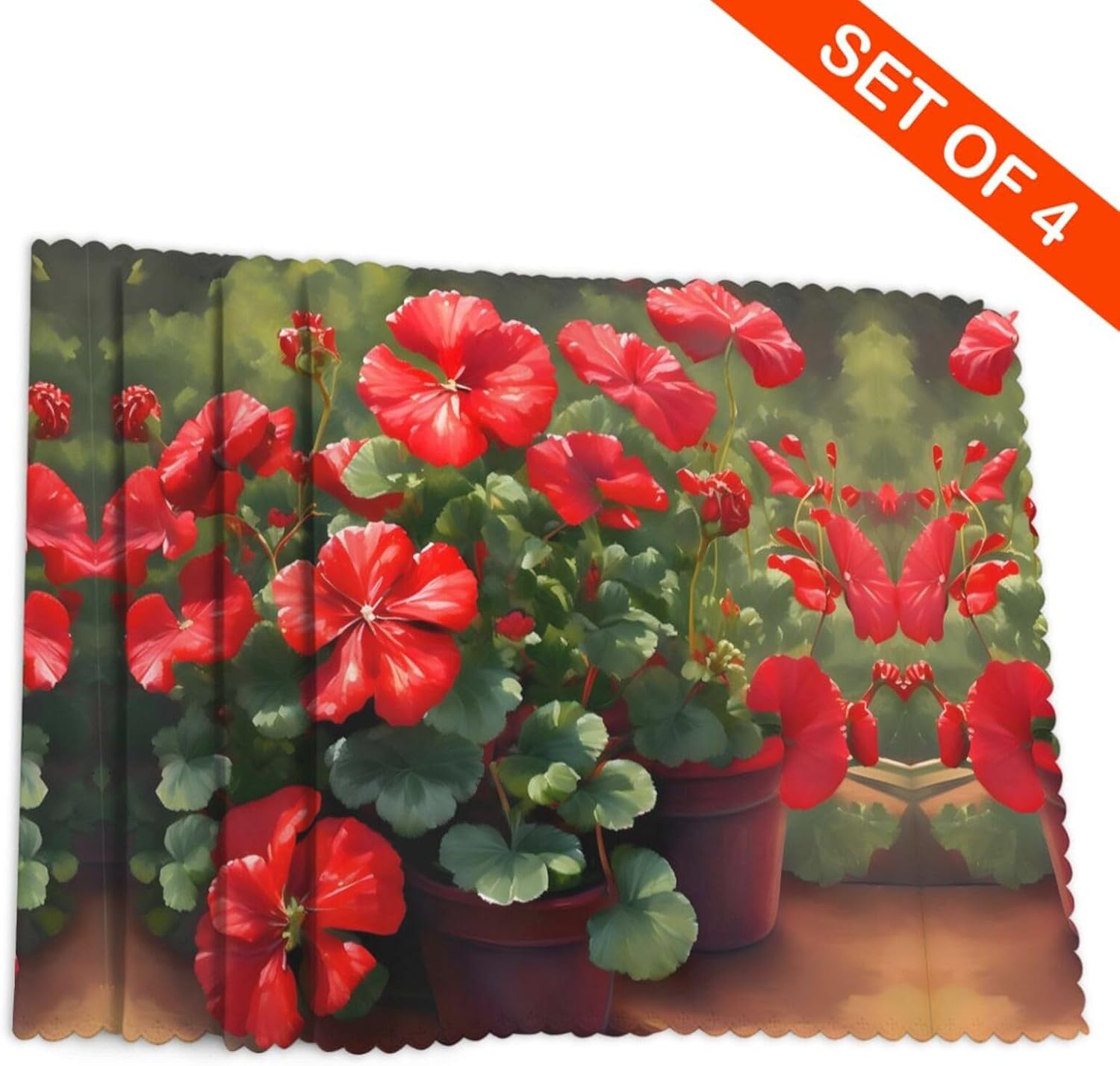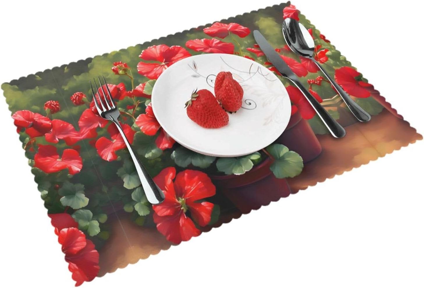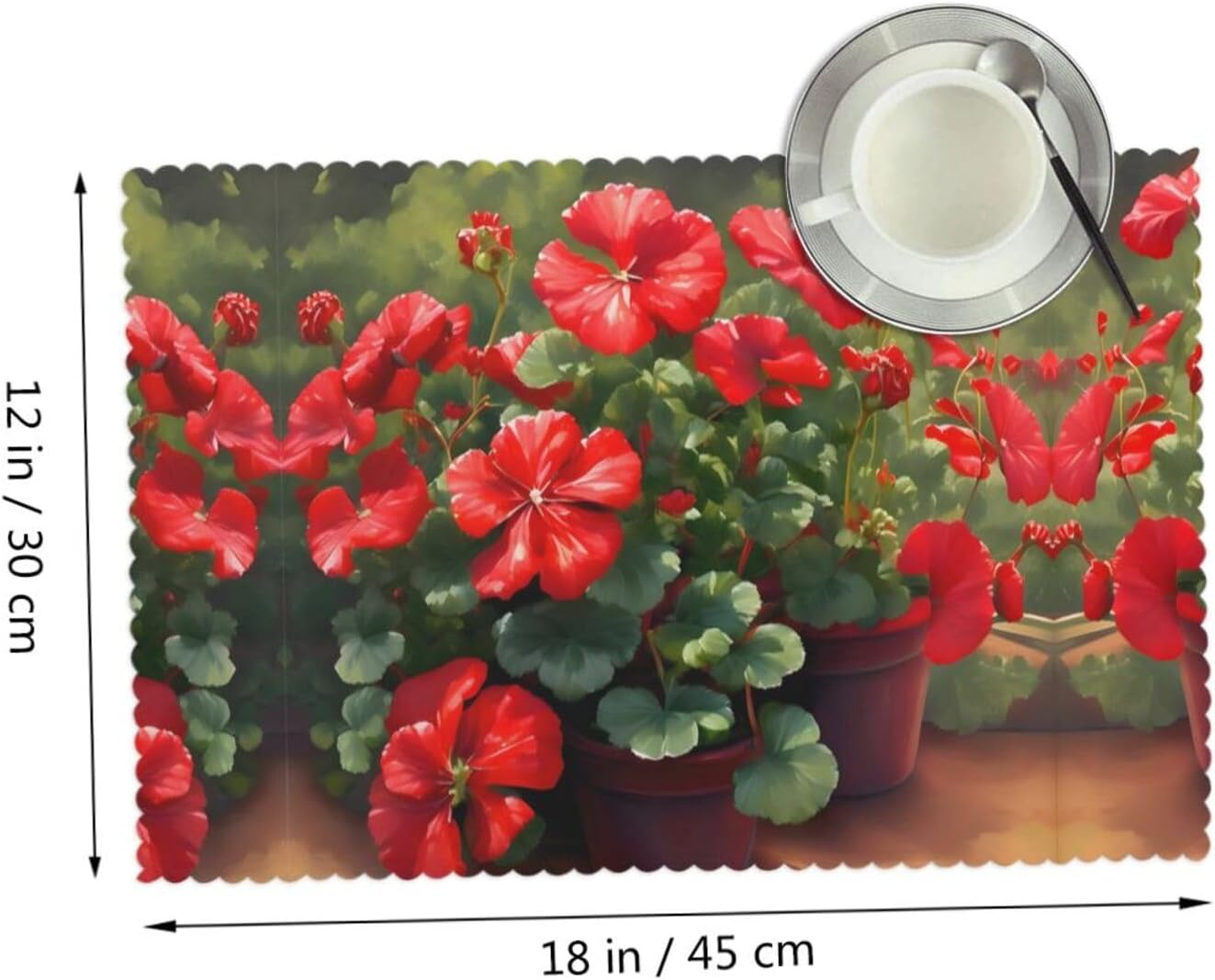 About this itemnRed geraniums 4-piece insulated placemat set: This 4-piece placemat has a beautiful pattern to enhance the dining atmosphere. The polyester material is strong and wrinkle-resistant, protects the tabletop, and buffers the friction of tablewarenHeat-resistant and durable: The placemat is heat-resistant up to 176°F, strong and wear-resistant, and wrinkle-resistant. It can cope with various challenges, protect the tabletop, and is suitable for a variety of occasions.nEasy to store: It can be rolled up or stored flat, with a unique design. It does not take up space, is easy to carry, and can adapt to different scene requirements.nWidely applicable scenarios: Suitable for restaurants and kitchens, can decorate and protect the tabletop. The 4-piece set can be flexibly combined to meet different decoration needs.nNormal temperature cleaning: Cleaning is simple and convenient, just wipe with a damp cloth or rinse with water. The polyester material is waterproof, dries quickly, and is easy to maintain.