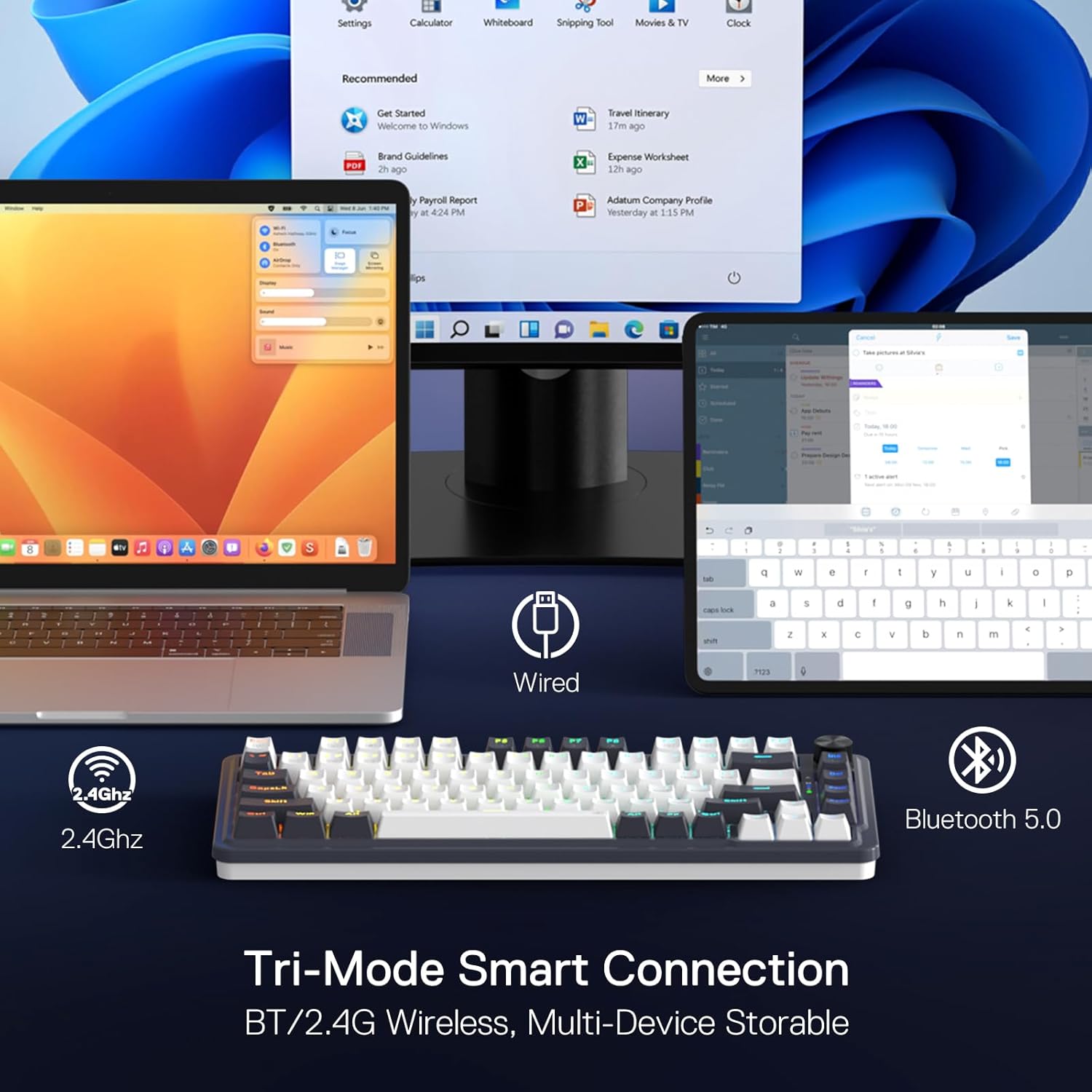 About this itemnCompact 75% Wireless Gaming Keyboard: This Redragon K673 PRO features an innovative 81-key layout, retaining the compactness of a 65% design while adding dedicated function keys for added convenience without the need for FN combos.nAdvanced Connectivity Options: Equipped with tri-mode connectivity (USB-C wired, Bluetooth 3.0/5.0, and 2.4GHz wireless), this keyboard offers versatile connectivity for seamless use across multiple devices.nGasket Design for Noise Reduction: The unique gasket construction, coupled with precision-locked covers and sound-dampening pads, effectively reduces noise resonance, delivering a crisp, clean, and softer typing experience.nDedicated Control Knob: A convenient control knob allows easy access to backlight brightness adjustment and media controls (volume, play/pause, track switching), providing a user-friendly experience without sacrificing space.