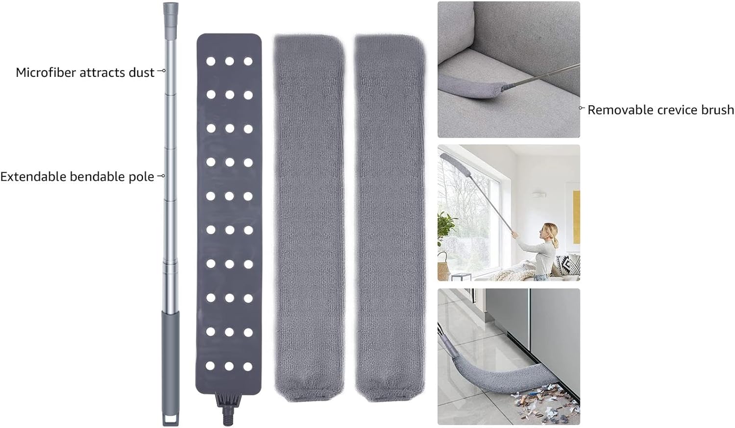 About this itemn?Make Housework Easier?: Make Housework Easier- Featuring innovative split fiber technology, the duster becomes electrostatically charged as you use it, attracting dust and hairs with ease. Use it wet or dry to get your house spick-and-span. Light-weight, sturdy and durable Microfiber Long Duster with Telescoping Pole with long handle helps you reach into corners, gap, bedside, furniture bottom and narrow spaces that hard to clean, convenient for you to clean different places.n?Long Duster with Telescoping Pole?: The duster handle is made of heavy duty stainless steel, can be adjusted freely from 31 inches to 61 inches according to your actual needs, help you clean under appliance easily. The microfiber cloth cover let you sweep ash and dust easier!We have 2 packs microfiber cloth cover,soft and easy to clean and remove dust and hair.n?Used in Multiple Place?: Under Appliance Duster Easier Dusting and Cleaner Home.The retractable gap dust cleaner cleaning brush is suitable for bedrooms, living rooms, kitchens, bathrooms, laundries and garages. Its easy to clean the bed bottom, sofa gap, air conditioning, ceiling, floor, shower, tile, carpet, interior decoration, sinks, and bathtubs with this retractable gap dust.n?Reusable and Easy to Clean?: We have two packs Microfiber Cloth Covers,You can use one for dry wiping, one for wet wiping, or for change and wash.You can take off the microfiber cloth cover and wash it with water directly, then place in ventilated place to dry and make the fiber brush to be natural fluffy so that you can reuse the gap duster. The gap duster of the tail has a loop design, which is easy to store and saves space.n?high-quality service?: If there is any problem with our cleaning supplies, please contact us and we will solve your problem. And any suggestion or request please feel free to contact us in anytime that we can try our best to reply in short time.